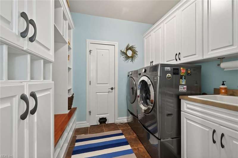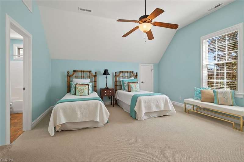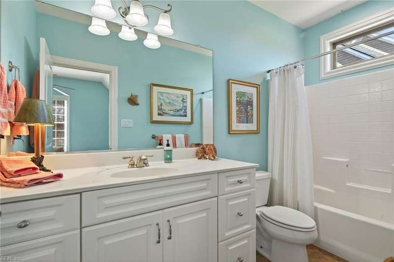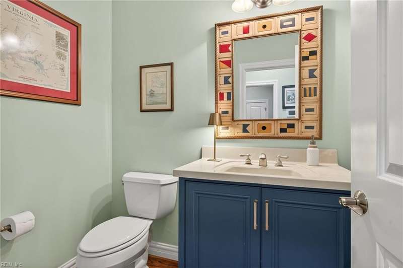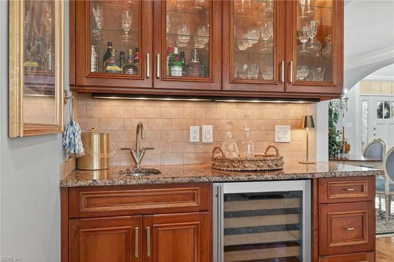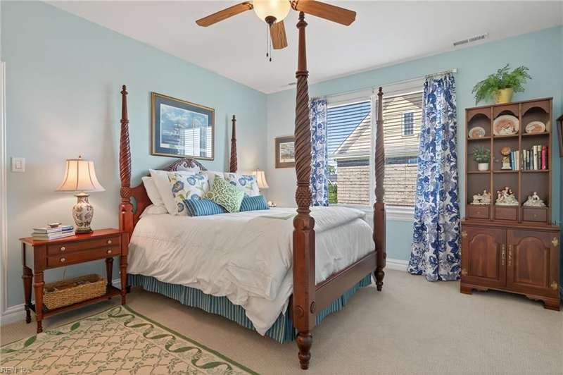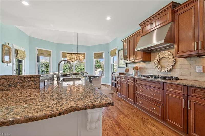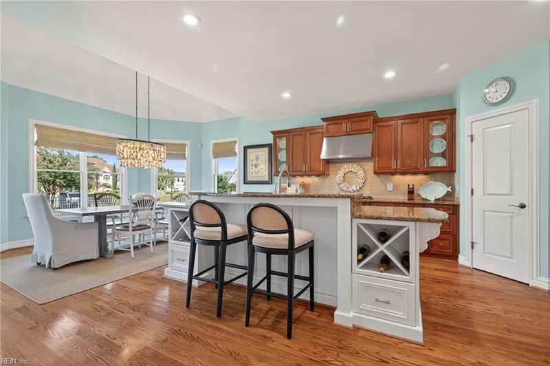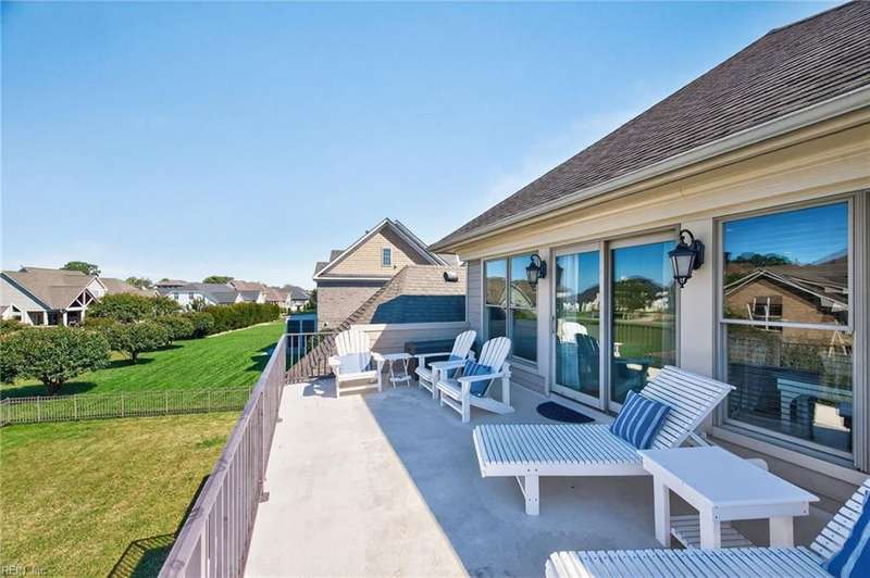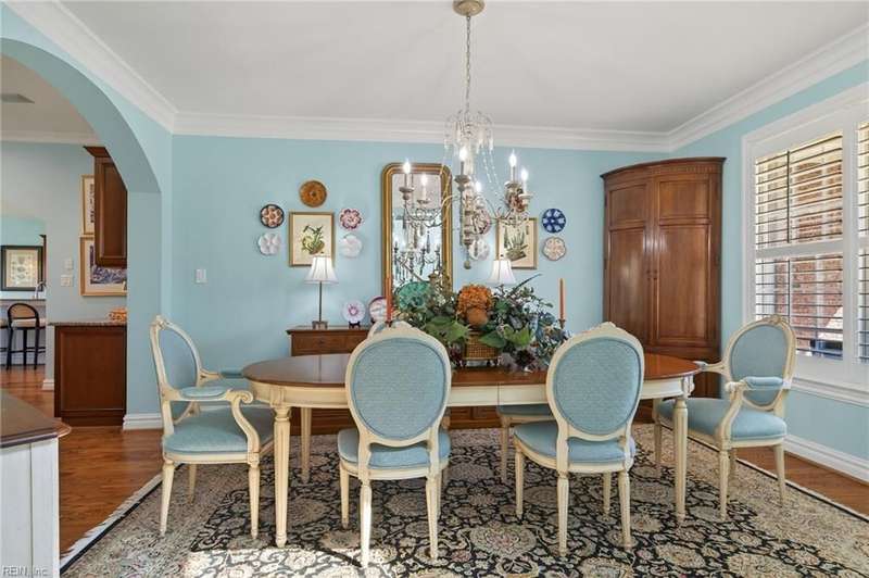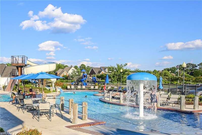 Stately brick and stone home in The Riverfront featuring timeless design, elegant finishes, and exceptional craftsmanship. Grand two-story foyer opens to refined living spaces with hardwood floors, updated lighting, & plantation shutters. The gourmet kitchen includes granite countertops, a freshly painted island, corner pantry, and premium stainless-steel appliances, flowing into a warm living room with gas fireplace and custom built-ins. The first-floor primary suite offers a tray ceiling, fireplace, dual walk-in closets, & ensuite bath w/new quartz countertops, oversized double shower, & jetted tub. Ideal for entertaining with a wet bar, screened porch, and an upstairs rec room leading to a west-facing deck for sunset views. Custom millwork, crown molding, arched doorways, and abundant storage throughout. Beautifully maintained landscaping, minutes from the park and pier on the Nansemond River, w/access to golf, trails, & resort-style community amenities. 1 year 2-10 Home Warranty