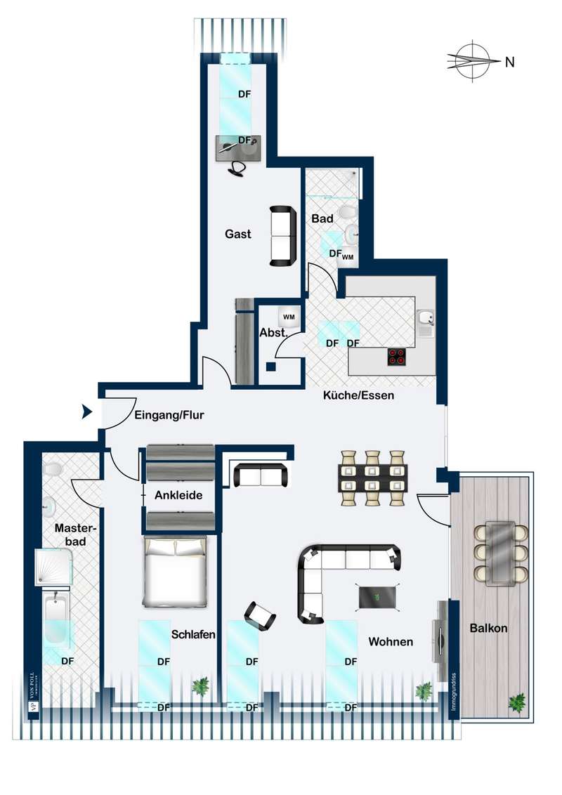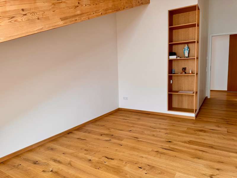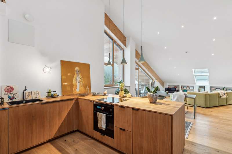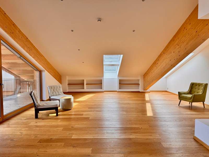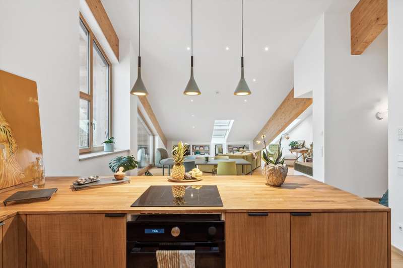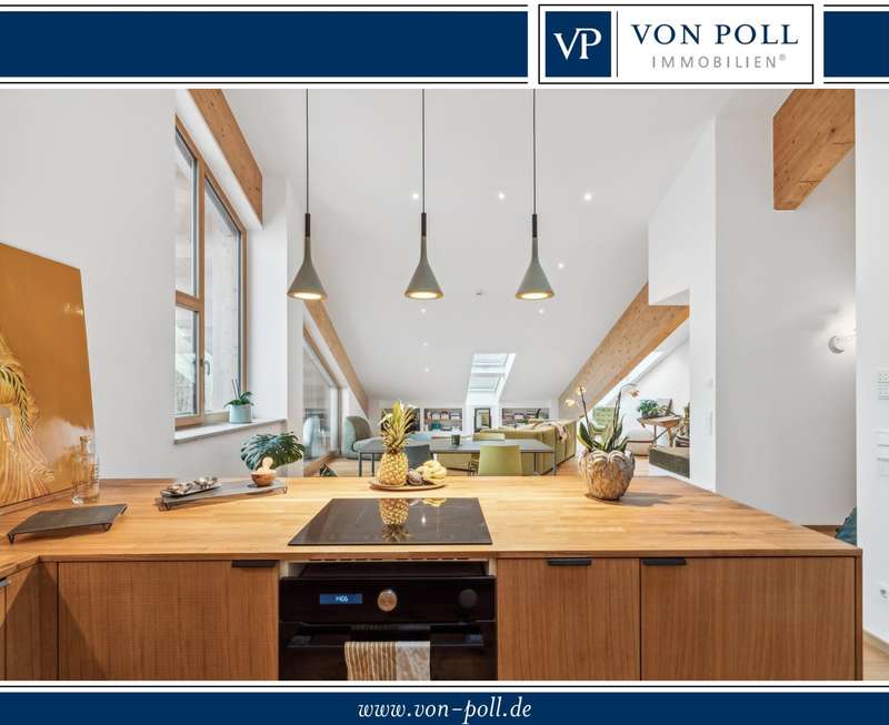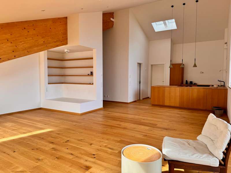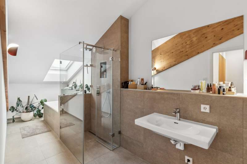 This very attractive top floor apartment is located in a modern apartment building and impresses with its upscale furnishings and generous living space of approx. 136.7 m². The property is heated by the environmentally friendly heating technology of a combined heat and power unit and offers all the comforts of an apartment in mint condition. The apartment has a total of three rooms, including two bedrooms and a spacious living room with a cozy retreat that offers open access to a large balcony. These generously proportioned rooms have been thoughtfully designed and offer a pleasant living atmosphere. The large balcony invites you to spend relaxing hours and is perfect for enjoying the sun. The two bathrooms in the apartment meet the highest standards. One of the bathrooms is equipped with a bathtub and shower, while the other has a shower and space for your washing machine. A special highlight is the opportunity to watch the open sky from the bathtub - a relaxing experience after a long day. The high-quality fittings and tasteful design underline the upscale furnishings of the apartment. The kitchen is open-plan and offers plenty of space next to the dining area. Modern electrical appliances and ample work surfaces make preparing meals a pleasure. The large window fronts not only allow plenty of daylight into the rooms, but also offer a pleasant view and access to the balcony. The apartment comes with two underground parking spaces, which are included in the purchase price. These offer convenient protection and safeguard the value of your vehicle. There is also ample parking space for visitors. A separate cellar room provides additional storage space and organizes the storage of items not needed on a daily basis. For cyclists, there is a separate bicycle room at the house. With its modern architecture and carefully designed outdoor area, the residential complex offers an appealing environment. Thoughtful details, such as skylights, ensure optimal lighting and underline the exclusive character of the apartment. This property not only offers a home, but also a functional room layout that provides singles, couples and small families with the best conditions for a comfortable living experience. Feel free to contact us for more information or to arrange a personal viewing appointment. Take the opportunity to see the benefits of this attractive top-floor apartment for yourself.