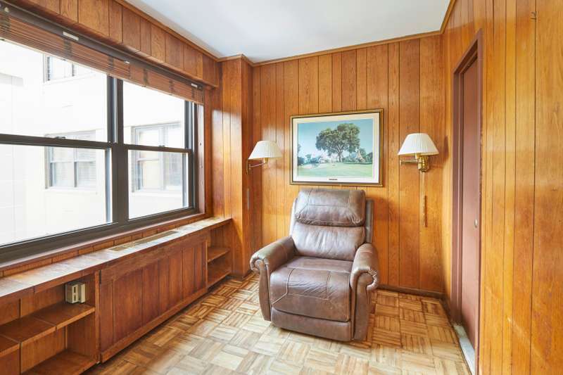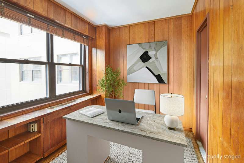 The renovated eat in kitchen is enormous, with service entrance and washer/dryer. Most unique in this kitchen is a windowed breakfast room with suburban proportions; it quickly becomes a popular spot. Adjacent is a fourth bedroom, currently used as a wood paneled home office, with ensuite bath. This room can also be opened to the kitchen to create a huge country kitchen with full laundry room or it can be a cozy guest bedroom or staff room.