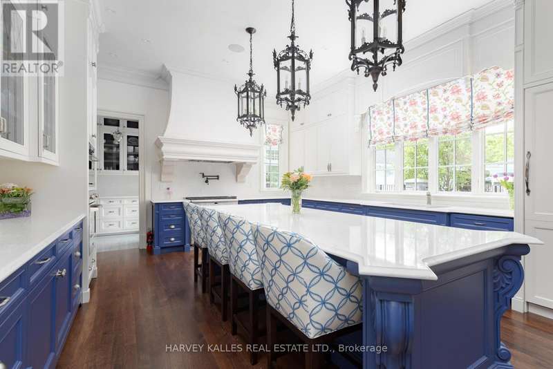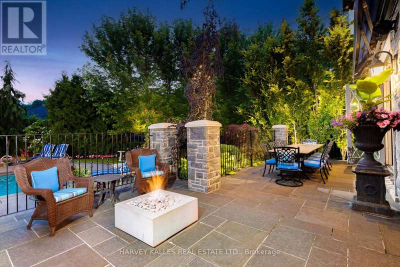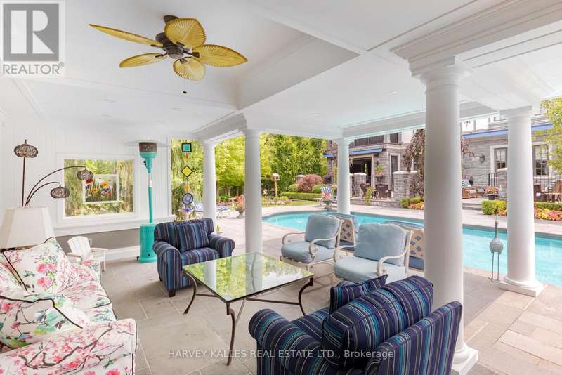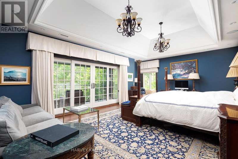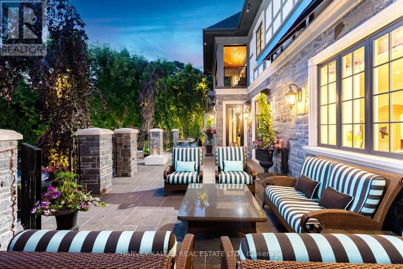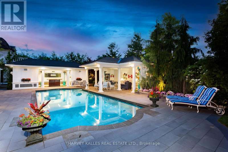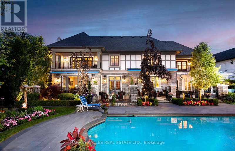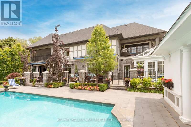From vision to fruition, 8 Swansdown Drive stands as a truly unique and masterfully built residence. Every element was carefully chosen with intention, resulting in a home that exudes sophistication, comfort, and timeless beauty.Set on a secluded, lush lot in one of Torontos most prestigious neighbourhoods, the property offers unmatched privacy. A grand circular heated driveway welcomes you and your guests with ease, while a three-car garage securely houses your most prized possessions. The striking freestanding waterfall and manicured gardens create an instant sense of calm and retreat from the city.Inside, the double solid-oak doors open to a breathtaking two-storey foyer with soaring ceilings and open sightlines to the stunning rear gardens. The elegant living room features a wood-burning fireplace and retractable Floridian-style glass doors that open to a stone patio for al fresco dining. The sun-drenched kitchen and breakfast room overlook the lush grounds, while the formal dining room connects via a butlers pantry.The garden solarium is perfect for nurturing plants year-round. Additional main floor highlights include a cheerful office, art studio with water access, and a one-of-a-kind octagonal library with handcrafted detailing, a ceiling medallion, and hidden staircase.The second floor is accessed by a sweeping staircase or a wrought-iron Parisian-style elevator. A skylit hallway leads to four generous bedrooms, each with its own ensuite. A separate two-piece bath, laundry room, and pet spa complete this level.The lower level offers an impressive array of spaces: gym, yoga room, sauna, rec room, large storage, study, soundproof music room, guest suite, and more.Outdoors, enjoy over a million dollars in landscaping, a chlorine pool, fire pit, two covered pavilions (one with bar and bath), and stone pathways weaving through a magical setting.A rare offering. Welcome home. (id:6370)