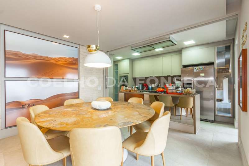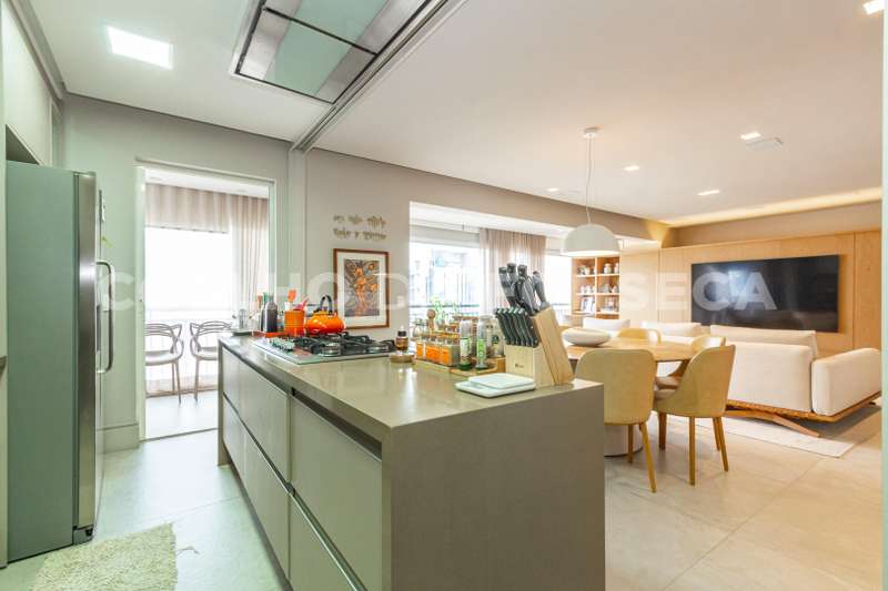 O imóvel possui amplo living com vários ambientes e cozinha gourmet integrada, varanda com churrasqueira; A configuração é de 2 suítes com varanda, sendo a suíte master com amplo closet.
