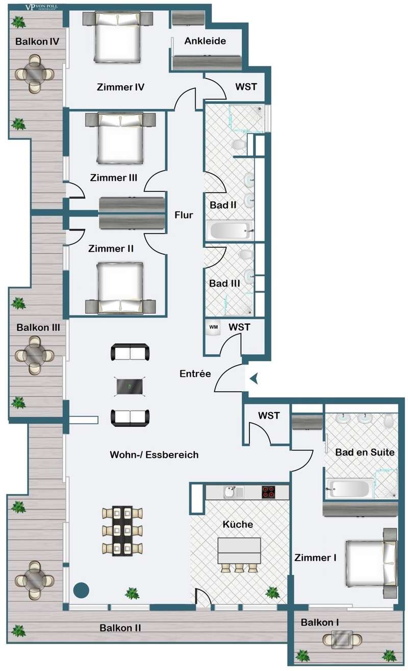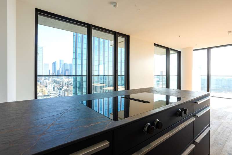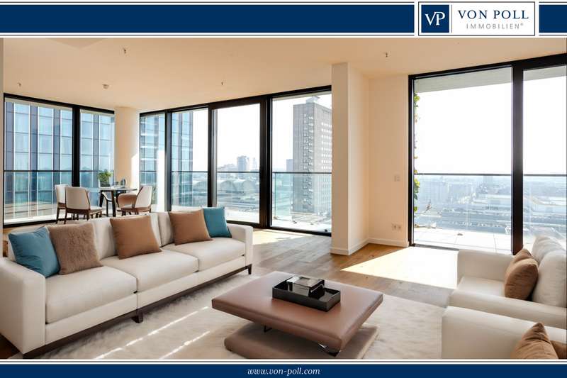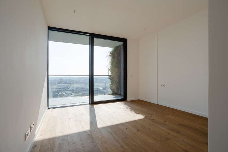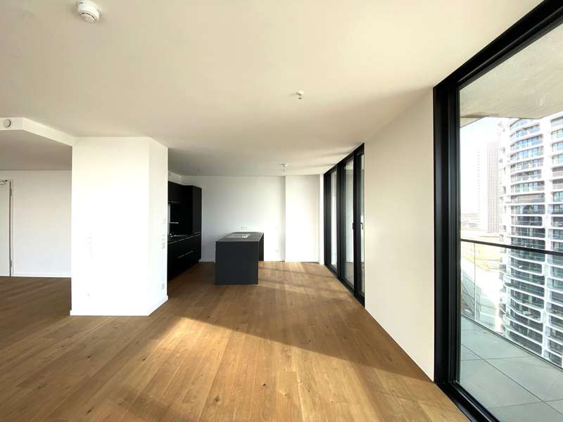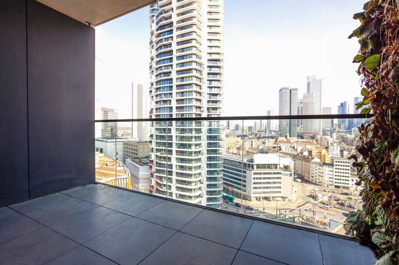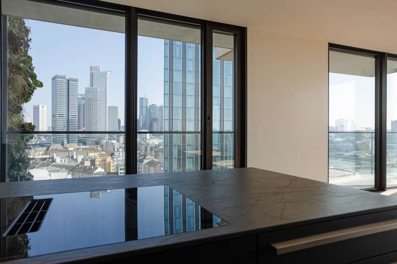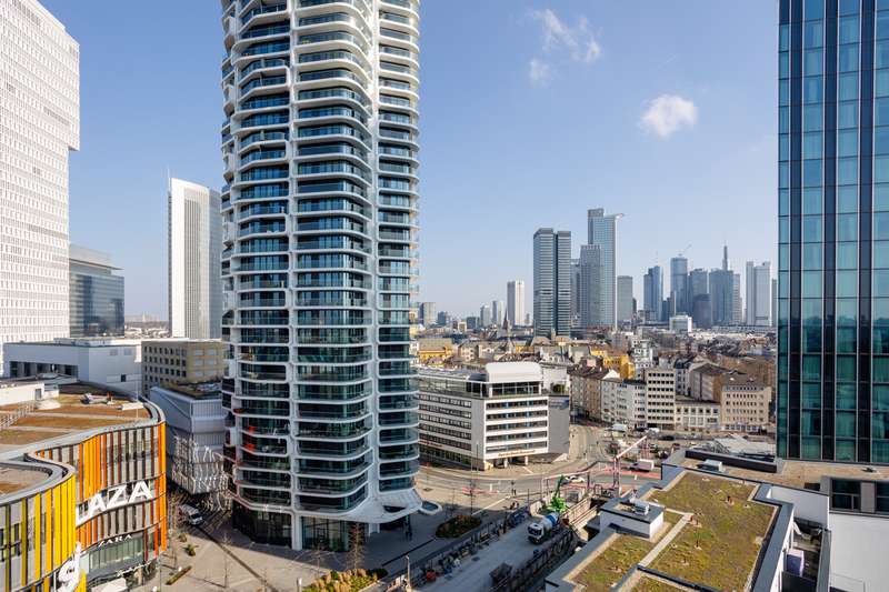 This premium apartment is located on the 14th floor of EDEN, one of the tallest residential towers with a green façade in Europe. The transparent architecture with vertical greenery and floor-to-ceiling panoramic windows offer airy living and spectacular views of the skyline and the south of Frankfurt. The elevator takes you to the 14th floor. You enter the apartment via a modern, open entrance hall. The impressive living area with a view over Frankfurt and the open-plan designer kitchen with cooking island, in elegant, dark materials, present themselves with plenty of light and glass. A large sliding door leads to the balcony with surrounding glass balustrade and a magnificent view over Frankfurt and the skyline! The master bedroom with en-suite bathroom and three further bedrooms/study rooms, each with access to the balcony, offer state-of-the-art living space. A total of two modern bathrooms are assigned to the three rooms. One of the rooms has a walk-in dressing room. The inviting, prestigious lobby and the in-house gym are located on the first floor of the building. The 24-hour concierge service is another highlight of this elegant apartment. Two underground parking spaces included round off this exceptional offer. The apartment is ideal for couples as well as for a family with two to three children who appreciate urban living in EDEN as a green oasis combined with maximum living comfort in the heart of the city.