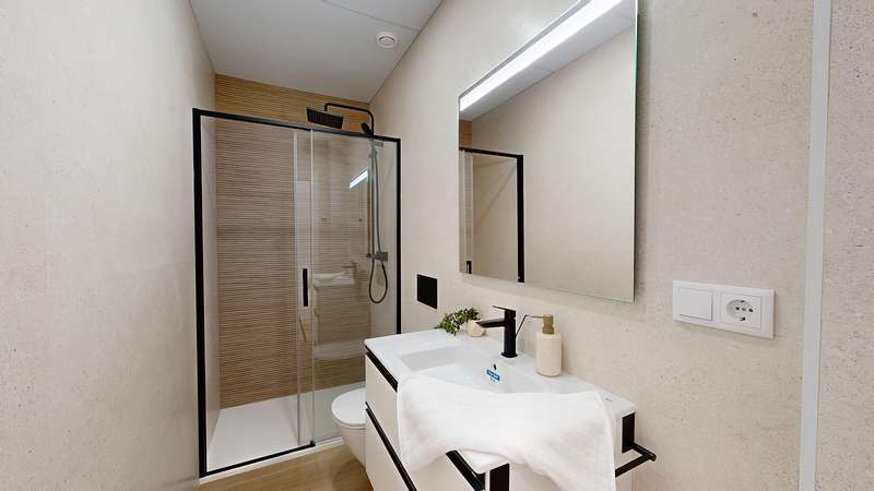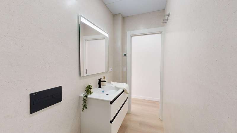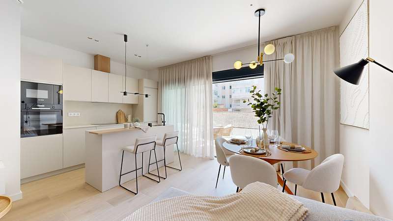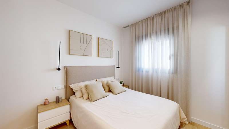 Inside these modern apartments for sale in Guardamar del Segura, Spain, you have three spacious double bedrooms all with fitted wardrobes, one of which has an en-suite bathroom with a walk-in shower, an equipped open-plan kitchen and a dining area, and a sizable living area with large windows that lead out to the sun terrace and allow in ample natural light.