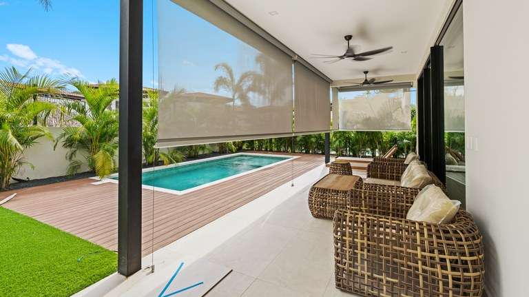From the moment you arrive, the villa's modern architecture and lush tropical landscaping create an inviting sense of arrival. Step inside to discover a spacious open-concept layout where floor-to-ceiling glass sliding doors merge indoor comfort with outdoor serenity. The main level features a beautifully appointed living room, a gourmet kitchen with high-end finishes, and a dining space that flows naturally to the covered terrace. Just beyond, a private pool and custom mini golf area await, providing the ideal setting for fun, relaxation, and entertainment.