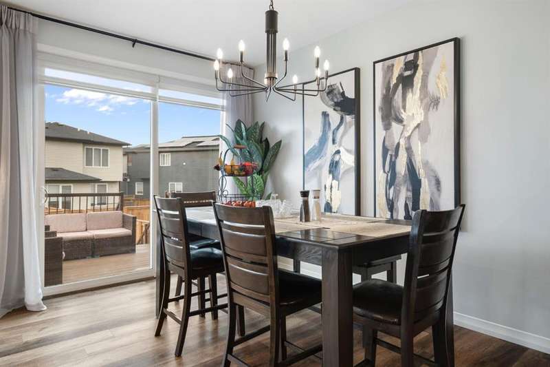 Welcome to this beautifully appointed 2-storey home with a legal basement suite in the vibrant community of Cornerstone perfect for families, multi-generational living, or those looking for an income opportunity. Offering over 3,300 sq ft of living space, this home combines thoughtful design, stylish upgrades, and energy-efficient features for a truly exceptional lifestyle. From the moment you step inside, you’re greeted by a bright, open main level with soaring ceilings and large windows that fill the space with natural light. The executive kitchen is the heart of the home, showcasing a massive upgraded quartz island, premium cabinetry, stainless steel appliances, and a walk-through pantry. Whether you’re hosting family dinners or casual get-togethers, this kitchen is designed for connection. The main floor also features a bedroom with full bath, ideal for guests or extended family, plus easy access to the maintenance-free composite deck perfect for summer BBQs and quiet evenings outdoors. Upstairs, you’ll find three spacious bedrooms, including a serene primary retreat with a walk-in closet and spa-inspired ensuite. A generous den offers the perfect spot for movie nights or playtime, while the laundry room adds convenience to daily life. The legal basement suite is a standout feature, complete with its own private entrance, open kitchen and living area, 2 bedrooms, full bath, and separate laundry, ideal for generating rental income or offering comfortable space for extended family. This home is loaded with builder-installed upgrades, including centralized air conditioning, triple-pane windows with low-e and argon fill, a 220-volt/30-amp electric vehicle charging outlet in the garage, an HRV (heat recovery ventilation) system, and a UV-C ultraviolet air purification system installed in the furnace. Additional features like builder-installed solar panels, a Navien tankless water heater, and a centralized water softener help you save on utilities while enjoying modern comfort. Located in the family-friendly community of Cornerstone, you’re close to parks, pathways, schools, shopping, and have easy access to major routes, making every day effortless and enjoyable. You don’t want to miss your chance to see this one!