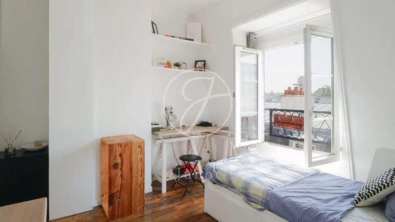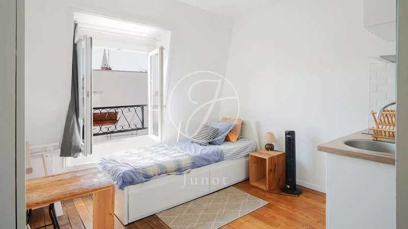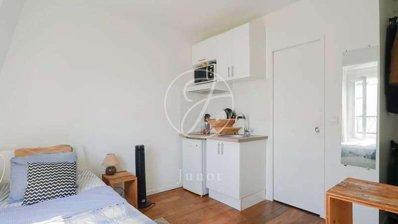 Ideally located, this charming studio of 12.01sqm Carrez law and 12.69sqm floor space, with an optimized layout, is located on the sixth and top floor of a beautiful old building, accessible by stairs. Completely renovated, it consists of a bright living room opening onto a fully equipped kitchen area, and a sleeping area. The studio, perfectly quiet, also has a shower room and a proper macerator-type toilet. This property will seduce with its sought-after location, its layout without wasting space, its charm, its calm and its beautiful luminosity.