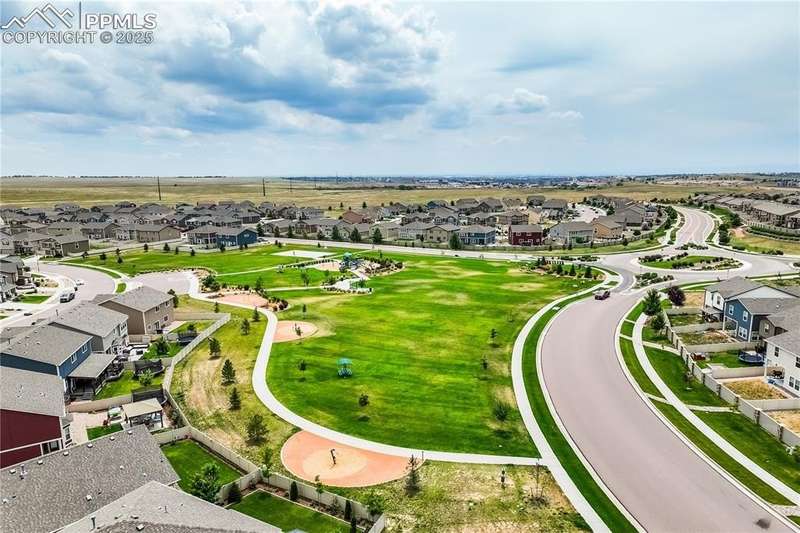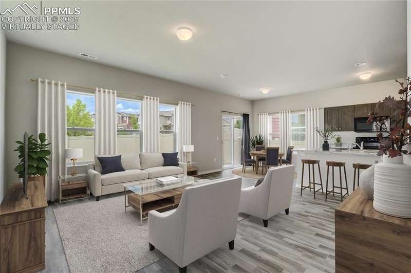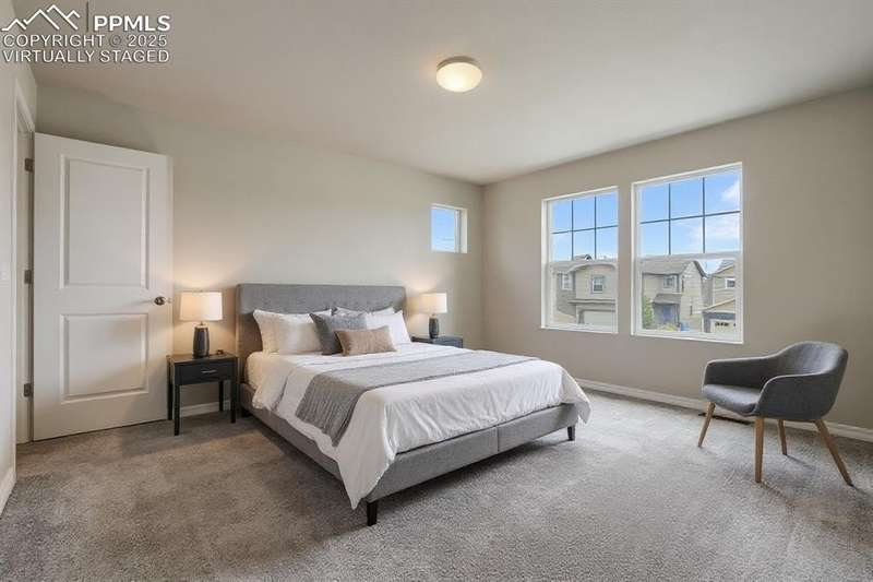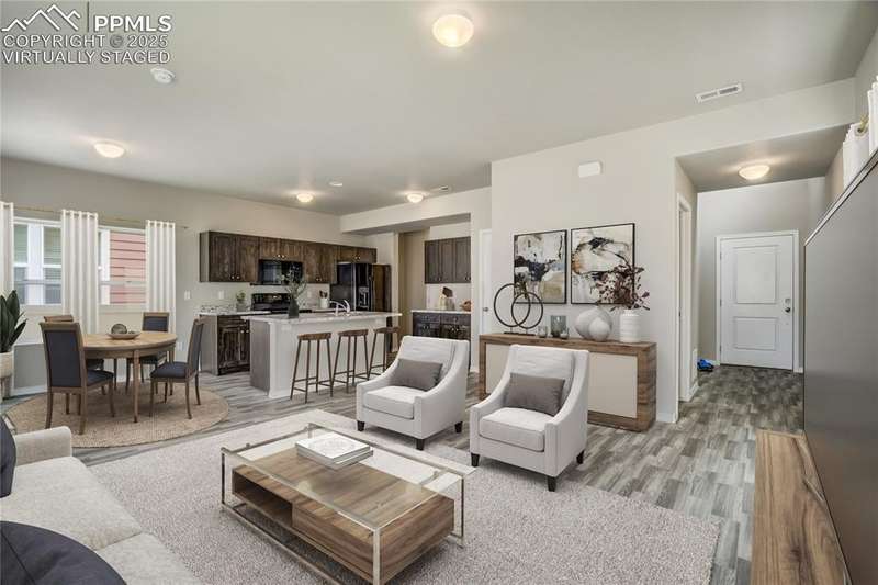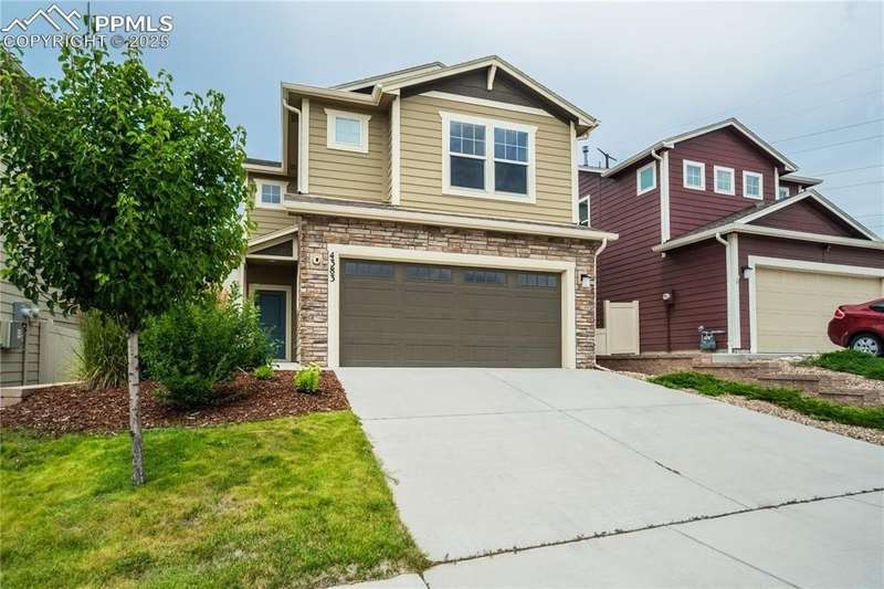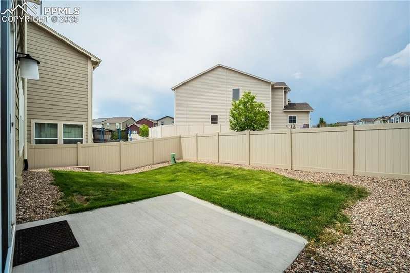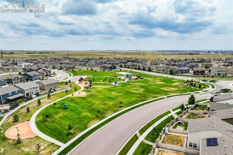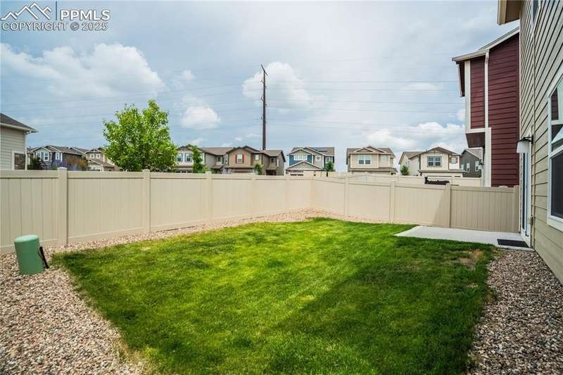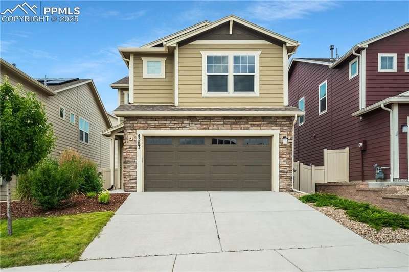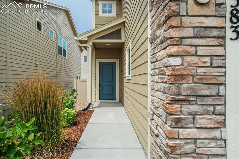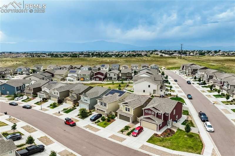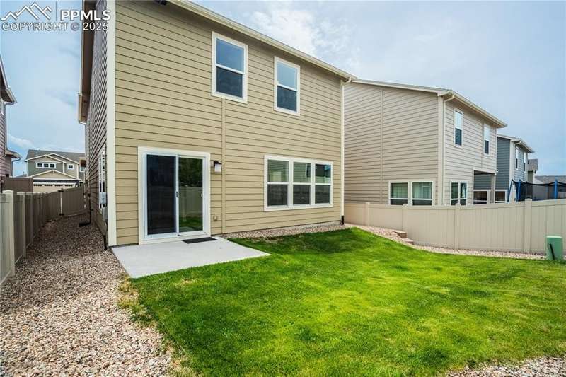 Set in The Enclaves at Mountain Vista, this 2021-built home offers convenient access to parks, schools, shopping, restaurants, & the Powers corridor—plus a direct route to Peterson SFB, Schriever, & Fort Carson. The open-concept two-story layout begins with a spacious main level that flows seamlessly from the great room into the eat-in kitchen. Durable wood laminate flooring runs throughout the entry & main living areas, while a half bath is tucked privately off to the side. The kitchen features black appliances, laminate countertops, a center island, & walk-in pantry, with a sliding glass door that opens directly to the fenced backyard—perfect for easy indoor-outdoor living. Upstairs, all three bedrooms are thoughtfully situated around a central loft that provides flexible bonus space for work, play, or entertainment. The primary suite includes a walk-in closet with window, abundant natural light, & private bath w/ a freestanding shower. Two additional bedrooms share a full hall bath, & the upper-level laundry room provides added convenience. Additional perks include central A/C, high-speed internet availability, energy-efficient vinyl windows, & an attached two-car garage. Low-maintenance landscaping, rear vinyl fencing, & no rear neighbors round out the exterior—all within a covenant-controlled metro district that handles trash & enforcement.