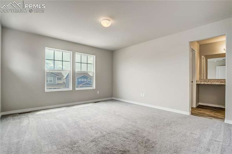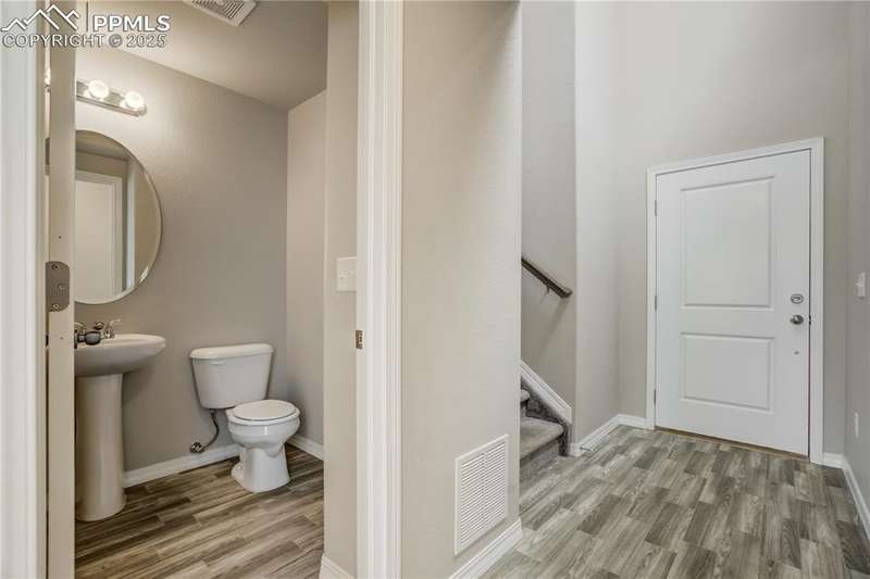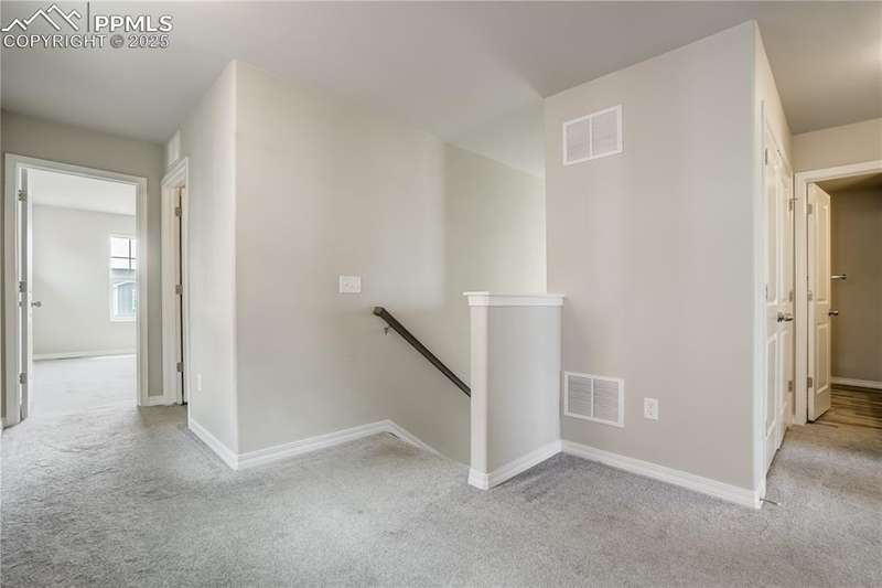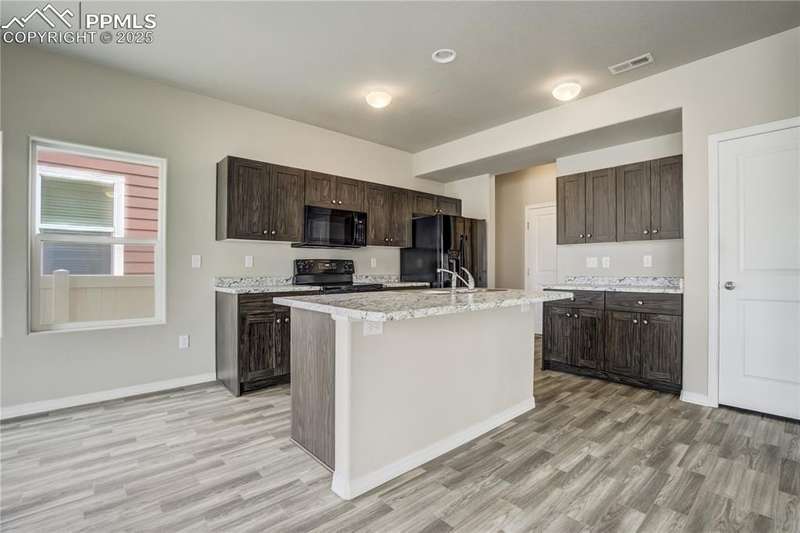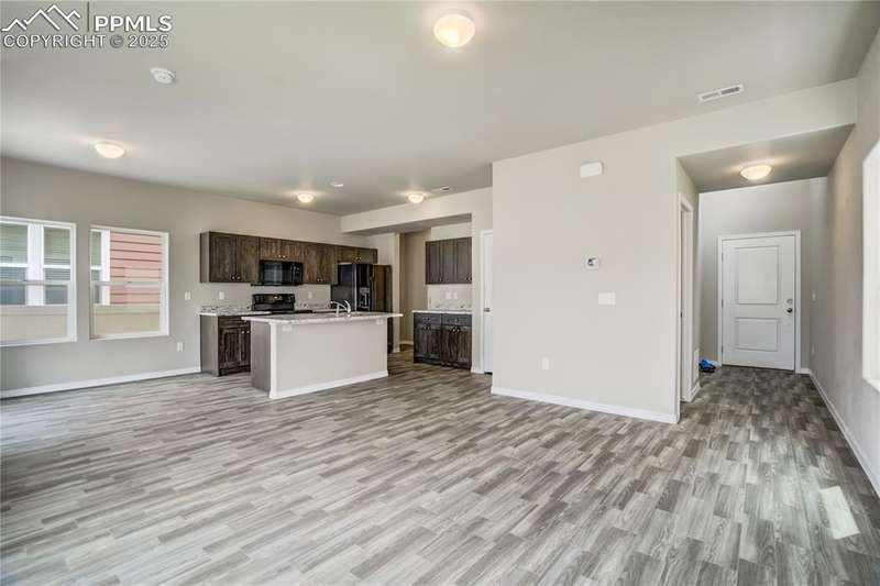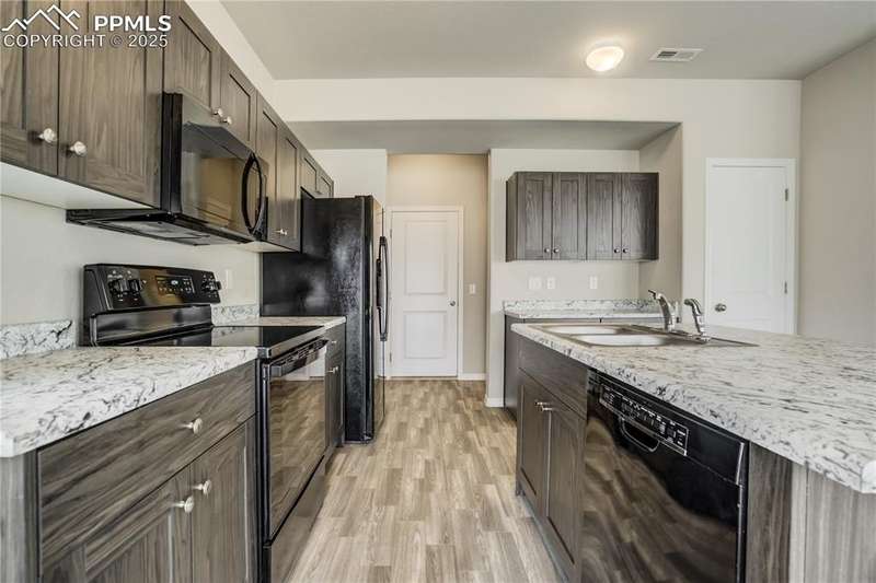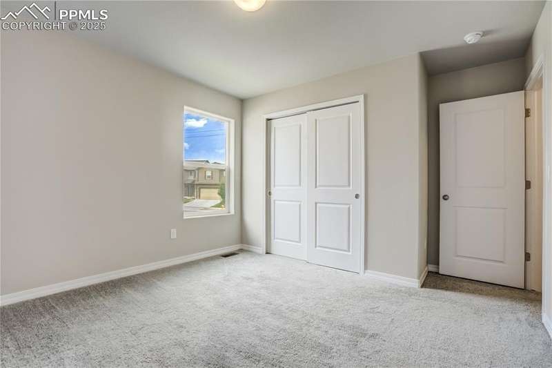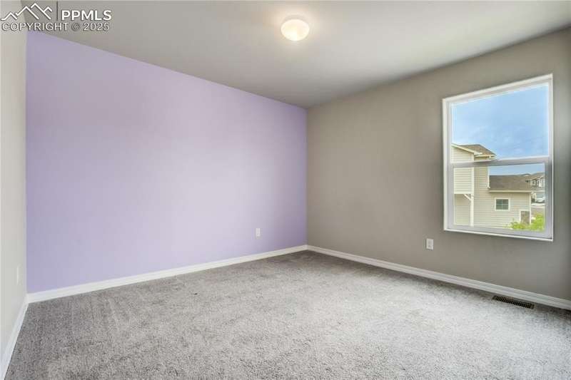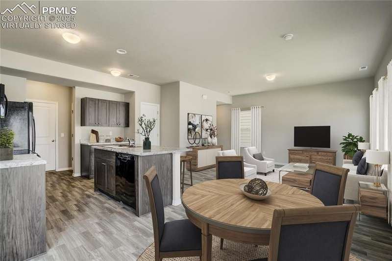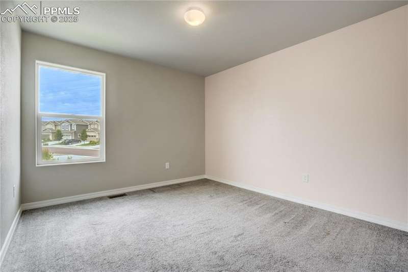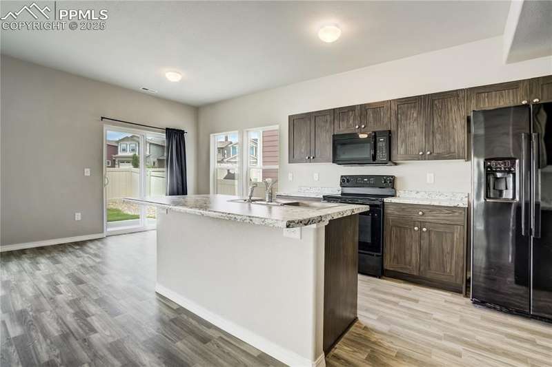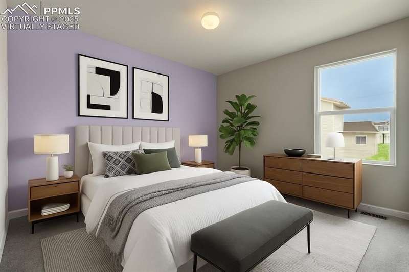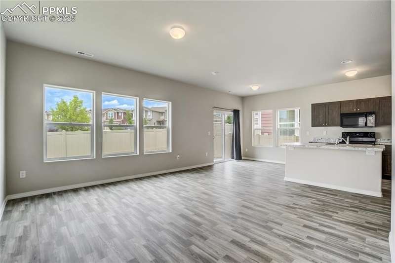 Set in The Enclaves at Mountain Vista, this 2021-built home offers convenient access to parks, schools, shopping, restaurants, & the Powers corridor—plus a direct route to Peterson SFB, Schriever, & Fort Carson. The open-concept two-story layout begins with a spacious main level that flows seamlessly from the great room into the eat-in kitchen. Durable wood laminate flooring runs throughout the entry & main living areas, while a half bath is tucked privately off to the side. The kitchen features black appliances, laminate countertops, a center island, & walk-in pantry, with a sliding glass door that opens directly to the fenced backyard—perfect for easy indoor-outdoor living. Upstairs, all three bedrooms are thoughtfully situated around a central loft that provides flexible bonus space for work, play, or entertainment. The primary suite includes a walk-in closet with window, abundant natural light, & private bath w/ a freestanding shower. Two additional bedrooms share a full hall bath, & the upper-level laundry room provides added convenience. Additional perks include central A/C, high-speed internet availability, energy-efficient vinyl windows, & an attached two-car garage. Low-maintenance landscaping, rear vinyl fencing, & no rear neighbors round out the exterior—all within a covenant-controlled metro district that handles trash & enforcement.