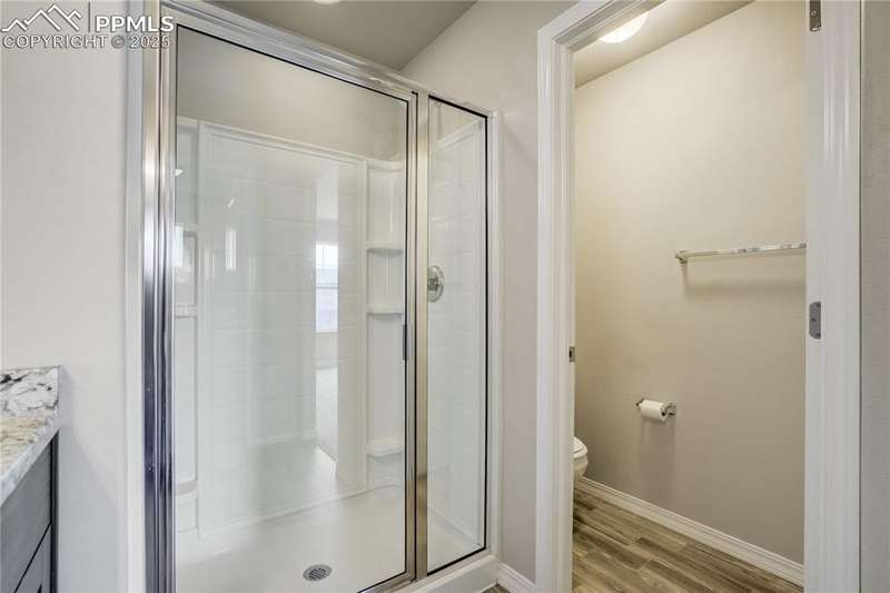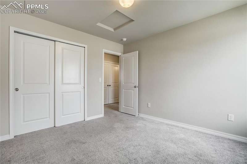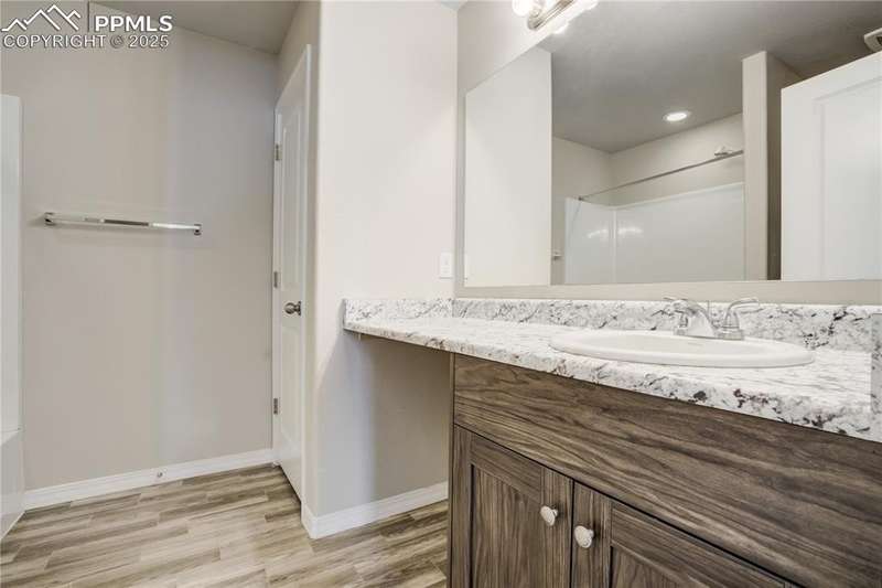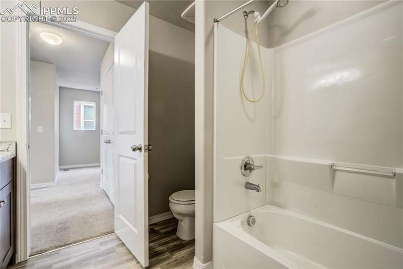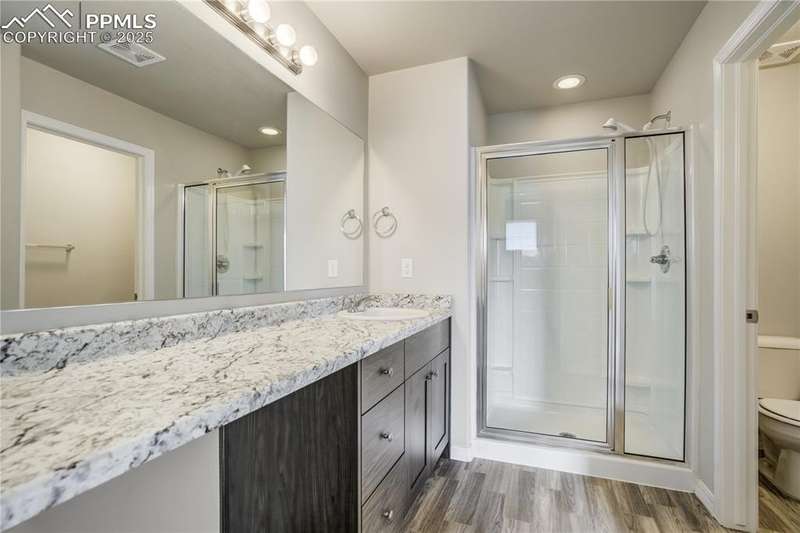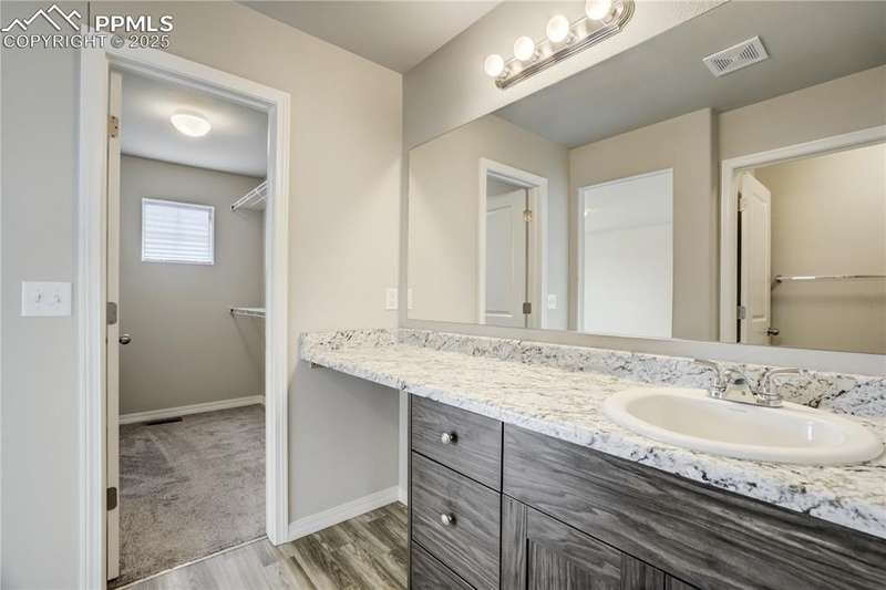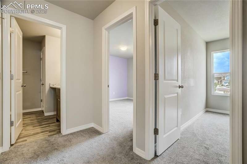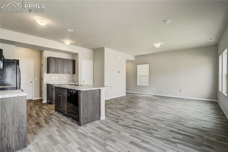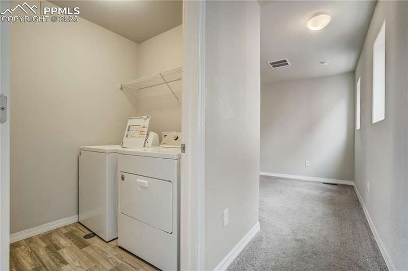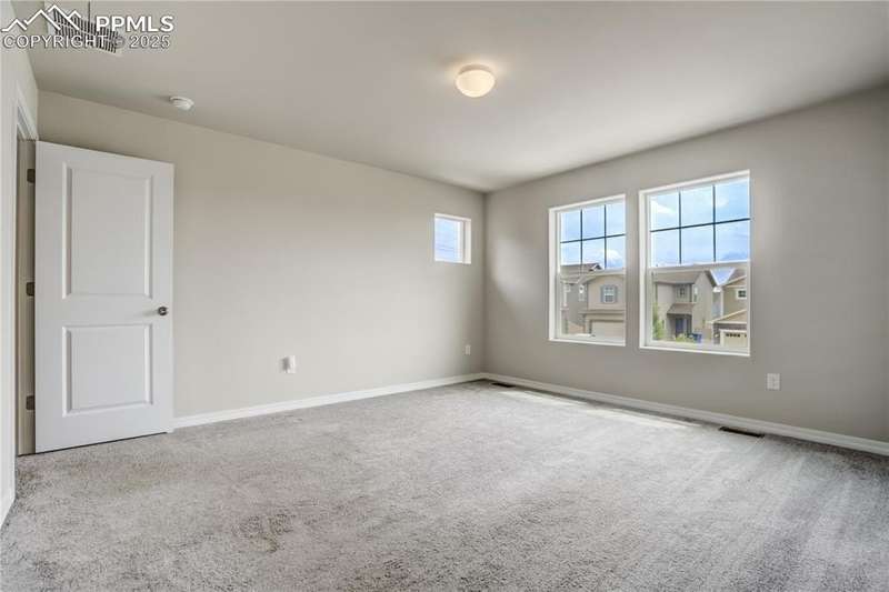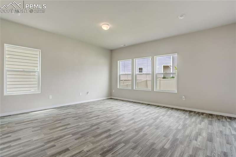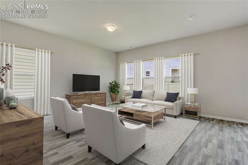 Set in The Enclaves at Mountain Vista, this 2021-built home offers convenient access to parks, schools, shopping, restaurants, & the Powers corridor—plus a direct route to Peterson SFB, Schriever, & Fort Carson. The open-concept two-story layout begins with a spacious main level that flows seamlessly from the great room into the eat-in kitchen. Durable wood laminate flooring runs throughout the entry & main living areas, while a half bath is tucked privately off to the side. The kitchen features black appliances, laminate countertops, a center island, & walk-in pantry, with a sliding glass door that opens directly to the fenced backyard—perfect for easy indoor-outdoor living. Upstairs, all three bedrooms are thoughtfully situated around a central loft that provides flexible bonus space for work, play, or entertainment. The primary suite includes a walk-in closet with window, abundant natural light, & private bath w/ a freestanding shower. Two additional bedrooms share a full hall bath, & the upper-level laundry room provides added convenience. Additional perks include central A/C, high-speed internet availability, energy-efficient vinyl windows, & an attached two-car garage. Low-maintenance landscaping, rear vinyl fencing, & no rear neighbors round out the exterior—all within a covenant-controlled metro district that handles trash & enforcement.