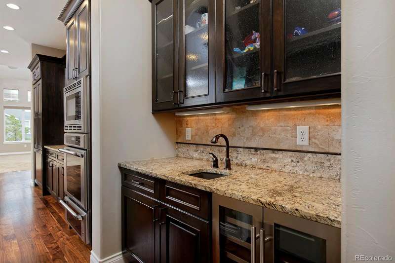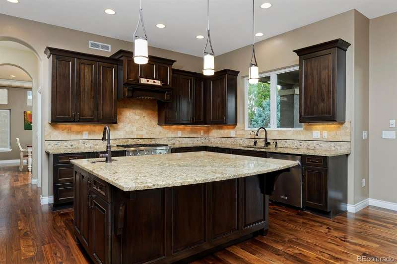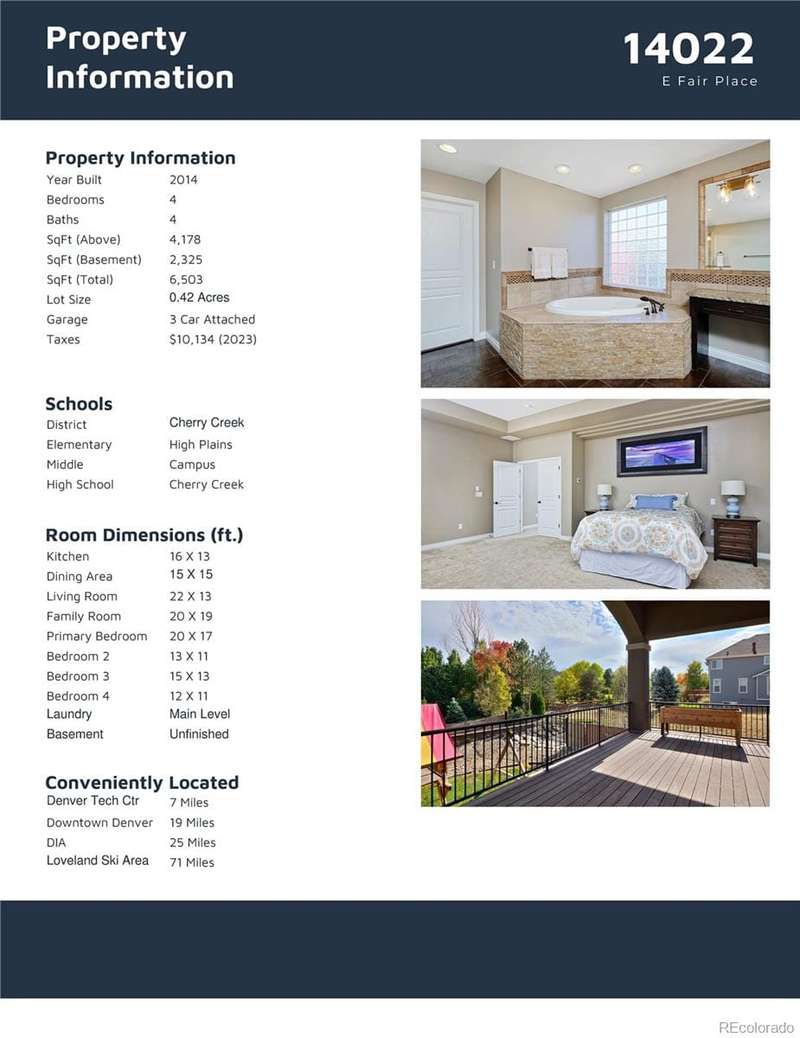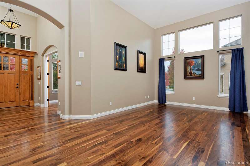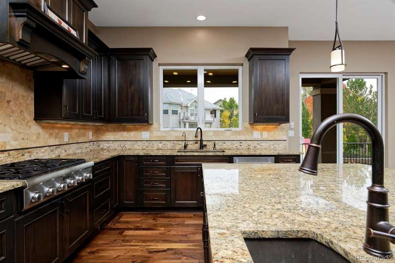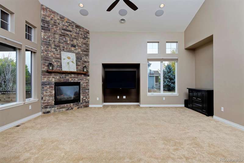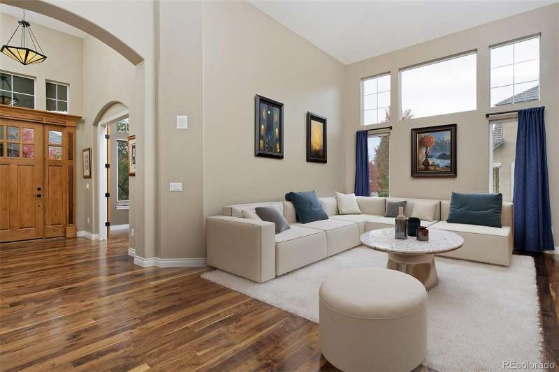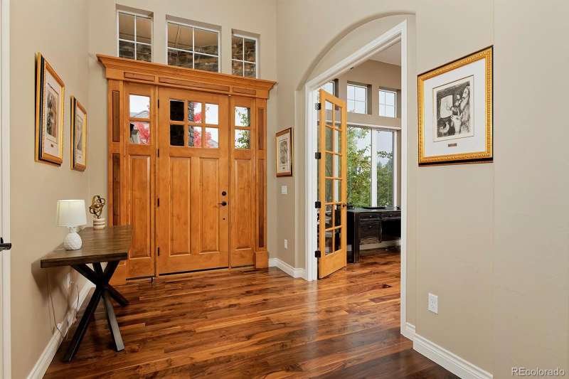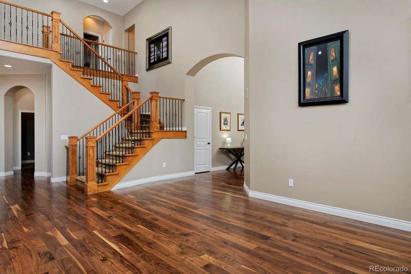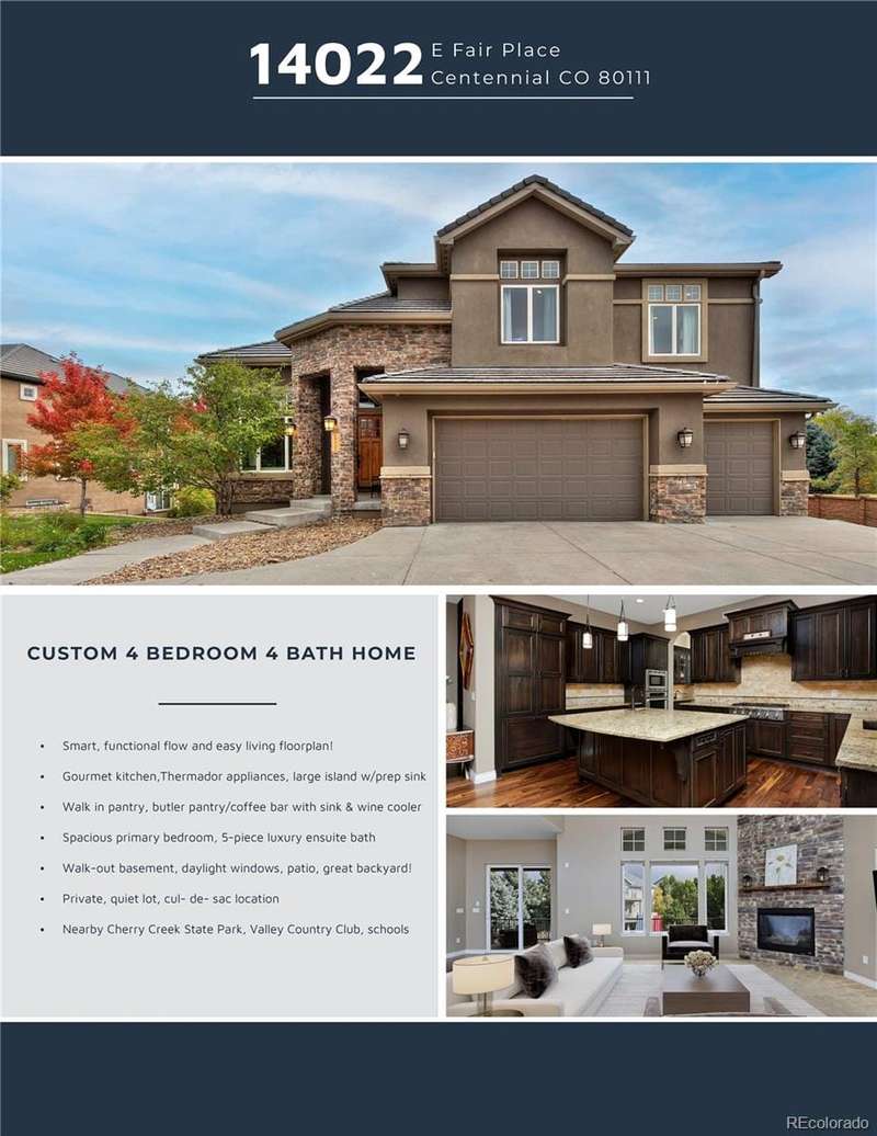 a Grand 4 bed, 4 bath home nestled in a peaceful cul-de-sac gives a welcoming reception with a covered porch surrounded by beautiful brick work. Kick your shoes off in the spacious foyer with the surprise of a lovely art niche to guide you in. Tucked to the side of the foyer is a main floor office with French glass doors. High & vaulted ceilings, custom details throughout the home give an opulent feeling. Stately kitchen has granite countertops & Thermador appliances. The main sink has a touchless faucet, soap dispenser & water filtration system. Large island also has a prep sink with touchless faucet. Other features include walk-in pantry, wet bar-coffee station with wine cooler & under cabinet lighting. The kitchen leads to an inviting covered patio overlooking the backyard. Enjoy surround sound inside & outside (sub-woofer, 6 speakers in family room, 2 on patio). Spacious living room adjoins the dining room featuring a hutch alcove & accent light in an elegant ceiling tray. The open & bright feel of the main living space includes a cozy family room with a fireplace with a rustic mantel & brick. Main floor laundry room with washer & dryer, NEW utility sink, plenty of counter & storage space. Main floor powder room & mud room with built-ins located in the garage entry wing. Open stairway leads to upper level with 4 Bedrooms & 3 Bathrooms. The roomy Primary Bedroom has a 5-piece luxury bathroom. Find 2 additional spacious bedrooms adjoined by a full Jack & Jill bath & the 4th bedroom has an ensuite 3/4 bath. Walk-out unfinished basement, water softener system, daylight windows, leads to a covered patio. Have it your wayrec room, gym, guest bedroom, alcove makes a sweet place for a wine room walk out to the backyard patio, great gathering area, perhaps a fire pit, pizza oven. 3-car attached garage with work bench. Nearby Valley Country Club (golf/swim) & Cherry Creek State Park, a great place to stroll & play! the Seller requires 4 hr. notice for showings.