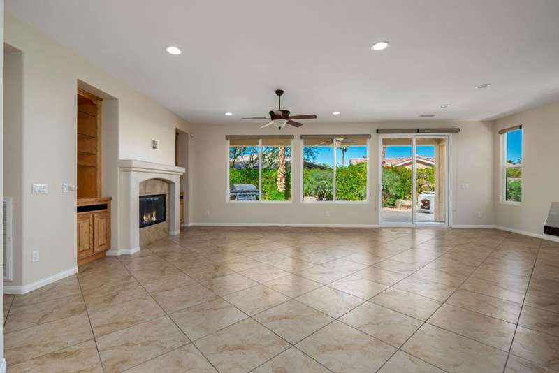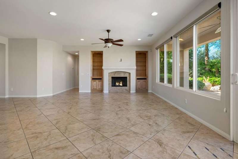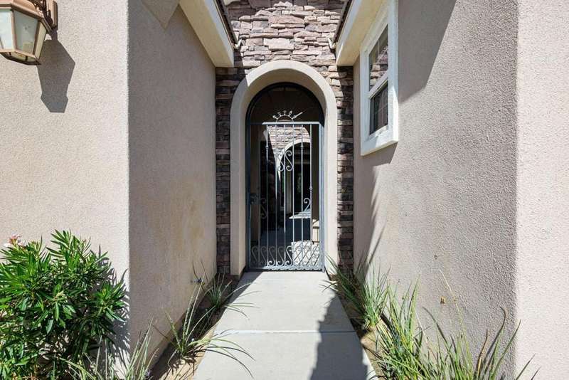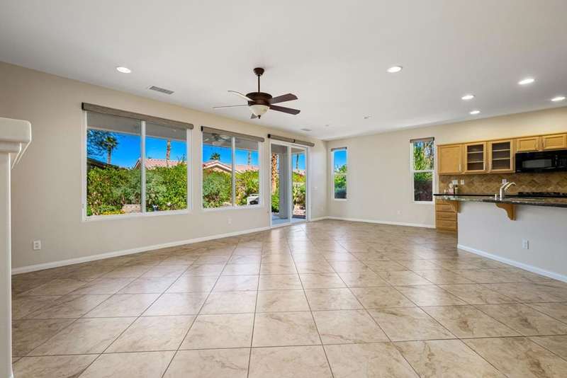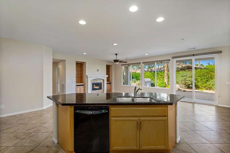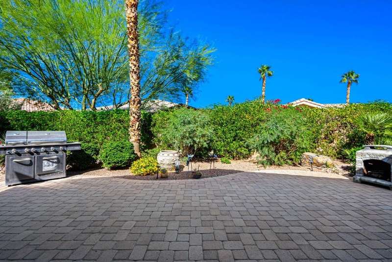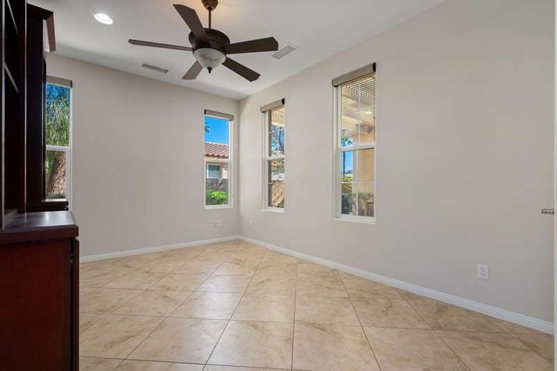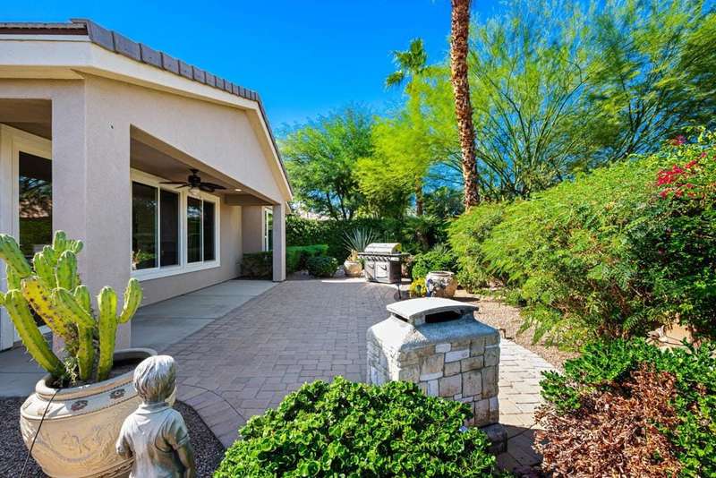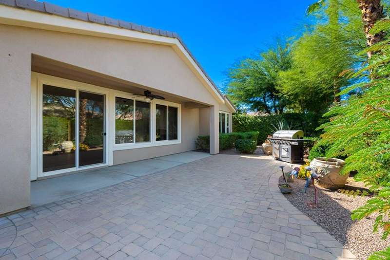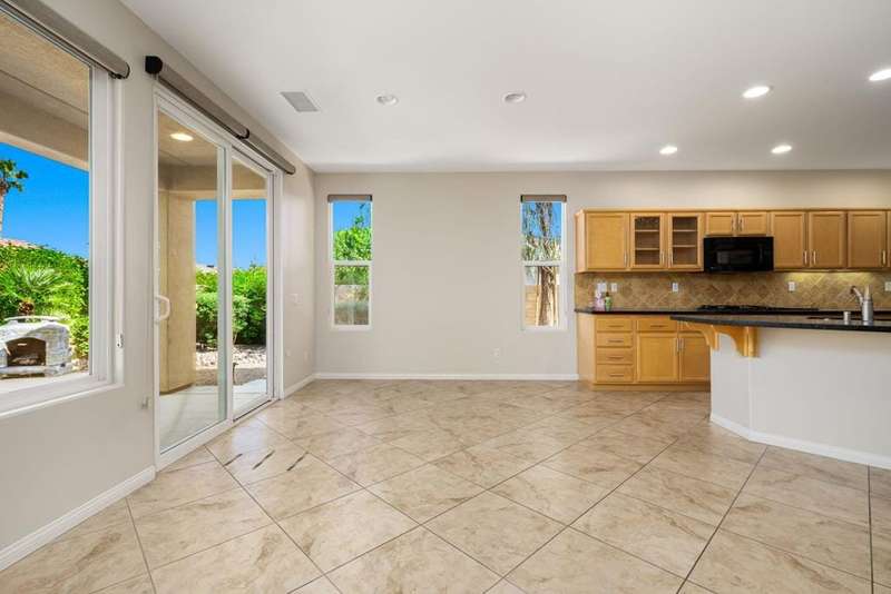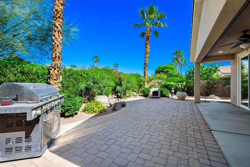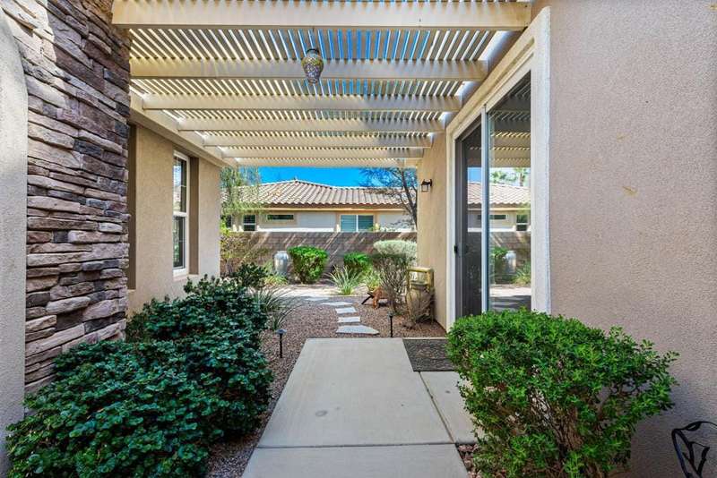 Nestled on a quiet cul-de-sac within the gates of the premier 55+ community of Trilogy La Quinta, this classic Monterey plan with detached casita offers 1,965 sq. ft. of thoughtfully designed living space, including 3 bedrooms, 3 baths, and a versatile den/office that may serve as a 4th bedroom. A wrought iron privacy gate and Tuscan-style facade open to a welcoming courtyard with custom pergola, setting the tone for the home's inviting ambiance. The great room features built-in shelving, a tile-encased fireplace with mantel, and expansive rear yard views, seamlessly connected to the dining area and well-appointed kitchen complete with a generous prep island and bar seating, slab countertops, custom backsplash, dual ovens, microwave, gas cooktop, black appliances, abundant cabinetry with brushed nickel hardware, and a spacious pantry. Multiple guest accommodations include a private detached casita with beverage center and sink, ideal for hosting family and friends in comfort. The primary retreat showcases a bay window, French door access to the backyard, and an en suite bath with dual sinks, vanity, slab countertops, a large tiled shower, and a walk-in closet. Outdoors, tranquility abounds with a paver patio, professional landscaping, and a covered patio, creating an ideal setting for relaxation and entertaining.