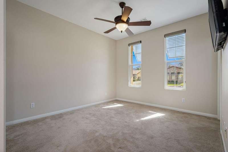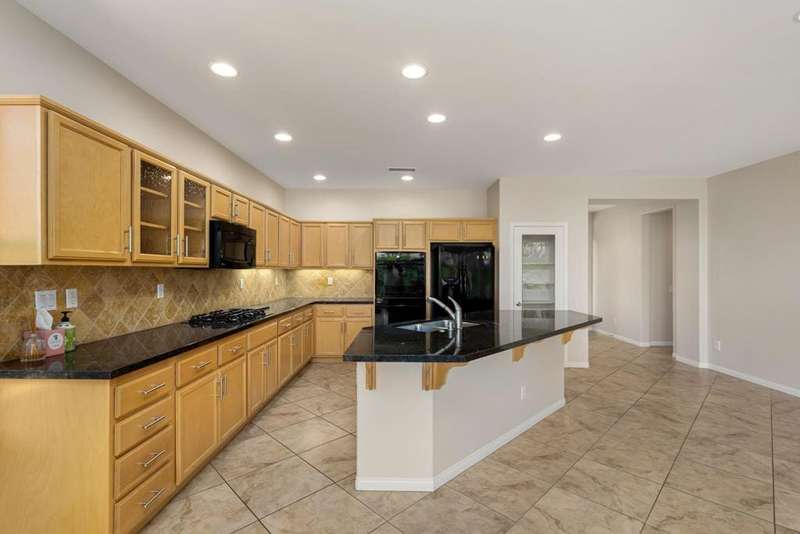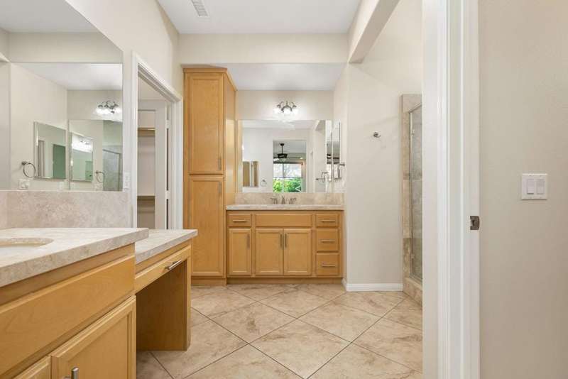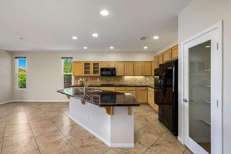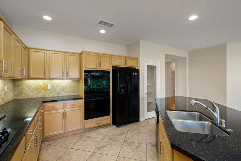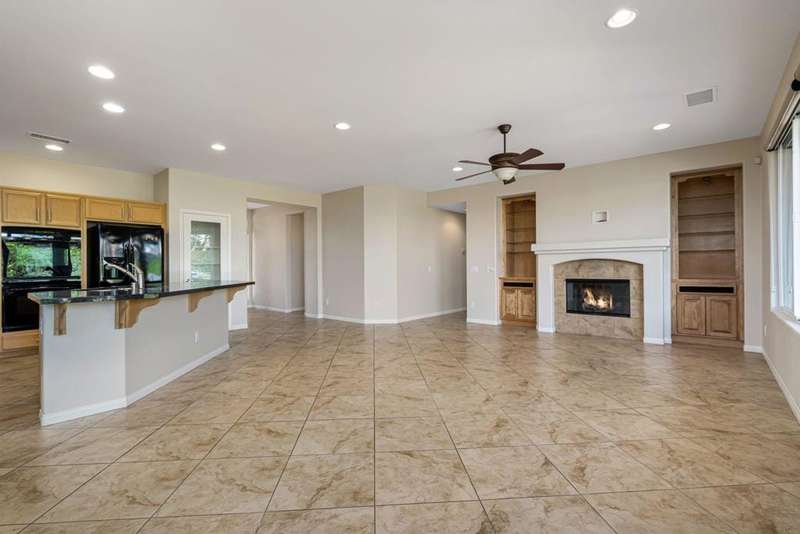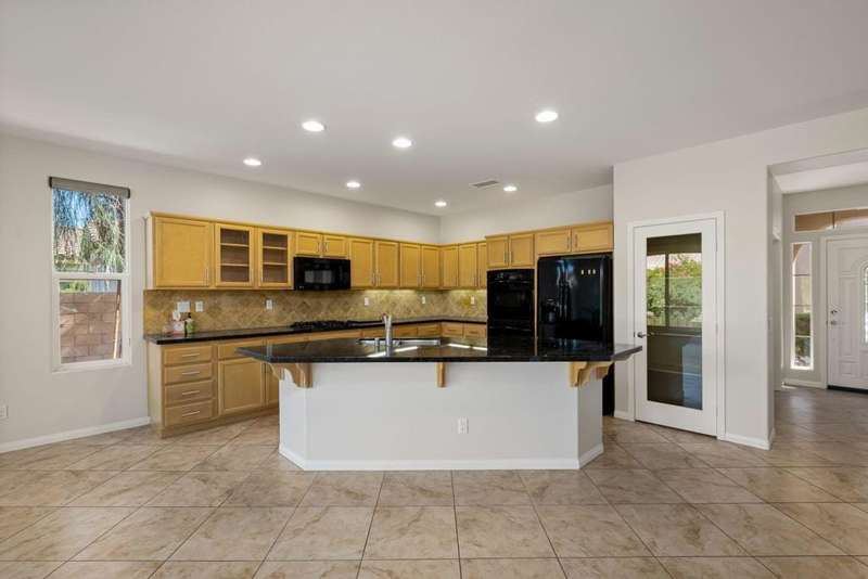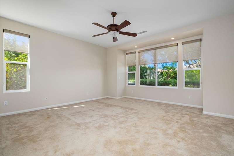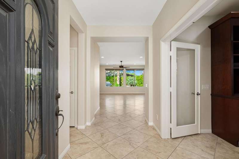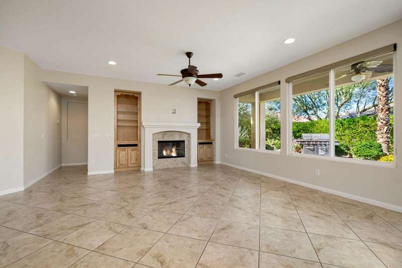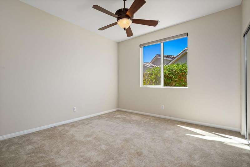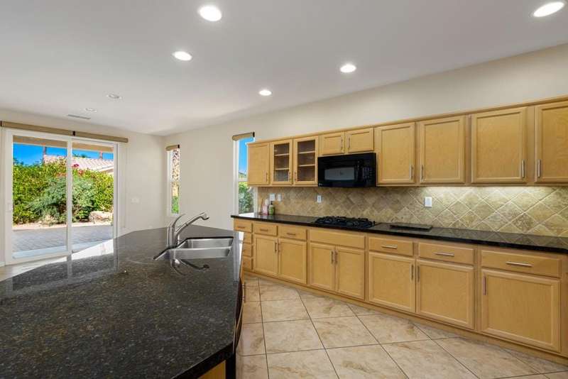 Nestled on a quiet cul-de-sac within the gates of the premier 55+ community of Trilogy La Quinta, this classic Monterey plan with detached casita offers 1,965 sq. ft. of thoughtfully designed living space, including 3 bedrooms, 3 baths, and a versatile den/office that may serve as a 4th bedroom. A wrought iron privacy gate and Tuscan-style facade open to a welcoming courtyard with custom pergola, setting the tone for the home's inviting ambiance. The great room features built-in shelving, a tile-encased fireplace with mantel, and expansive rear yard views, seamlessly connected to the dining area and well-appointed kitchen complete with a generous prep island and bar seating, slab countertops, custom backsplash, dual ovens, microwave, gas cooktop, black appliances, abundant cabinetry with brushed nickel hardware, and a spacious pantry. Multiple guest accommodations include a private detached casita with beverage center and sink, ideal for hosting family and friends in comfort. The primary retreat showcases a bay window, French door access to the backyard, and an en suite bath with dual sinks, vanity, slab countertops, a large tiled shower, and a walk-in closet. Outdoors, tranquility abounds with a paver patio, professional landscaping, and a covered patio, creating an ideal setting for relaxation and entertaining.