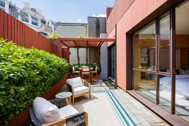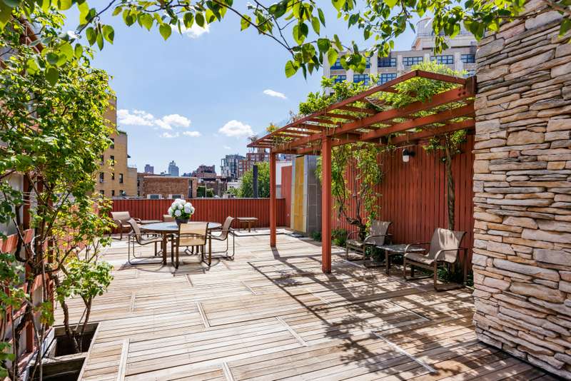 The gorgeous roof deck, accessible from the elevator , boasts fantastic open skyline views, including the Empire State Building and Hudson Yards. The deck includes multiple seating areas, a pergola, and mature landscaping including birch trees.