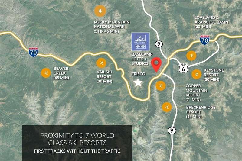 BRAND NEW MARKET RATE RESIDENCE WITH NO DEED RESTRICTIONS! With its central Frisco location, Basecamp Studios provides the mountain enthusiast with everything they need and nothing they don’t. Perfectly situated in the Central Rockies, new Basecamp owners will have convenient access to the I-70 corridor for outdoor recreation from A-Basin to Moab, as well as easy routes to Denver and DIA. The innovative design of the studio residences offers a dedicated sleeping area, full kitchen, in-unit laundry, outdoor living space, and two outdoor storage rooms for all of your seasonal mountain gear. Located next to Whole Foods Market, Outer Range Brewery, Pure Kitchen, Basecamp Wine and Spirits, Epic Mountain Gear and the Summit County Transfer Hub, the location is second to none for your mountain-metro experience. The homes are LEED Gold certified and will be serviced by electric heat/cool pumps for the utmost in energy efficiency and environmental consciousness. Plus, two private storage closets, 86.5 sf total. Don’t wait—secure your Basecamp today! *99 year ground lease included in HOA dues. Owner upon re-sale must inform town of Frisco of intent to sell. In no buyer is found within the town of Frisco’s 30-day notice, the owner may list and sell the property via Broker via the MLS or FSBO.