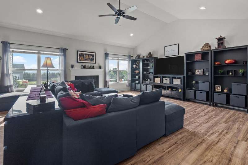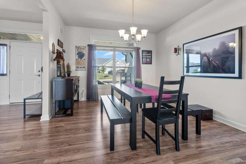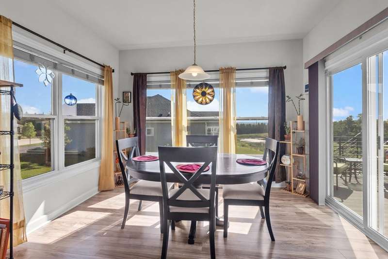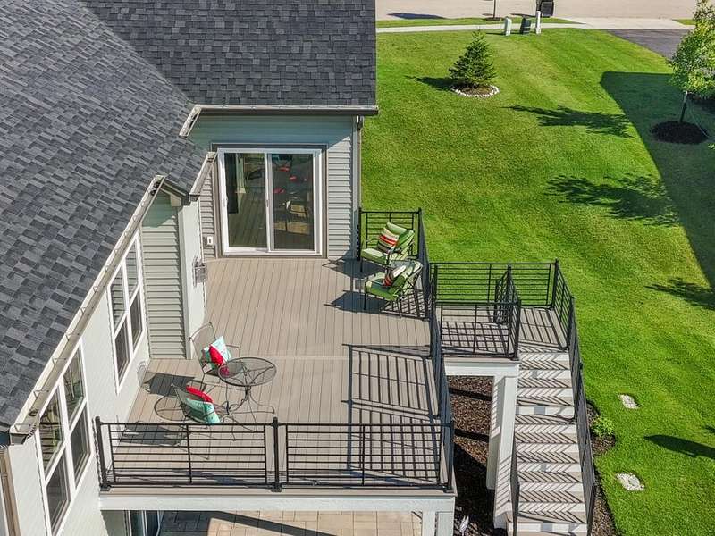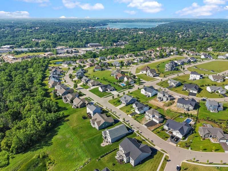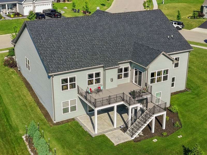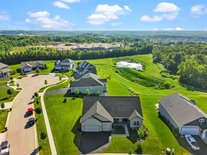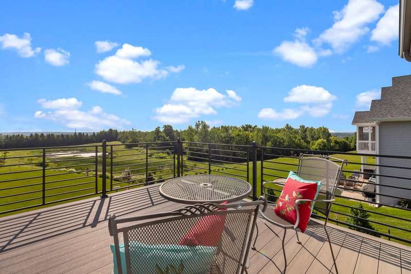 Stunning views! 3 bedrooms, office, and 2.5 baths offer comfort, functionality, and room to grow. The expansive kitchen featuring an oversized island with deep drawers, pantry, and rollout storage for maximum organization. Two laundry hookups, a generous walk-in closet, and a maintenance-free deck--perfect for relaxing and catching views of nearby fireworks. Walkout lower level offers additional living potential, with roughed-in plumbing ready for a future bathroom and access to a lower-level patio. 3-car garage provides ample space for vehicles and storage. Outdoors, upgraded landscaping creates a private, serene setting with perennials, Norway pines, and star power junipers. Maples provide vibrant red foliage each fall, adding seasonal beauty to your backyard with an irrigation system.