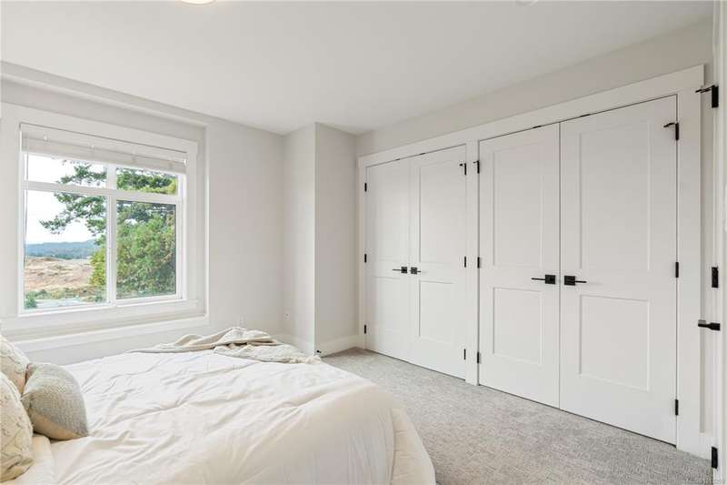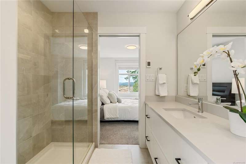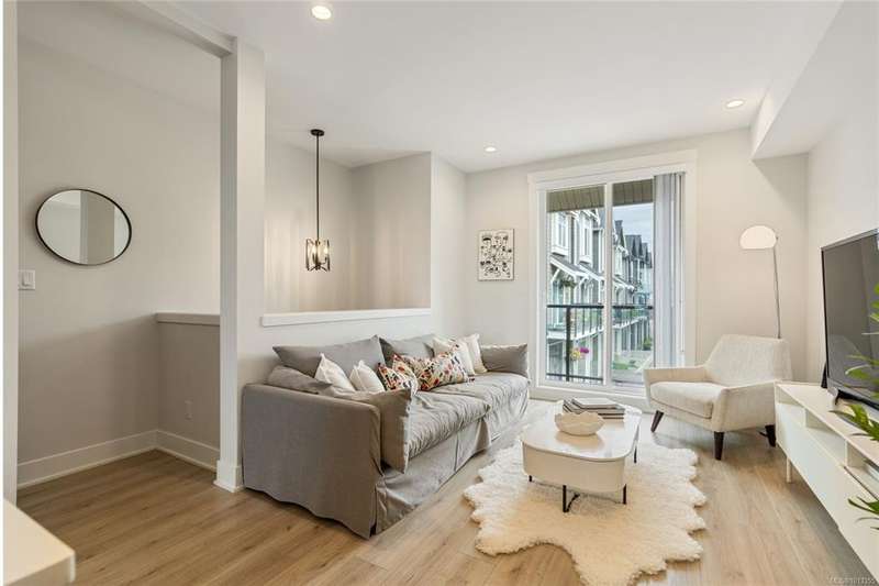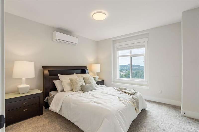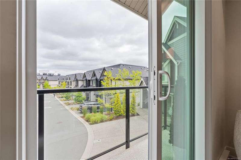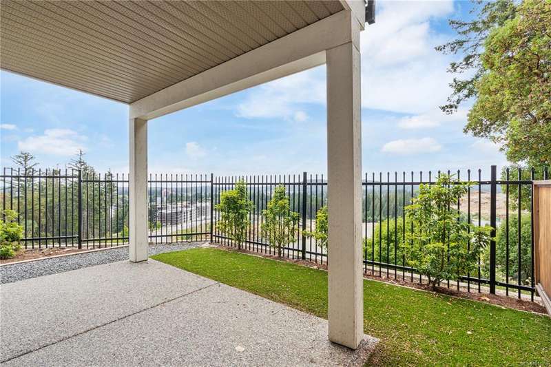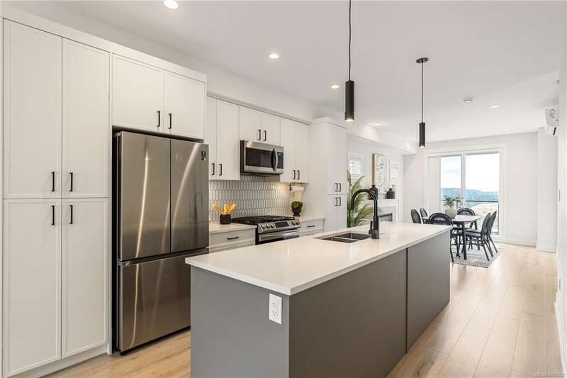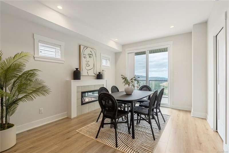 Welcome to 1161 Moonstone Loop in Bear Mountain’s South Point community! This bright 2 Bed, 3 Bath END UNIT townhouse offers stunning mountain views and a flexible, open-concept layout. The chef-inspired kitchen features stainless steel appliances, two-tone cabinetry, and a spacious island. The living and dining areas can be arranged to suit your lifestyle—dine by the fireplace or relax and enjoy the view. Upstairs, a bright skylight adds natural light, and the primary suite offers oversized closets and a spa-like ensuite with radiant floor heating and a glass shower. The second bedroom also includes its own ensuite, and a full laundry room is conveniently located upstairs near both bedrooms. Enjoy two private balconies and a low-maintenance backyard. The tandem double garage provides parking, storage, or space for a gym/office with its own entrance. Just one minute to the highway for a quick Victoria commute!