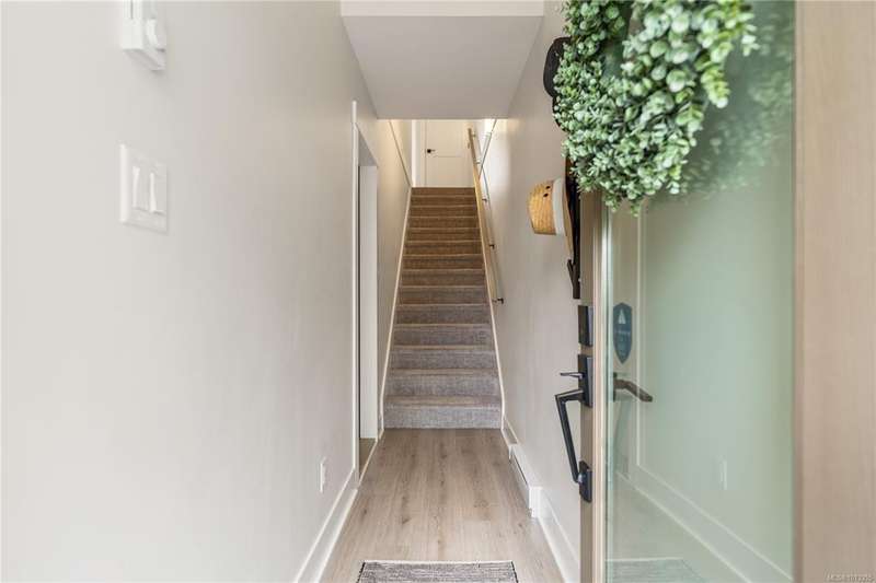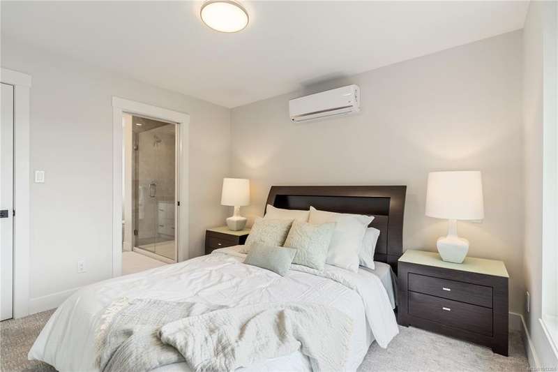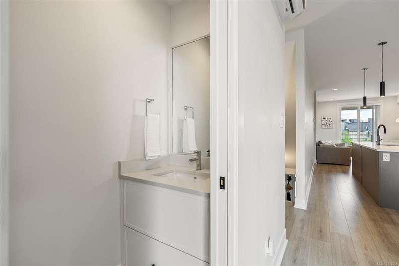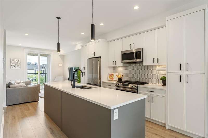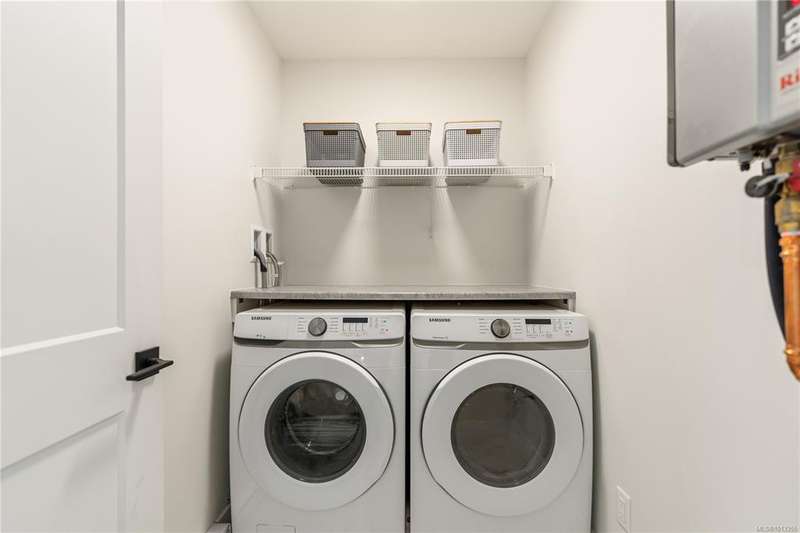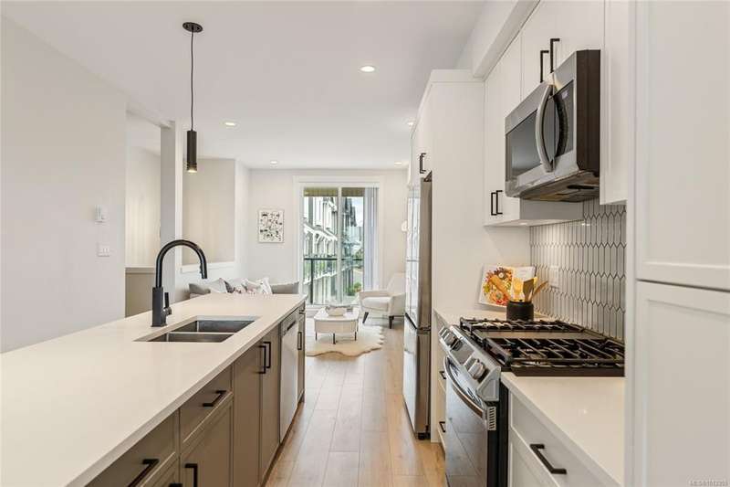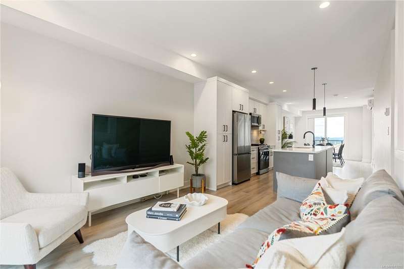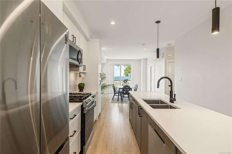 Welcome to 1161 Moonstone Loop in Bear Mountain’s South Point community! This bright 2 Bed, 3 Bath END UNIT townhouse offers stunning mountain views and a flexible, open-concept layout. The chef-inspired kitchen features stainless steel appliances, two-tone cabinetry, and a spacious island. The living and dining areas can be arranged to suit your lifestyle—dine by the fireplace or relax and enjoy the view. Upstairs, a bright skylight adds natural light, and the primary suite offers oversized closets and a spa-like ensuite with radiant floor heating and a glass shower. The second bedroom also includes its own ensuite, and a full laundry room is conveniently located upstairs near both bedrooms. Enjoy two private balconies and a low-maintenance backyard. The tandem double garage provides parking, storage, or space for a gym/office with its own entrance. Just one minute to the highway for a quick Victoria commute!