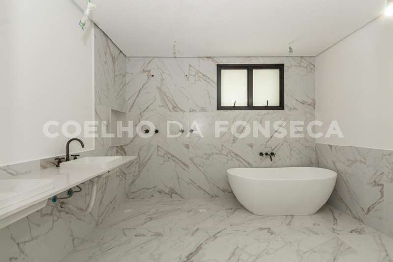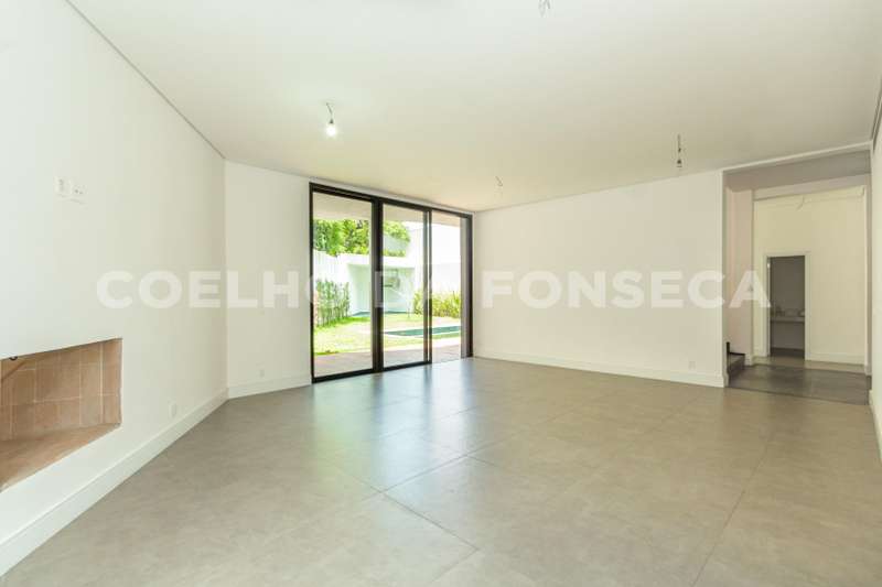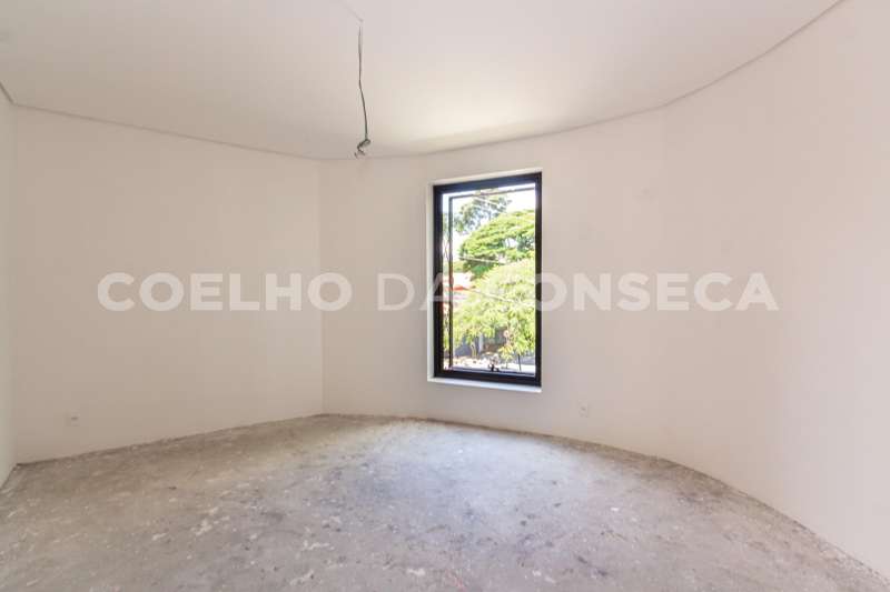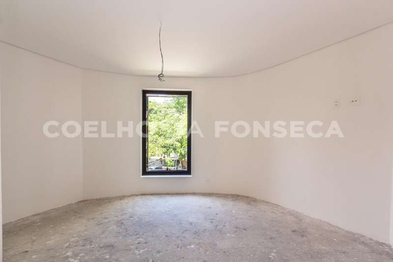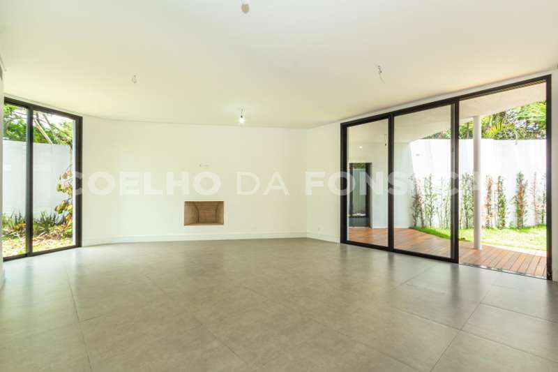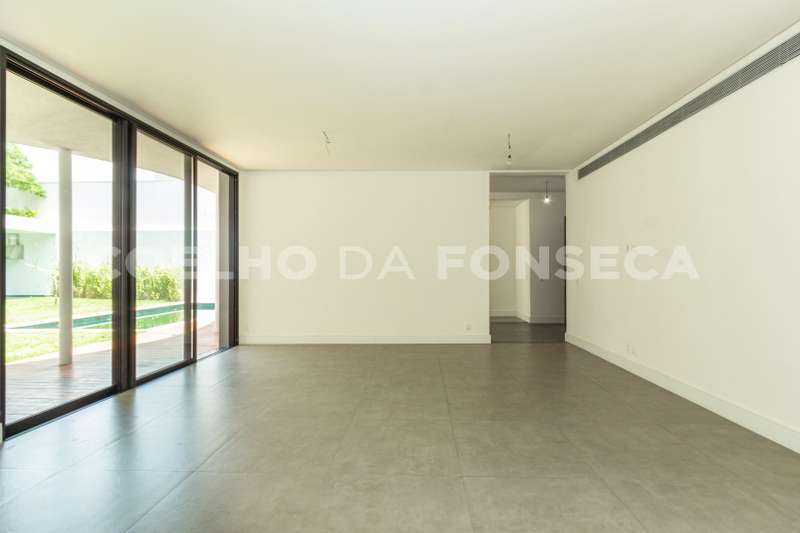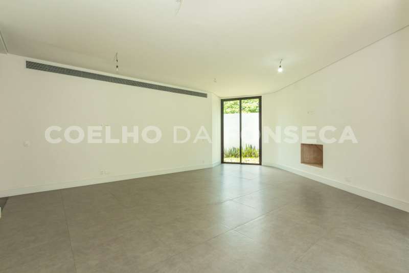 • Sala com pé direito generoso, amplos vãos e caixilhos de 1ª linha, do piso ao teto,