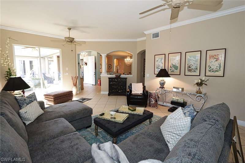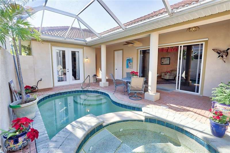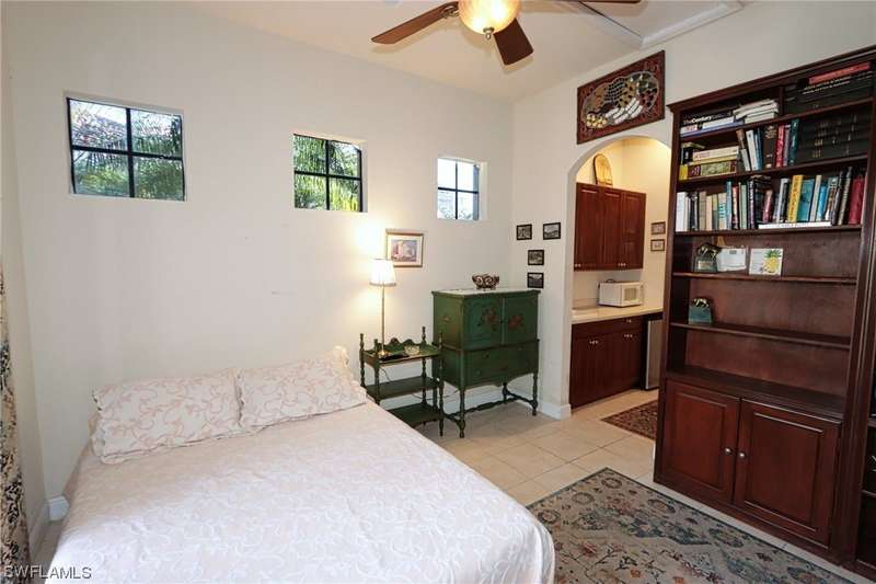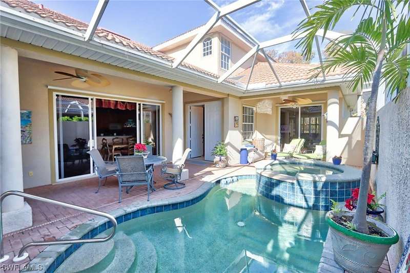 HUGE PRICE REDUCTION*Large 4/5 mostly furnished Home with Private Courtyard Lanai features Waterfall Spa and Heated Pool*Custom Angled 18" tile in all common areas*Guest Cabana with Full Bedroom & Kitchenette*Huge Kitchen with Custom Wood Cabinets, Stainless Steel Appliances, and plenty of Granite Counterspace, plus a separate Ale Bar*Private Main Floor Principal Suite w/ Large Walk-In Closet, Granite and Wood 2 Sink Counter, Hardwood Floors, Garden Soak Tub and Walk-In Shower*Very Large Great Room with Double Door Entry and Sliders to Pool*2 Spacious Bedroom Upstairs each with a Private Bath*Home Sound System In and Out*Heated Community Pool directly across the street with additional Guest Parking*Oversized 2 Car Garage*HOA includes Home Insurance on outer home, Flood Insurance, Cable TV & Internet, Interior & Exterior Pest Control, Fresh Exterior Paint 2023, New Spanish Style Barrel Tile Roof in 2024 and care of all common areas, including a huge Resort Style Pool, Tennis Courts, Pickle Ball, Walking Trails, and Children's Play Area*Locates minutes from Sanibel & Fort Myers Beaches,
