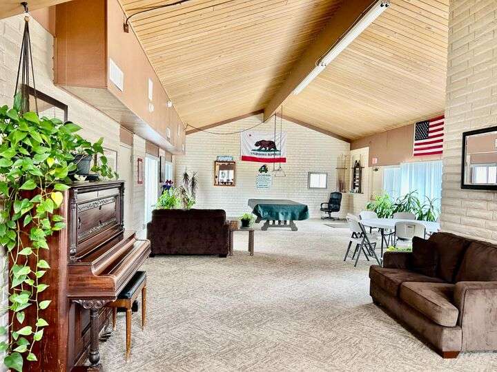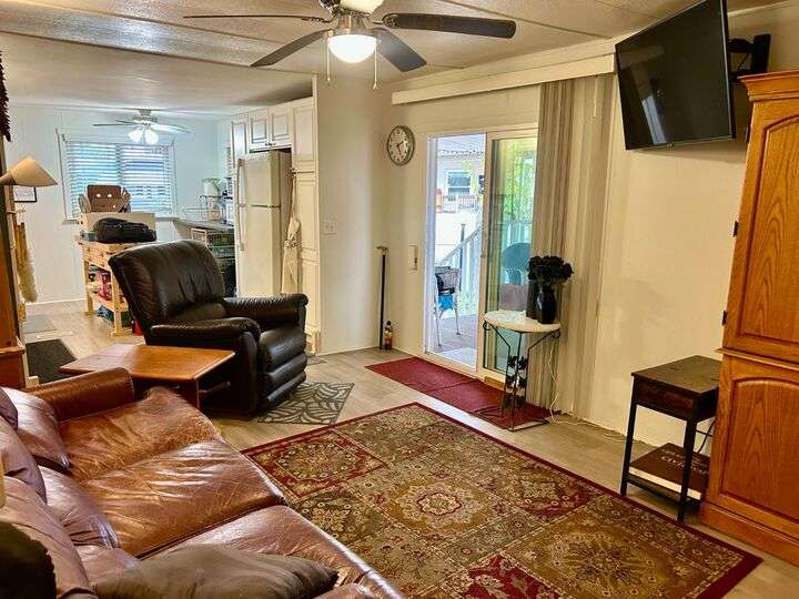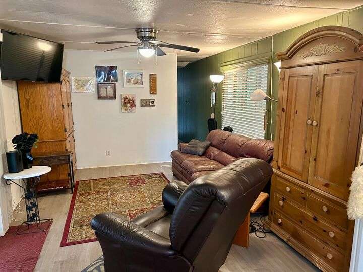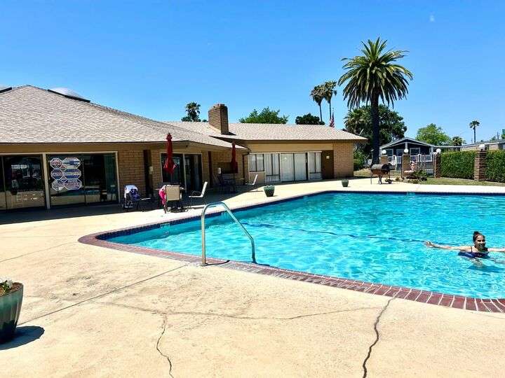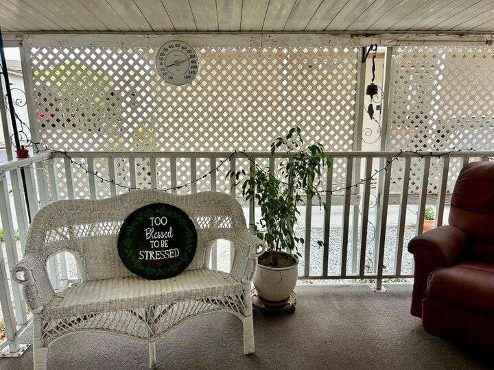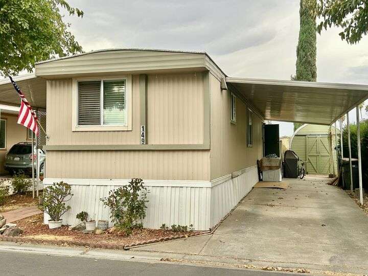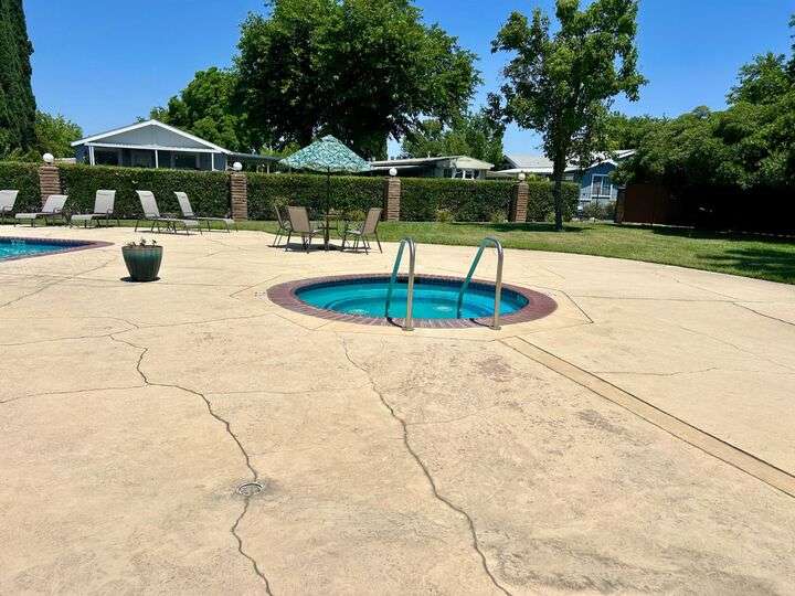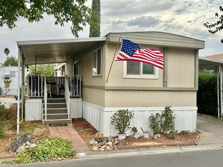 Check out this beautifully upgraded home featuring fresh two-tone interior paint, dual pane, windows with upgraded blinds, central heat and air, and ceiling fans with lights in every room. Enjoy upgraded flooring, a spacious kitchen with newer cabinets and included refrigerator and stackable washer/dryer. Relax on the large covered porch and take in the refreshing delta breeze. The low-maintenance yard includes a 10x12ft Quonset hut shed for extra storage. Located on a quiet 55+ community with a pool, hot tub, and clubhouse offering many activities, this home combines comfort, convenience and an active lifestyle.