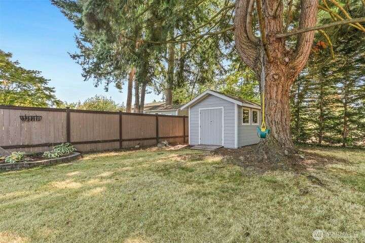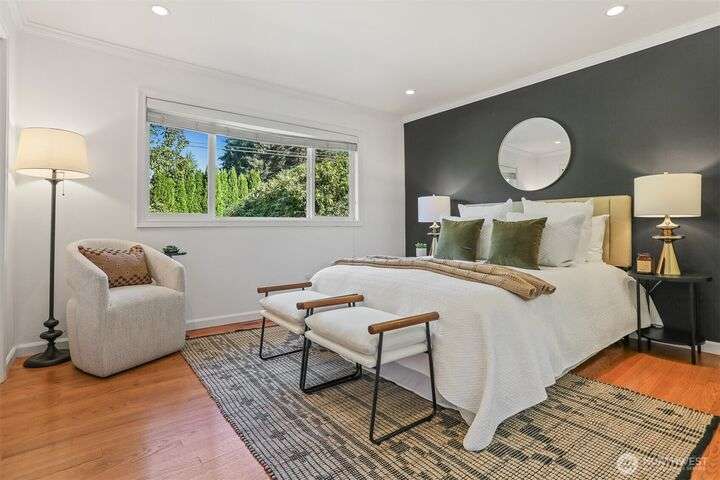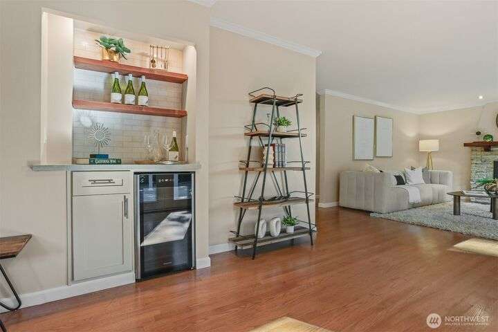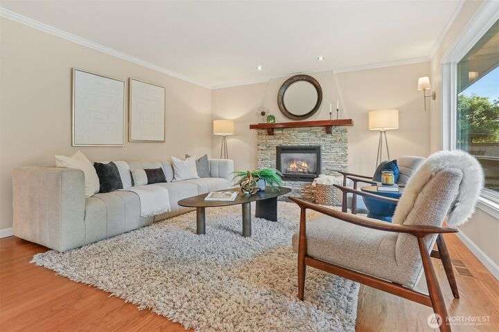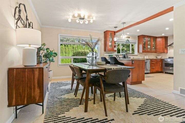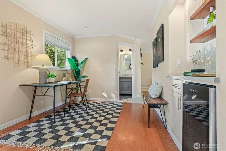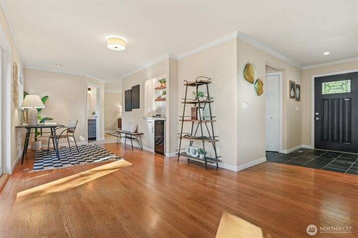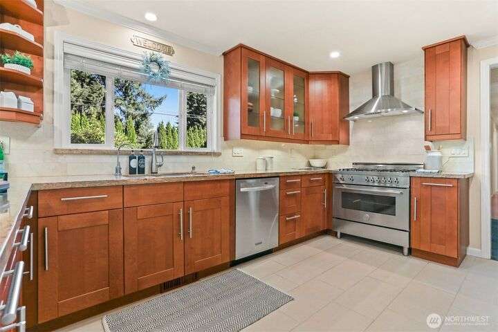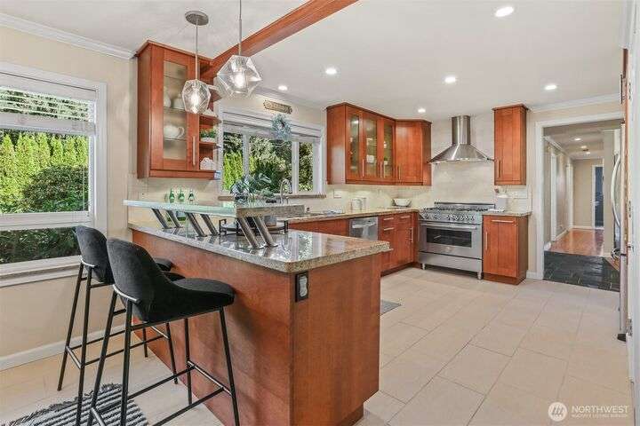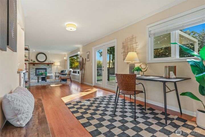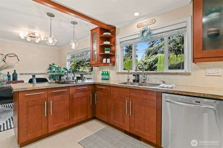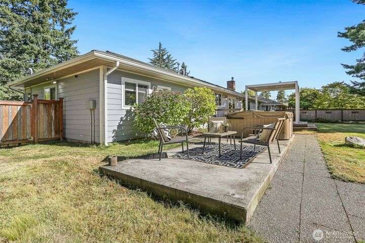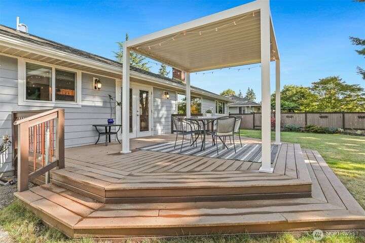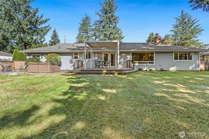 Beautiful Edmonds single-level contemporary residence seamlessly blends thoughtful modern updates w/ timeless charm. This inviting 3-bed, 2-bath home showcases a chef’s kitchen w/ stunning granite countertops, custom cabinetry, Bertazzoni gas range, & spacious dining area. Light-filled living room w/ large picture window & cozy gas fireplace flows into the dining room, complete w/ dry bar — perfect for entertaining. French doors open to a private, tree-lined backyard retreat featuring a spacious Trex deck, adjustable pergola, & hot tub. Ideal for gardening, pets, or simply relaxing. Well-maintained original hardwood floors run throughout, central air conditioning, dedicated laundry room, & large EV-ready garage with abundant storage.