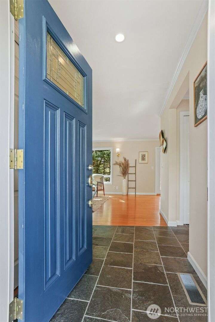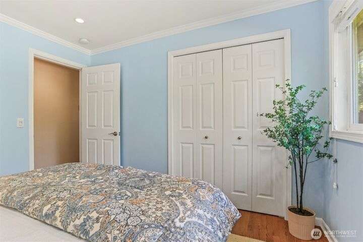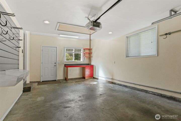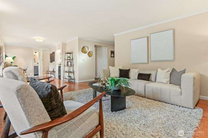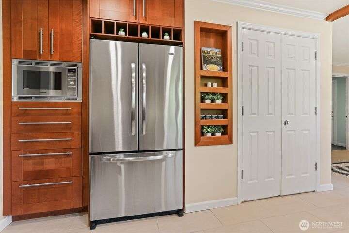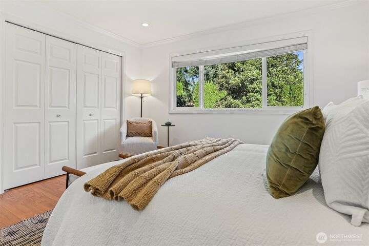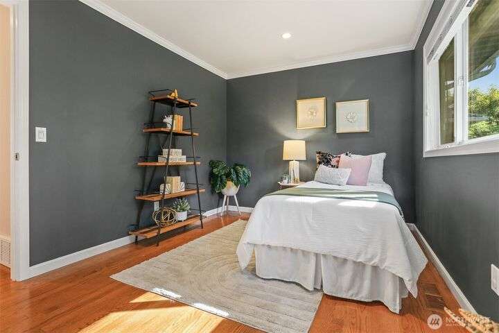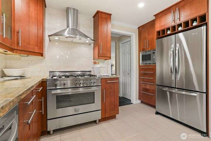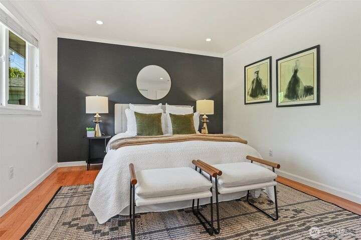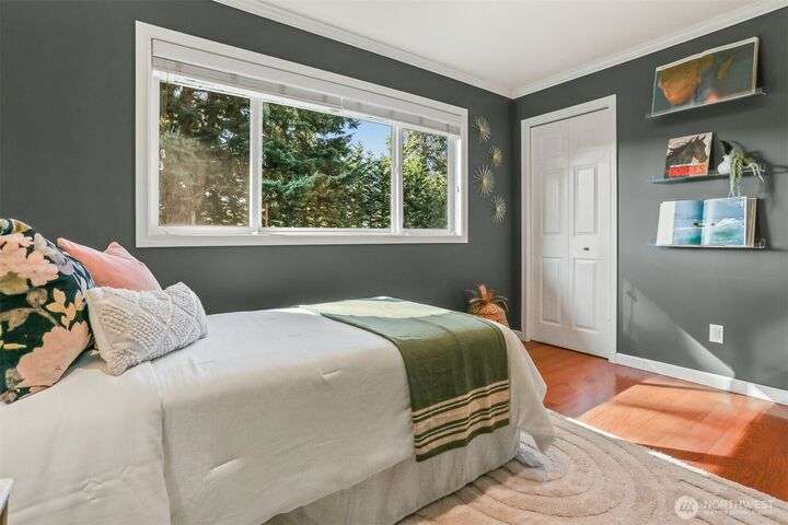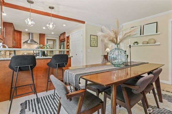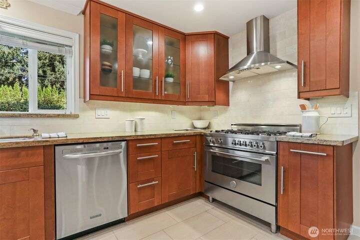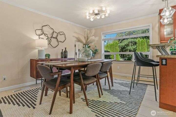 Beautiful Edmonds single-level contemporary residence seamlessly blends thoughtful modern updates w/ timeless charm. This inviting 3-bed, 2-bath home showcases a chef’s kitchen w/ stunning granite countertops, custom cabinetry, Bertazzoni gas range, & spacious dining area. Light-filled living room w/ large picture window & cozy gas fireplace flows into the dining room, complete w/ dry bar — perfect for entertaining. French doors open to a private, tree-lined backyard retreat featuring a spacious Trex deck, adjustable pergola, & hot tub. Ideal for gardening, pets, or simply relaxing. Well-maintained original hardwood floors run throughout, central air conditioning, dedicated laundry room, & large EV-ready garage with abundant storage.