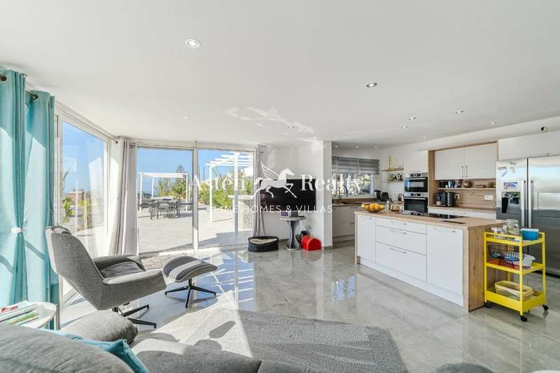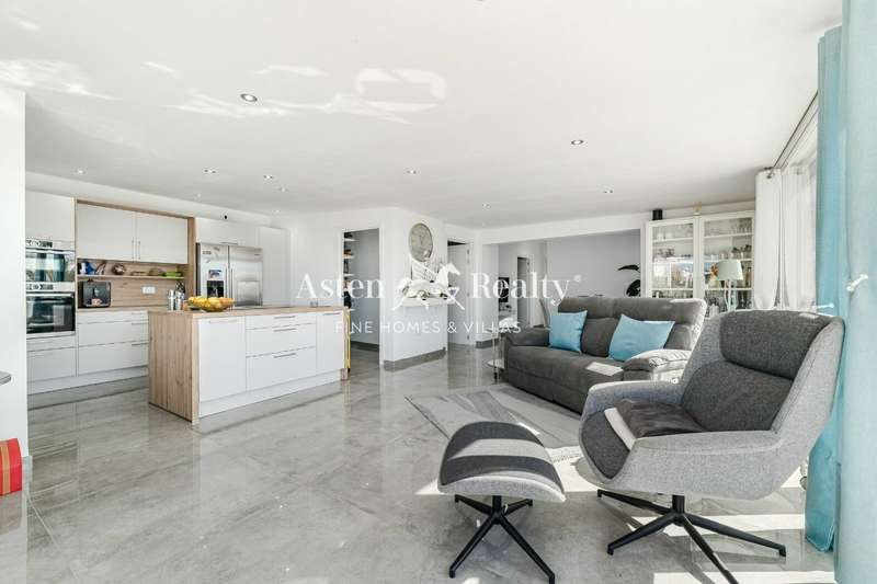 •? ?Modern kitchen open to the living room, fully equipped with high-end appliances.