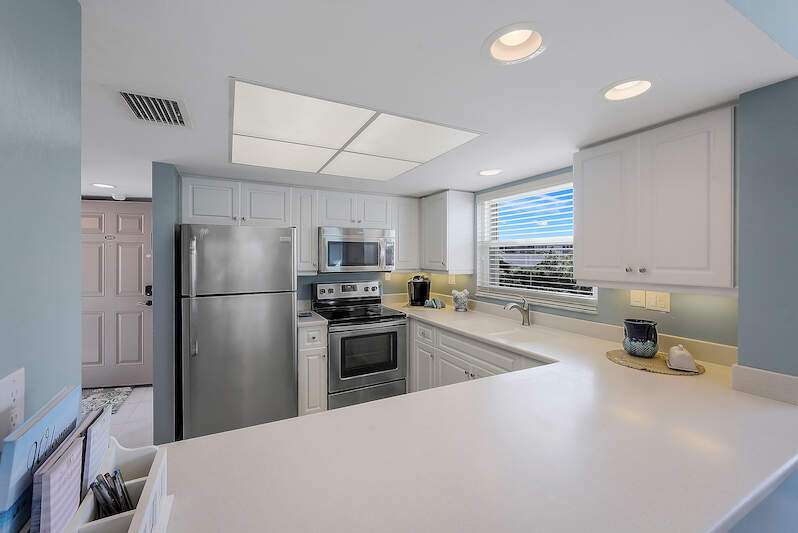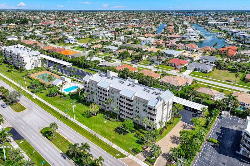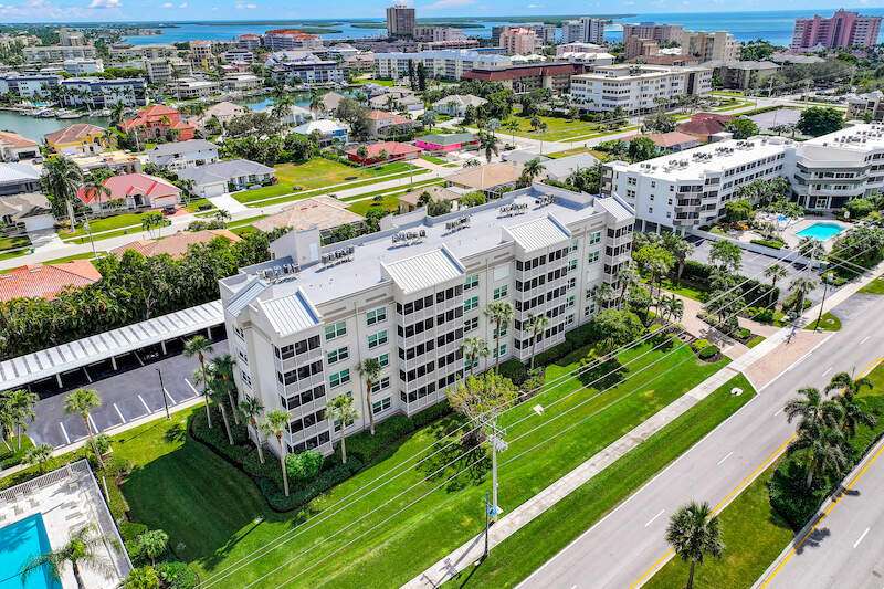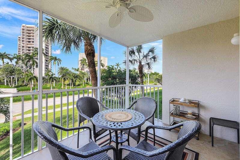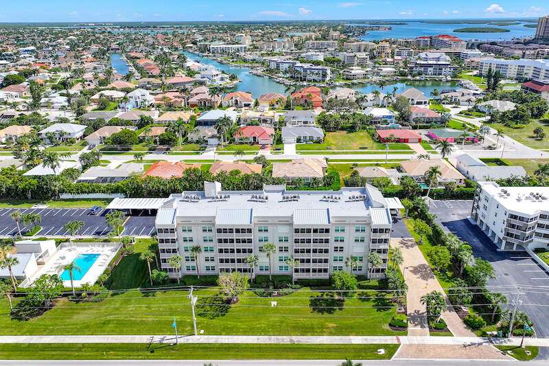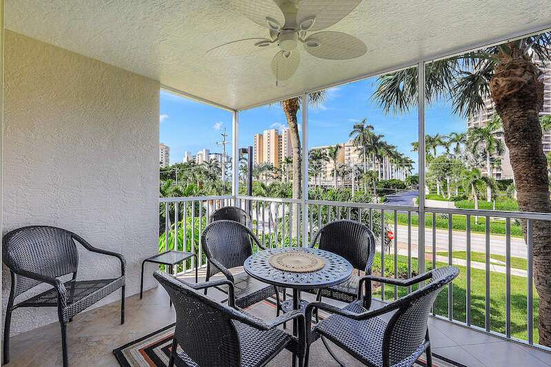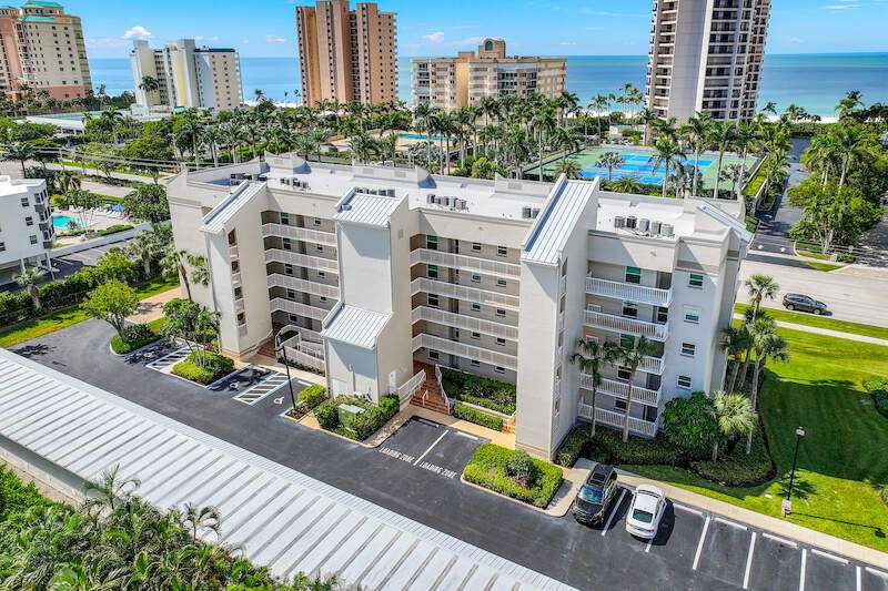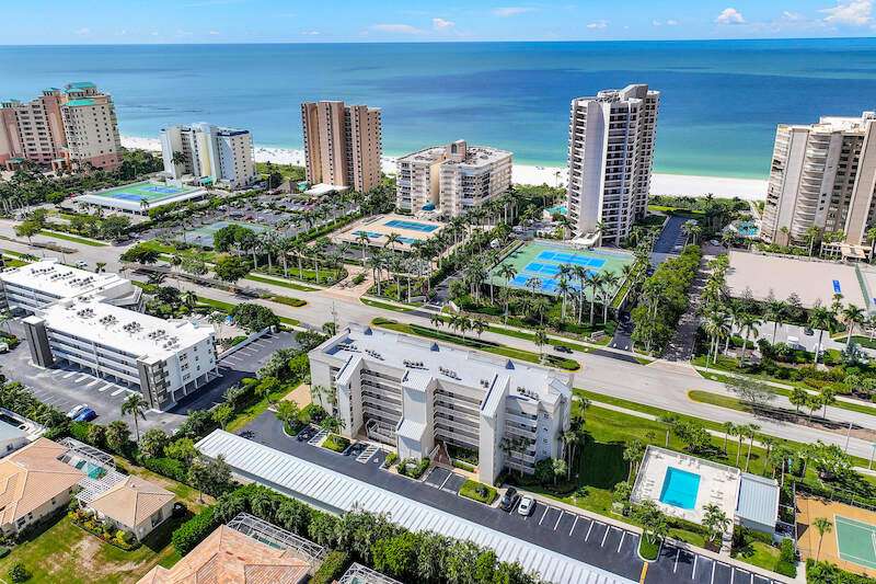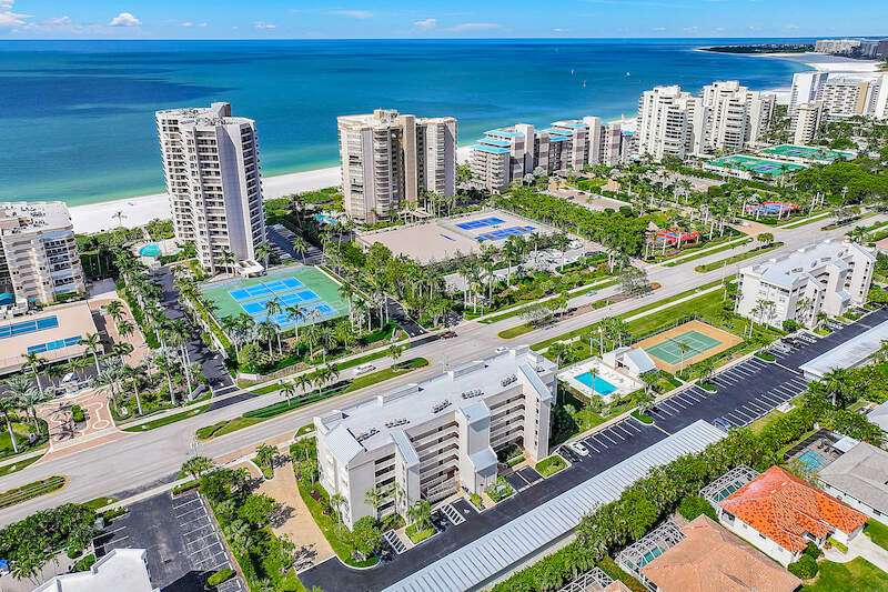 This rare 3-bedroom end unit condo, steps from Marco Island's famed crescent beach, is the perfect investment or second home! A prime location just two blocks from South Beach access and three blocks from Marco Walk puts you in the heart of it all - restaurants, shops, and entertainment are just a stroll away. This beautifully appointed, turnkey unit allows for weekly rentals, maximizing your investment potential. Inside, find updated bathrooms, a spacious kitchen with coastal white cabinets, and a generous layout perfect for everyone. Step outside to enjoy sunrise coffee on your expansive 15x12 east-facing lanai, bright & cheerful days thanks to south-facing windows, and sunset cocktails on the screened west-facing lanai. The community offers a heated pool bathed in day-long sun, tennis, pickleball, BBQ areas, and an elevator for your convenience. Investors will love the weekly rental potential, lack of assessments, impact glass, no storm damage (plus an engineer's study for peace of mind!),meticulously maintained and HOA fees that include cable, internet, water, and public insurance. With an assigned carport and storage for beach toys, island life is a breeze. Don't miss this incredible opportunity!