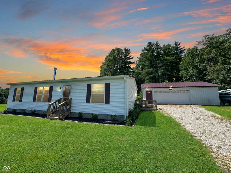 Simply the best of Country Living with this 3 bedroom, 2 bath manufactured home on 2 acres and just minutes away from French Lick Springs, West Baden Resort, and a short drive to Patoka Lake. With a large living room and a new wood burning stove, eat-in kitchen, stackable washer and dryer stays. The detached 3 car garage has plenty of storage, seperate area for the office that is already built with electric and internet, just no water. Updates include a new roof on house and garage, wood burning stove, open patio, firepit, 2 Mulberry, 1 Peach, 3 Cherry, and 1 Persimmon tree plus a grape arbor, to include raspberries and blueberries . This home is offered on a first come first-served basis.