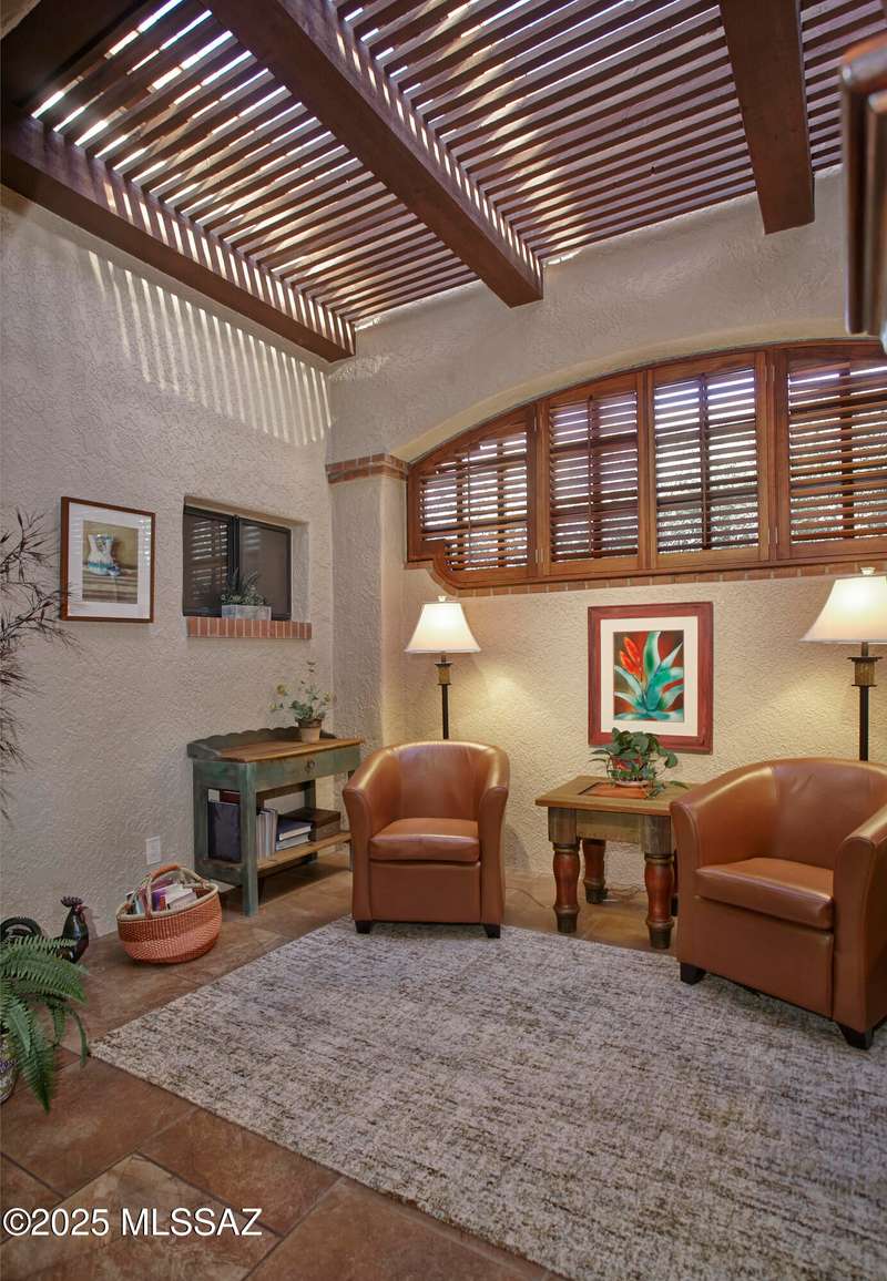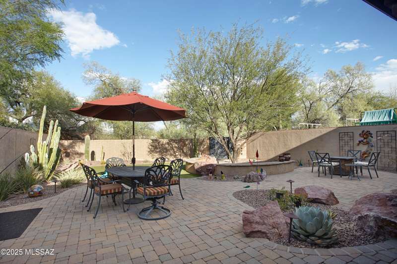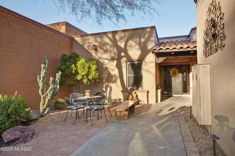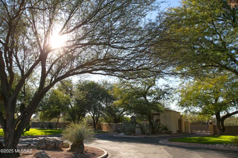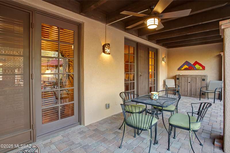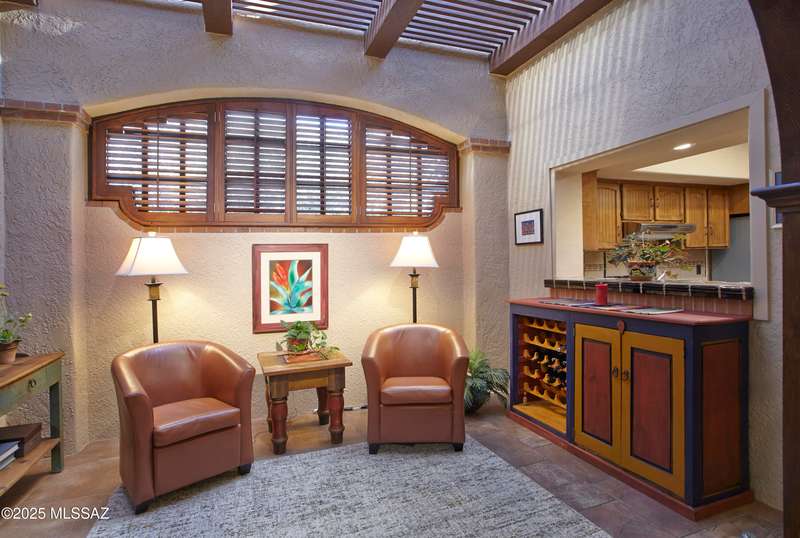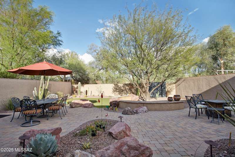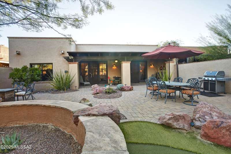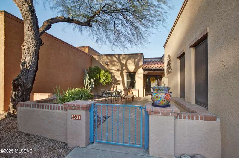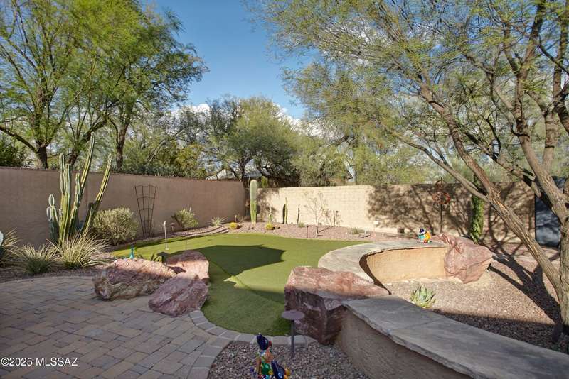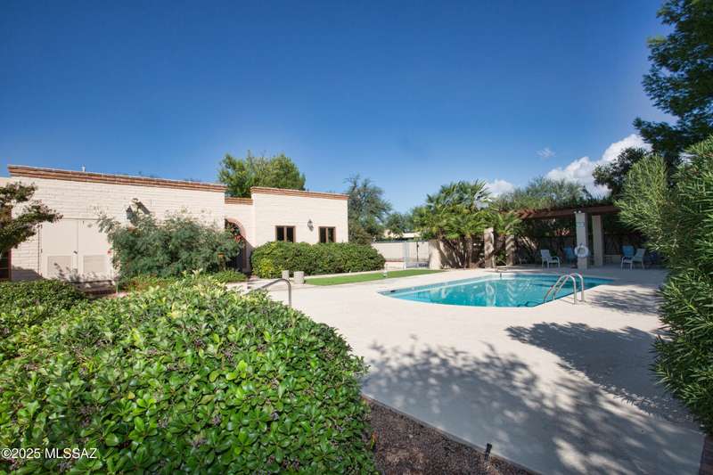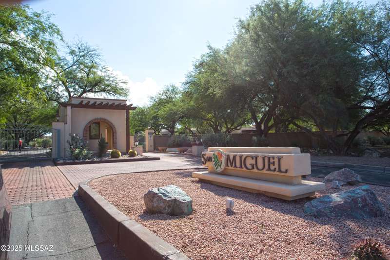 Gated San Miguel! A charming enclave of 40 homes located in the heart of Central/North Tucson. This home is located at the rear of the community, has a wonderful courtyard gated entry, boasts 3 bedrooms and 3 en-suite bathrooms. The entry, living & dining room have stunning wood beams and a fireplace with a live edge, hand made mesquite mantle, and provide a full view of the large rear yard (and putting green). Solid masonry stucco construction, built by David Baird. Recent upgrades include Anderson windows, 3 tinted skylights, new hot water heater, off-the-wall twin beds & new water line from house to main. Community has a clubhouse, pool, spa, and tennis & pickle ball courts. Close to TMC, Whole Foods, biking, hiking and ''the loop''.