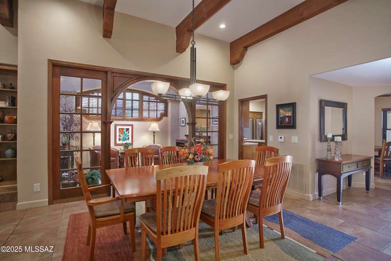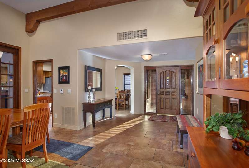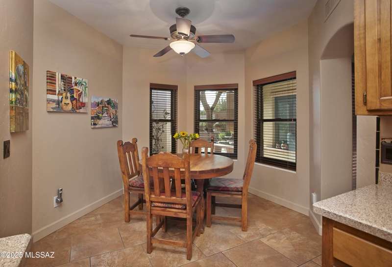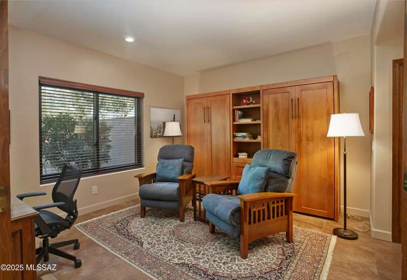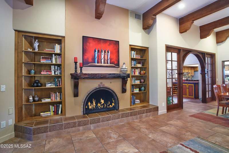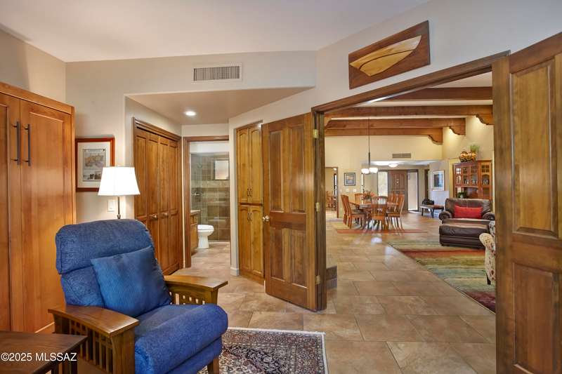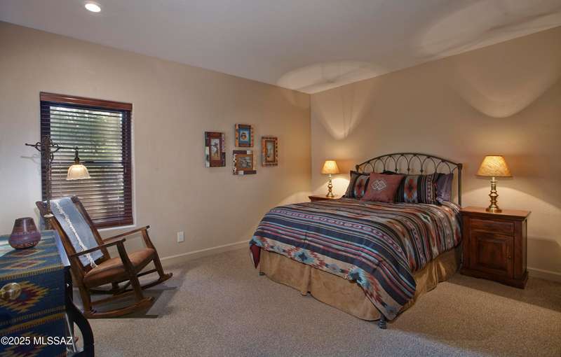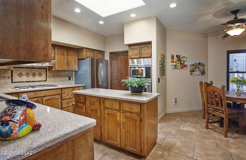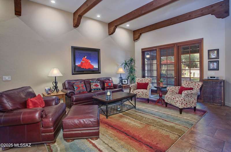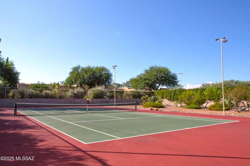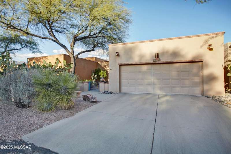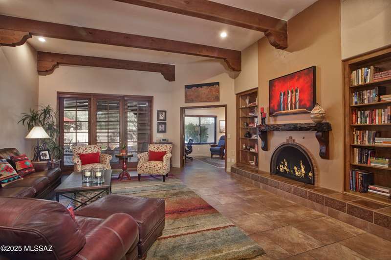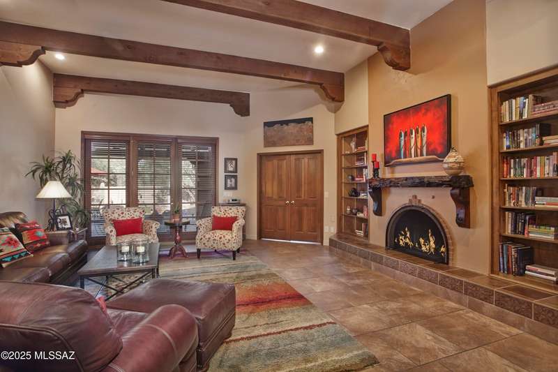 Gated San Miguel! A charming enclave of 40 homes located in the heart of Central/North Tucson. This home is located at the rear of the community, has a wonderful courtyard gated entry, boasts 3 bedrooms and 3 en-suite bathrooms. The entry, living & dining room have stunning wood beams and a fireplace with a live edge, hand made mesquite mantle, and provide a full view of the large rear yard (and putting green). Solid masonry stucco construction, built by David Baird. Recent upgrades include Anderson windows, 3 tinted skylights, new hot water heater, off-the-wall twin beds & new water line from house to main. Community has a clubhouse, pool, spa, and tennis & pickle ball courts. Close to TMC, Whole Foods, biking, hiking and ''the loop''.