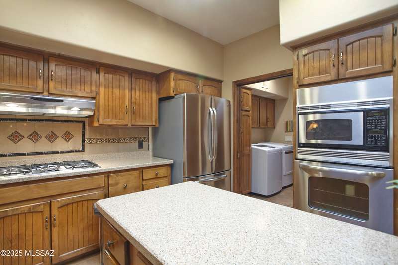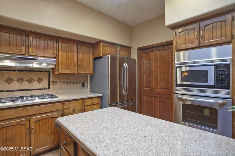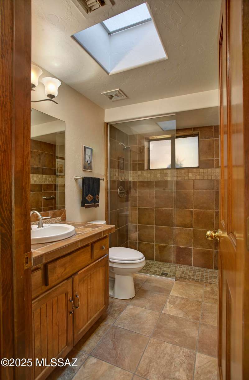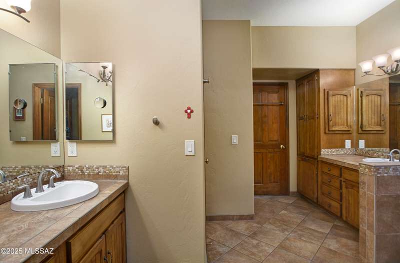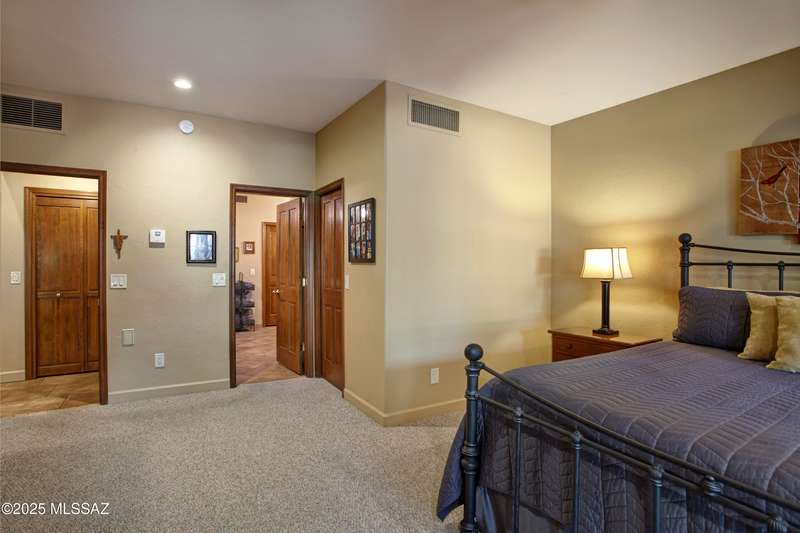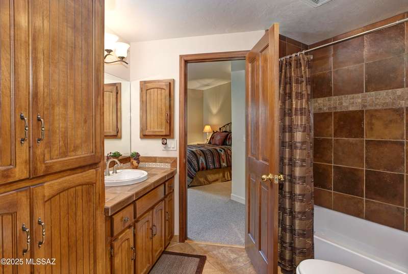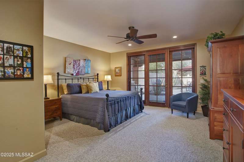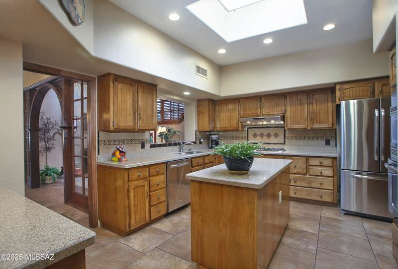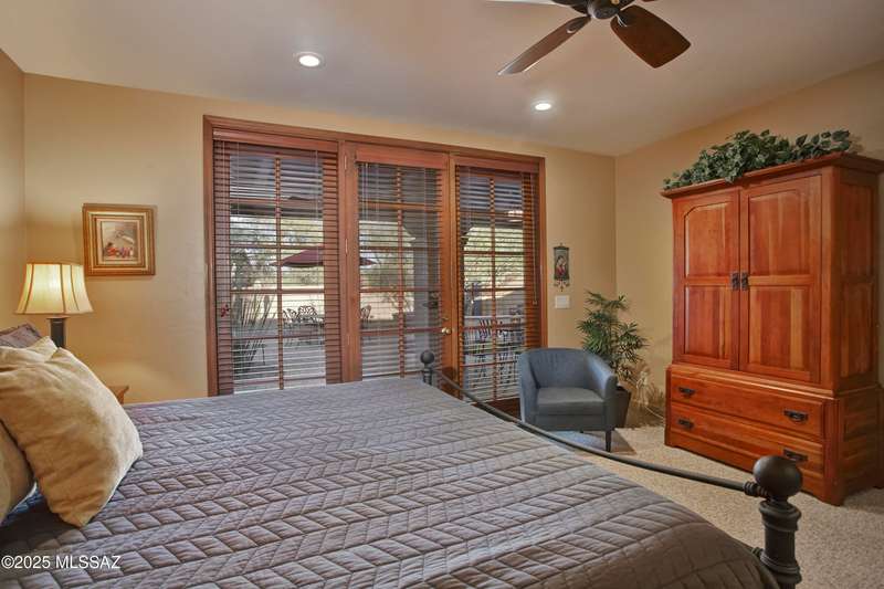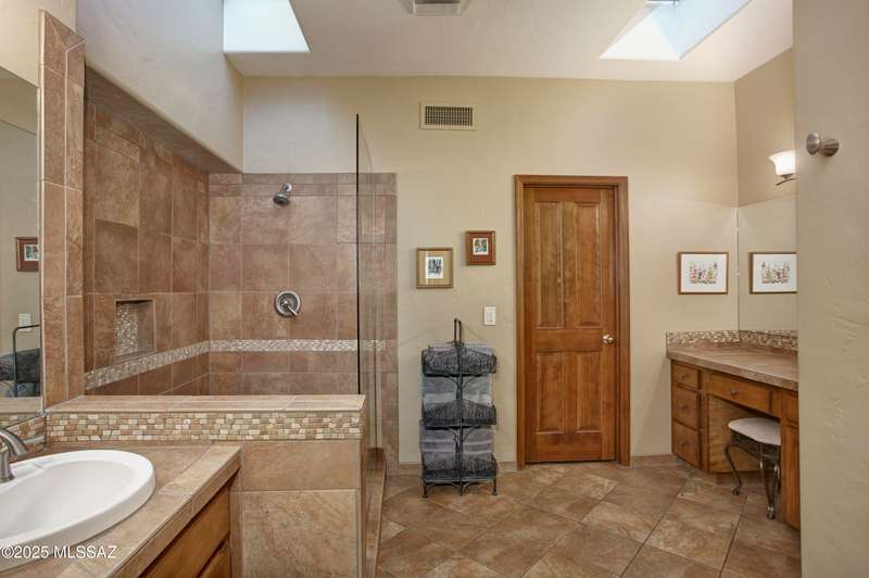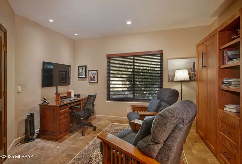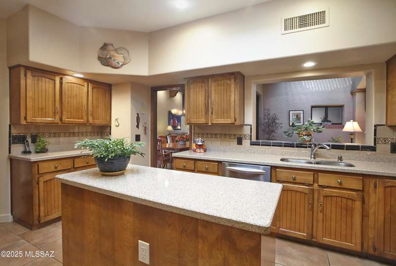 Gated San Miguel! A charming enclave of 40 homes located in the heart of Central/North Tucson. This home is located at the rear of the community, has a wonderful courtyard gated entry, boasts 3 bedrooms and 3 en-suite bathrooms. The entry, living & dining room have stunning wood beams and a fireplace with a live edge, hand made mesquite mantle, and provide a full view of the large rear yard (and putting green). Solid masonry stucco construction, built by David Baird. Recent upgrades include Anderson windows, 3 tinted skylights, new hot water heater, off-the-wall twin beds & new water line from house to main. Community has a clubhouse, pool, spa, and tennis & pickle ball courts. Close to TMC, Whole Foods, biking, hiking and ''the loop''.