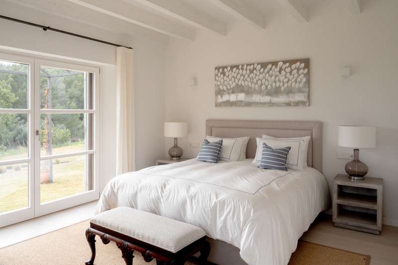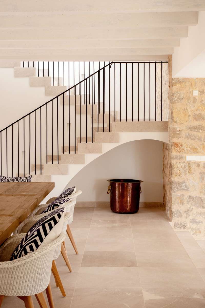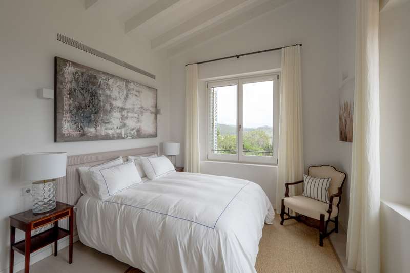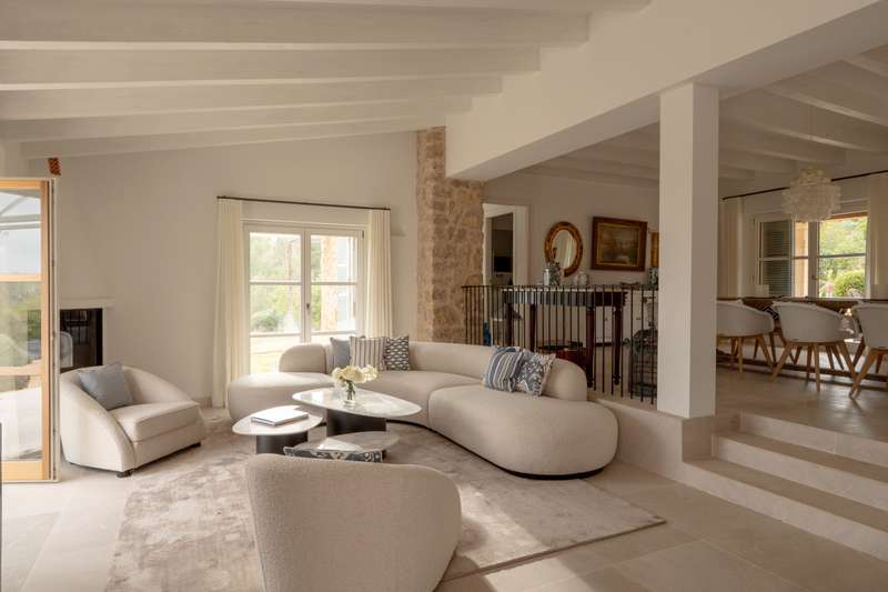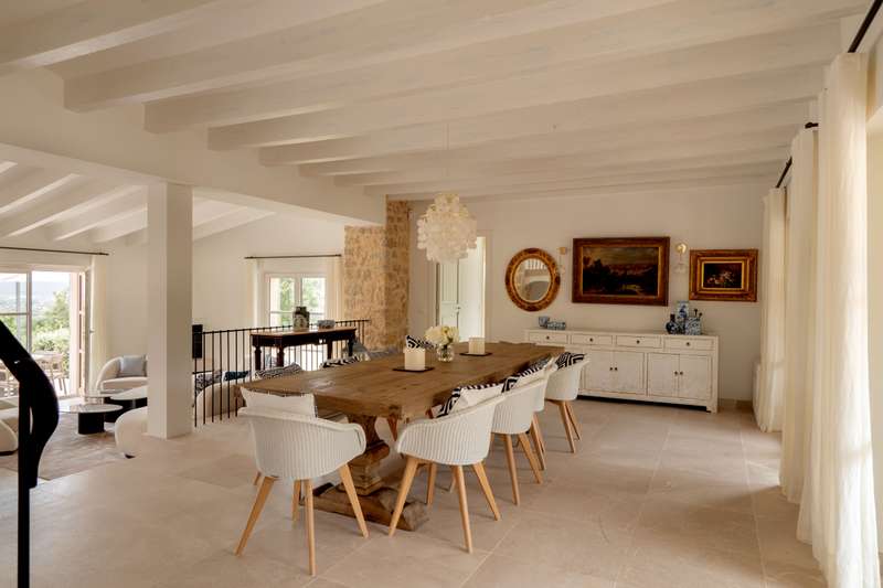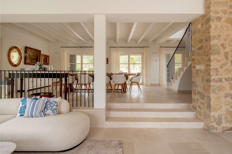 Nestled near the picturesque village of Santa Maria del Camí, this stunning four-bedroom country retreat offers a perfect escape into tranquility. Set on an expansive plot of nearly 15,000m², the property boasts breathtaking views of the Tramuntana mountains, providing both seclusion and easy access to local amenities. Inside, you'll find bright and airy spaces that beautifully blend modern design with timeless elegance. The ground floor features a spacious open-plan living and dining area that flows effortlessly onto large terraces, ideal for enjoying the outdoors. The contemporary kitchen is filled with natural light and offers a central island with lovely views of the garden. Two double bedrooms on this level come with ensuite bathrooms and direct access to the outdoor terrace, making them perfect for guests. Upstairs, two additional bedrooms await, including a generous master suite that opens onto its own terrace, where you can soak in spectacular sea views. Each bedroom upstairs