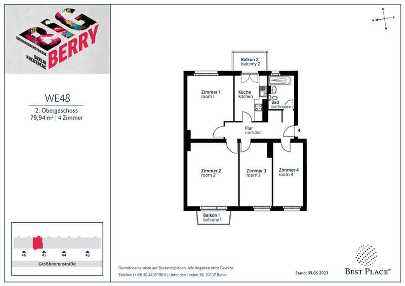 Your investment in the centre of trendy Kreuzberg: with this efficiently designed 4-room flat, you are investing in a place where young people, professionals and families want to live. The flat with approx. 80 sqm is located on the 2nd floor of the six-storey residential building. It has two beautiful balconies, one facing the garden courtyard to the east and one on the opposite side facing Großbeerenstraße. The bathtub in the bathroom provides a wellness feeling. Thanks to its practical layout and size, the flat is ideal for families, couples and singles. Our coveted Big Berry investment project offers investors solidly rented flats in one of Berlin's most sought-after neighbourhoods. The six-storey residential building with four storeys was built in the 1950s and a new top floor was added in 2023. It has 76 flats with one to four rooms and approx. 26 to 108 m². A lift was added as part of the loft extension, which also benefits the existing flats. Big Berry also includes an idyllic garden courtyard and 17 car parking spaces.