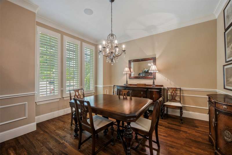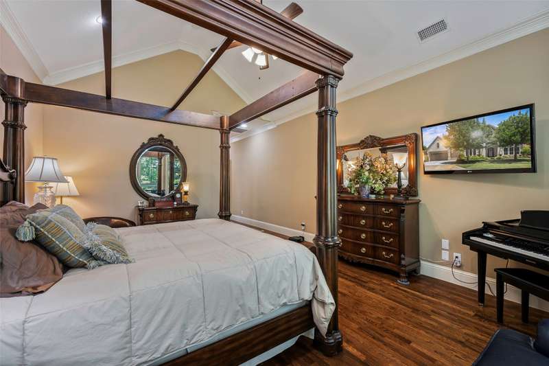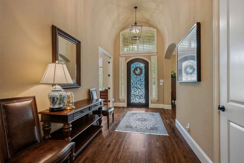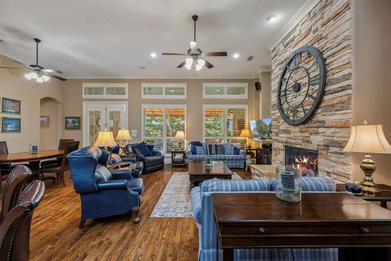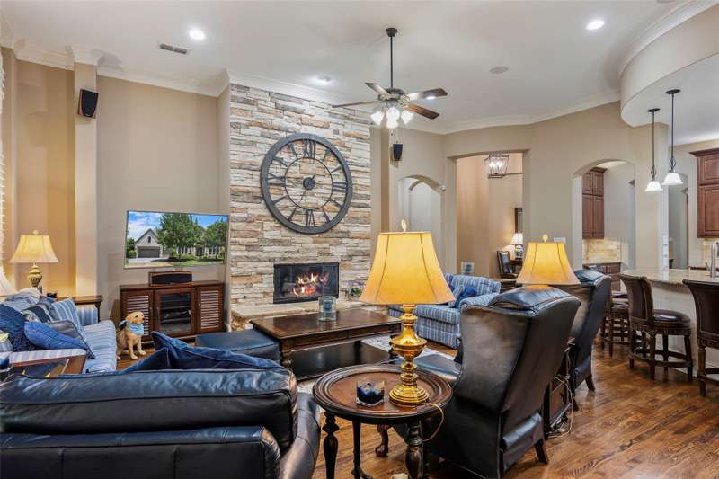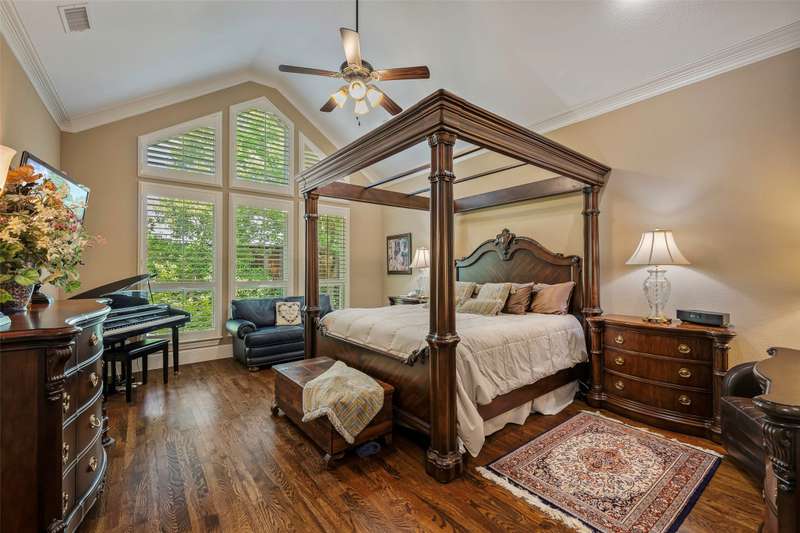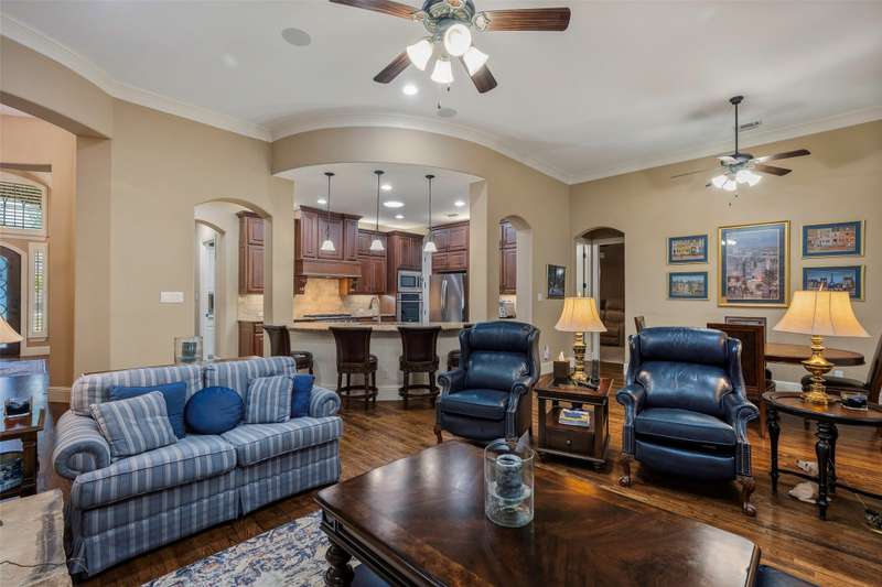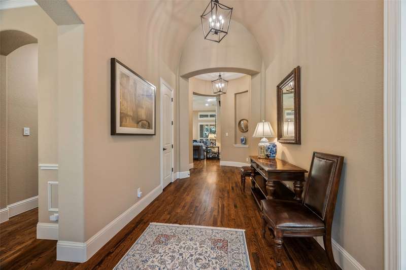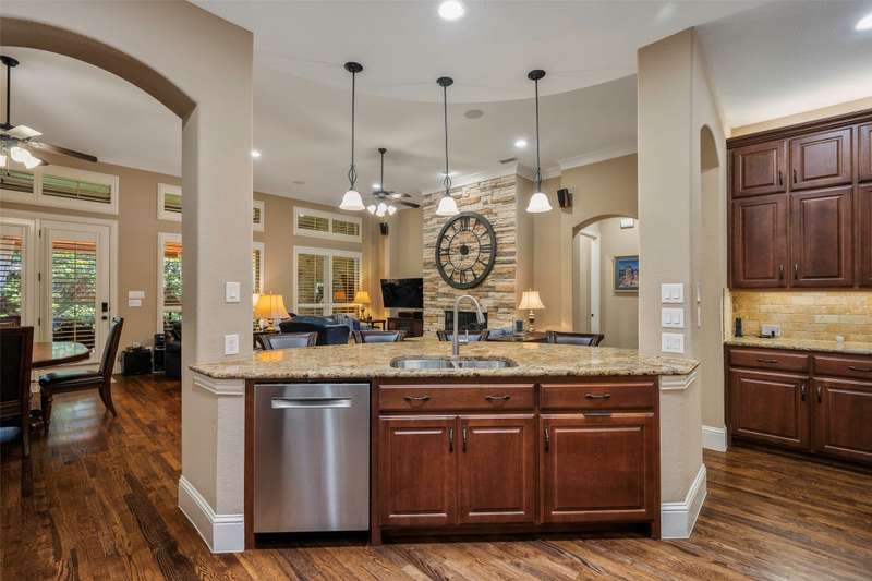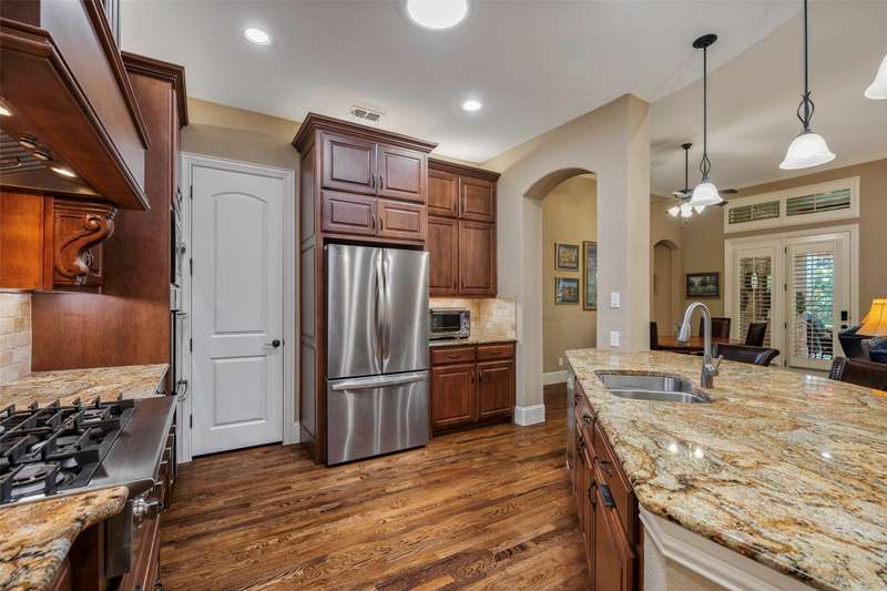 Stunning, one-story, well-appointed home located in one of the top five master-planned communities in America, offering resort-style amenities and a family-friendly environment. This beautifully maintained property showcases rich hardwood flooring throughout the main living areas and an elevation that creates the appearance of two floors, combining timeless elegance with everyday durability. The gourmet kitchen is a chefs dream, featuring granite countertops, an Electrolux 6-burner gas cooktop, double Electrolux ovens, and butlers pantry complete with a dedicated wine refrigeratorperfect for entertaining or casual family gatherings. Designed with flexibility in mind, the home features a dedicated media room for movie nights, as well as an exercise room that can be converted into an extra bedroom, home office, or playroom to suit your lifestyle. The spacious primary suite is a true retreat, boasting a private sitting area with a dramatic cathedral ceiling, creating an airy and relaxing space. The spa-like primary bath features dual vanities, a hydrotub for soaking and relaxation, and two walk-in closet systems offering ample storage. Step outside to a large covered outdoor patio ideal for al fresco dining or lounging. Mature magnolia trees provide privacy and beautiful views, while gorgeous landscaping enhances curb appeal and overall serenity of the space. Residents of this exceptional guard-gated community enjoy an unparalleled lifestyle with access to a grand clubhouse, resort-style pool, fitness center, event spaces, scenic parks, and playgrounds. Its a perfect setting for families, offering security, convenience, and opportunities to connect with neighbors in a vibrant, active environment. Dont miss your chance to own this thoughtfully designed, move-in-ready home in one of the most desirable, master-planned neighborhoods in the countrycombining luxury finishes, flexible living spaces, and outstanding amenities for the ultimate in comfort and convenience.