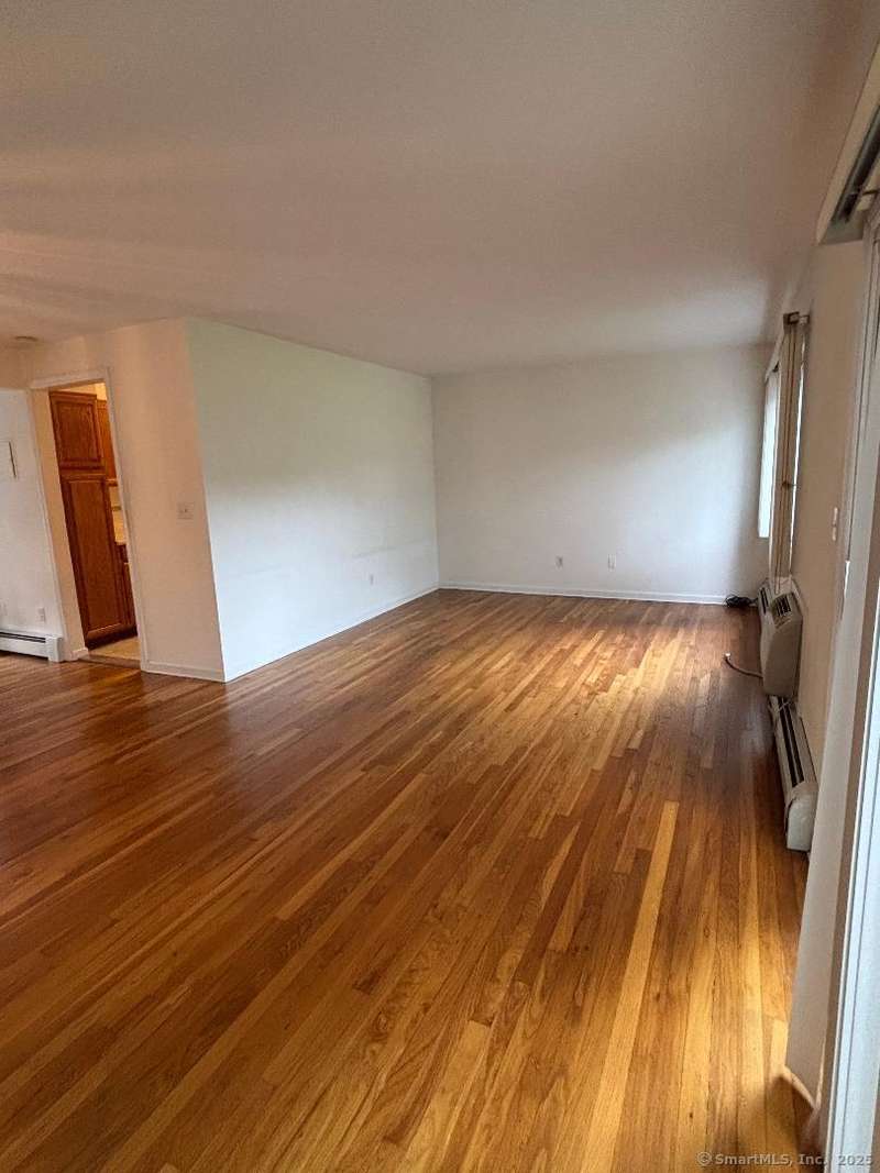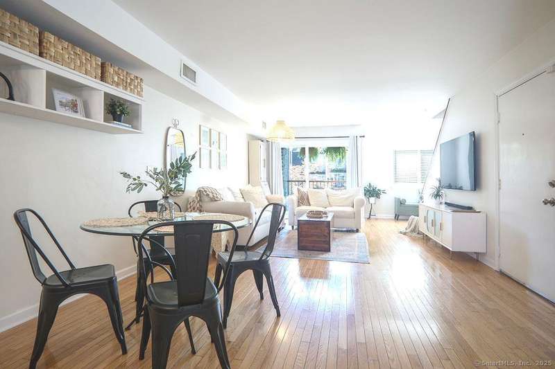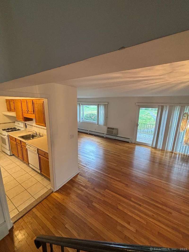 End unit with private entrance. Well equipped kitchen with good number of cabinets. Open living room and dining room with lots of light and slider to your deck. The first floor also has a half of bath, and hardwood floors throughout. Second floor has two good sized bedrooms with great closet space, and a full bath. Two hall closets for extra storage. 5X6 extra storage in building K. Heat and hot water are included in common charges. Estate sale sold as is.