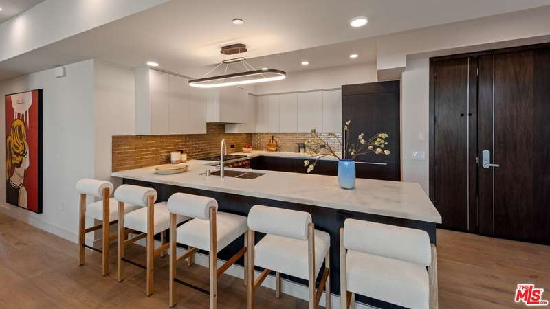Experience the pinnacle of luxury living at Encore Brentwood's penthouse, a 3-bedroom, 3.5-bathroom residence spanning 2,195 square feet that feels like a single-family home. Perched on the top floor, this southeast-facing penthouse residences are designed for those who crave space, sleek hardwood floors throughout an open concept living area with accordion doors leading out to a spacious balcony. The designer kitchen is outfitted with Subzero and Wolf appliances, kitchen island and wine refrigerator blending beauty and functionality to perfection.The primary suite is a tranquil retreat with a walk-in closet elevated by custom German closets and a spa-inspired primary bathroom with a double-vanity and sizable shower. This penthouse residence includes a private elevator to your very own private rooftop terrace with 360 degree panoramic city and ocean views. Encore Brentwood elevates everyday living with resort-style amenities, including 24/7 front desk security, fitness center with lush views, yoga room, pool, spa, pool-side cabanas, outdoor fire pit, putting green, and a community garden. Additional features like a screening room, conference room, and rose garden provide tranquil spaces to retreat or work. Located just a short stroll from San Vicente Boulevard, this penthouse offers effortless access to Brentwood's best dining, shopping, and cultural landmarks, blending Brentwood sophistication with tranquil luxury.