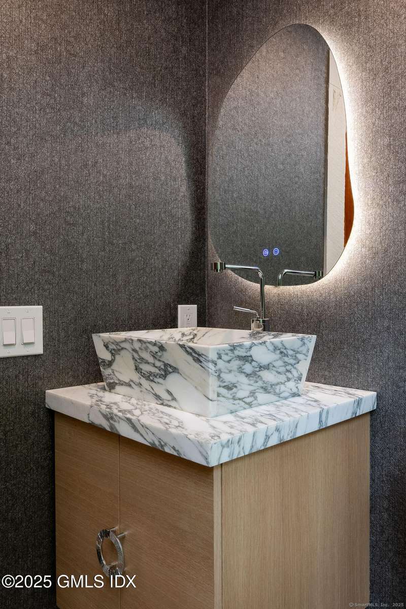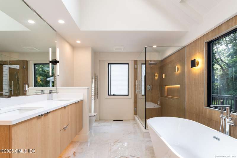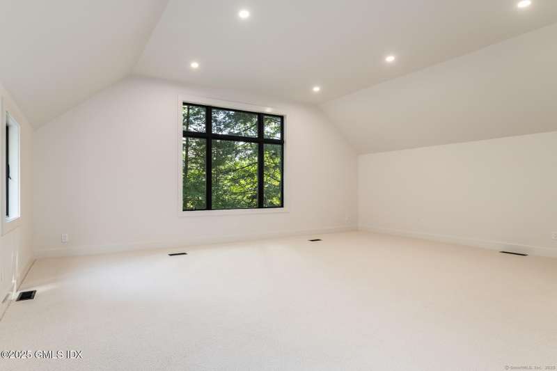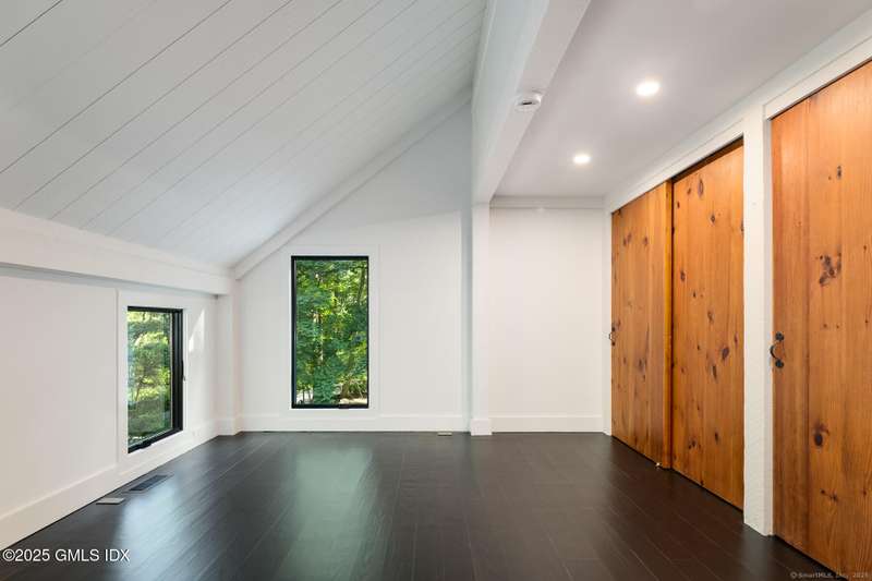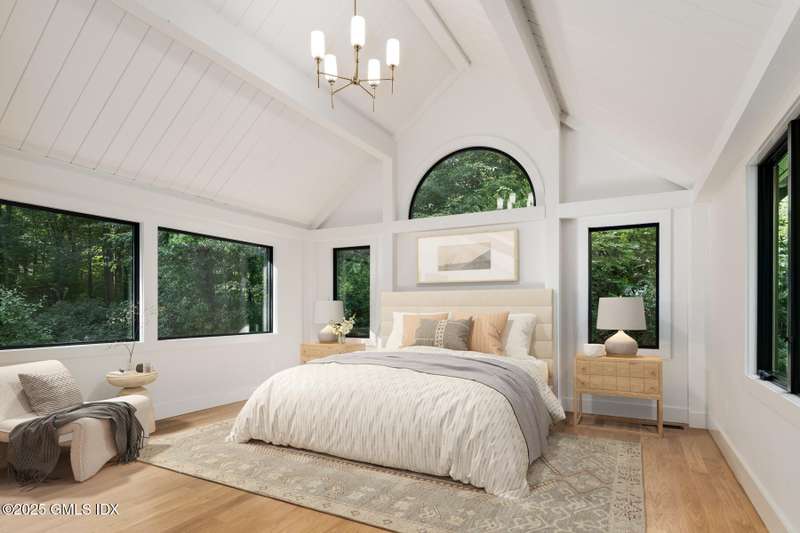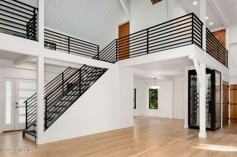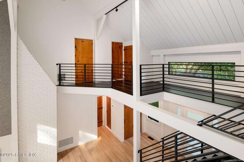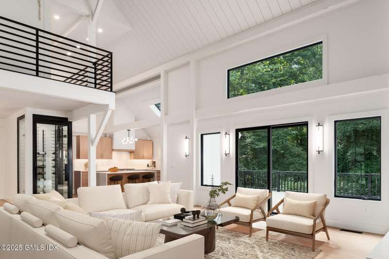 Ideally located near everything, this beautifully updated modern farmhouse-style home offers a perfect blend of comfort and elegance. Situated on a quiet cul-de-sac in Mid Country Greenwich, this private and peaceful residence features a custom design with striking architectural details. The spacious, open-concept living area boasts soaring 24-foot cathedral ceilings, a floor-to-ceiling fireplace, and an abundance of natural light. The gourmet kitchen showcases Quartz countertops with a stunning waterfall island and top-of-the-line appliances, making it ideal for entertaining and daily living. The first floor also includes a formal dining room and an oversized primary bedroom suite complete with a sitting area, fireplace, walk-in closet, and luxurious bath. Upstairs, you'll find two additional bedrooms and bathrooms, all recently updated with modern fixtures and finishes. There's also a large family or playroom, along with a second laundry room. All second-floor rooms are accessed via a spacious wrap-around hall balcony overlooking the main living space. Exposed beams and wrought iron hardware throughout add warmth and character, complementing the natural surroundings of the one-acre wooded property. Enjoy outdoor living on the expansive back deck that spans the length of the house perfect for relaxing or entertaining. Move-in ready and conveniently located close to town and schools, this home is waiting for new owners to enjoy immediately.
