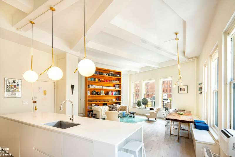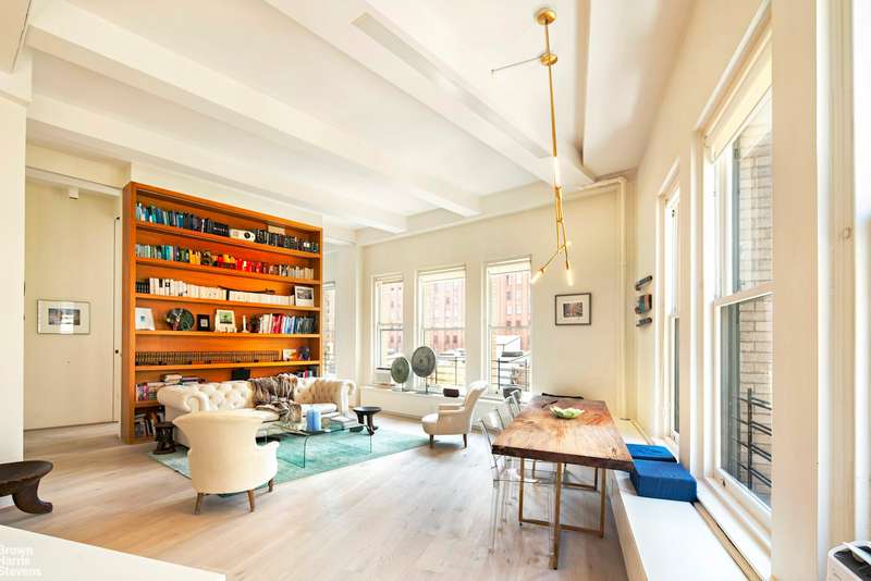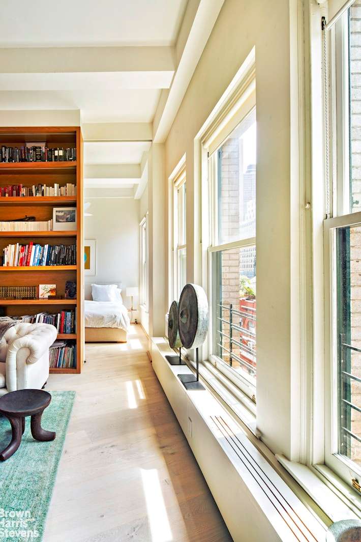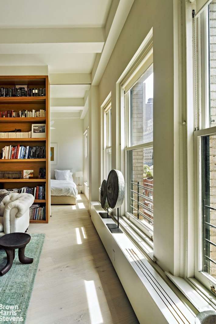 Soaring 12 foot beamed ceilings throughout with dramatic floor-to-ceiling windows that flood every room with natural sunlight and showcase iconic open southern views of downtown Manhattan.