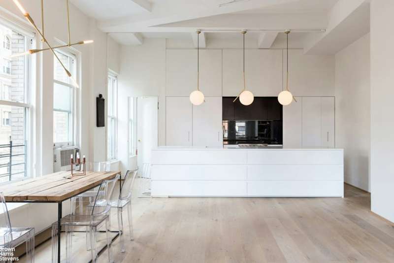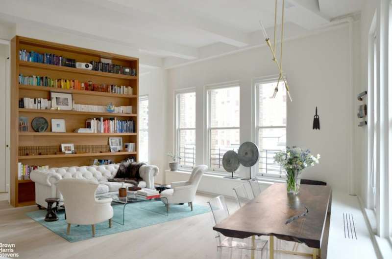 The adjacent dining area is as functional as it is beautiful, easily accommodating a 10-person table beneath striking designer lighting. It is ideal for intimate dinners or larger gatherings surrounded by picture postcard views of some of Tribeca's great architectural buildings.
