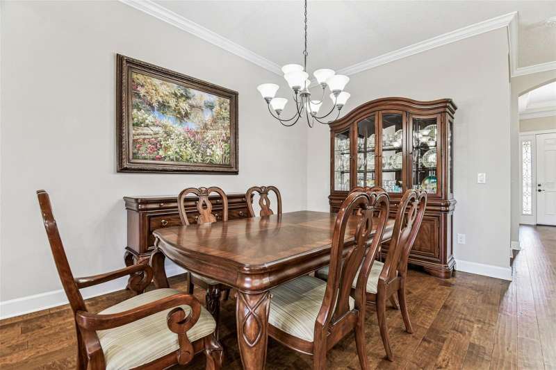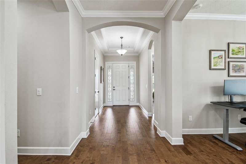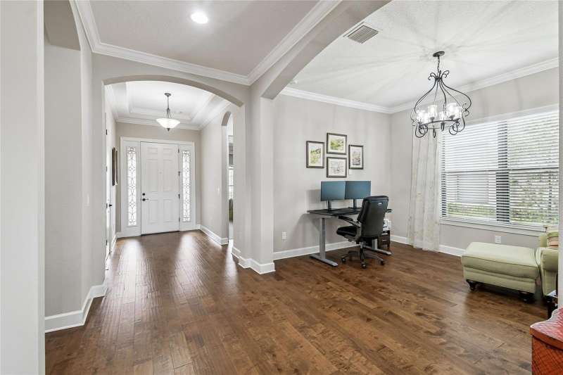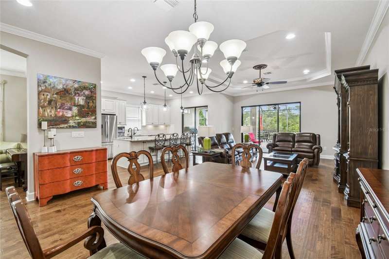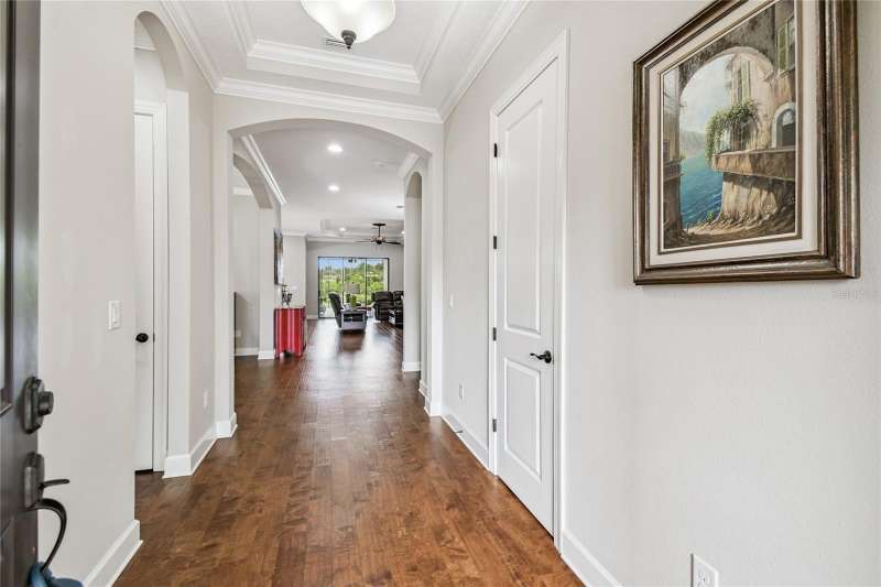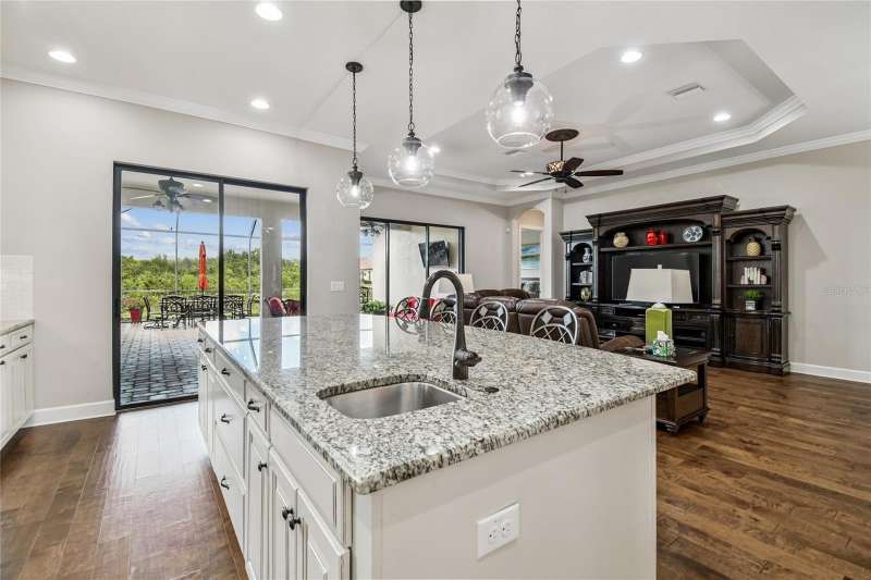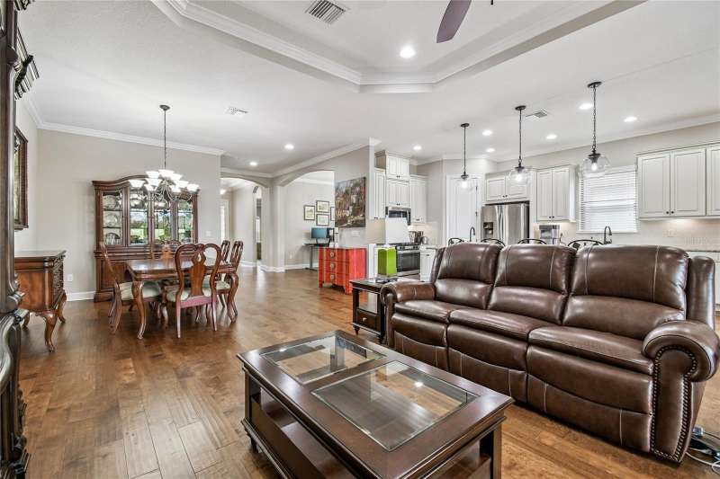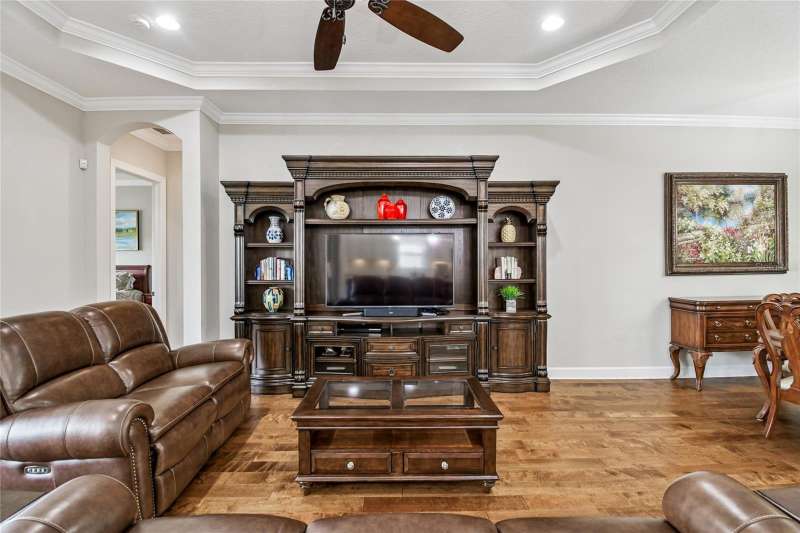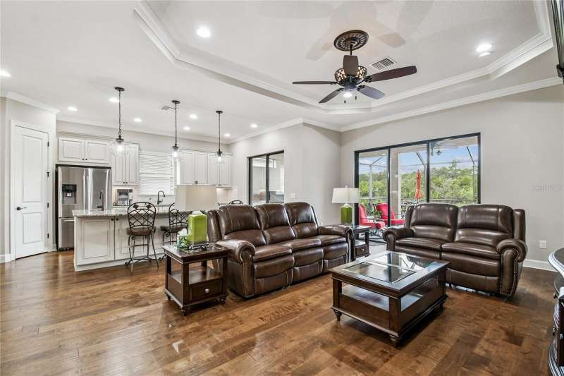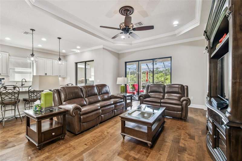 Exquisite home now available in the exclusive GATED resort-style community of Esplanade of Tampa! Built by Taylor Morrison with the finest craftsmanship, this home offers an elegant yet functional layout with countless high-end upgrades! From the moment of arrival, the meticulously maintained landscaping and brick paver driveway welcome you to this immaculately maintained home. Enjoy the ease of INCLUDED LAWN MAINTENANCE in this highly desired community with NO CDD fee! Inside, you’ll find stunning real hardwood floors throughout, crown molding, and upgraded cabinetry that elevate every space. The open concept floor plan features 3 spacious bedrooms, an office/den, 3 full bathrooms, and a 2-car garage with a 4 FOOT EXTENSION and ceiling rack shelving. These large garages are hard to come by! The upscale kitchen is a true standout with upgraded cabinetry, thick granite countertops, a natural gas range, stainless steel appliances, and a UNIQUE DOUBLE SINK DESIGN with an additional sink in the center island; perfect for food prep and entertaining. The expansive master suite offers a luxurious retreat with a massive walk-in closet offering CUSTOM BUILT-INS, double sink vanities, and a large walk-in shower. A spacious laundry room with more custom cabinetry and a utility sink adds everyday convenience. It doesn’t end there! Step outside to an EXTENDED COVERED AND SCREENED LANAI featuring a BRAND NEW FULL OUTDOOR KITCHEN with gas grill, refrigerator, and storage drawers. With plenty of space for both lounging and dining, this outdoor oasis is perfect for year-round Florida living. This home was built to the highest standards with a TANKLESS GAS WATER HEATER, HURRICANE SHUTTERS, in-wall pest control, energy efficiency, and a long-lasting TILE ROOF. Living in Esplanade of Tampa means endless amenities including tennis and pickleball courts, two dog parks, a fitness center, fire pit, pool with cabanas, clubhouse, social events, and more. Conveniently located near I-75, I-275, best hospitals, Wiregrass Mall, Tampa Premium Outlets, and more! And unlike most Esplanade communities, this one is NOT age-restricted and has NO CDD! This immaculate home is truly move-in ready and waiting for you to call it your own.