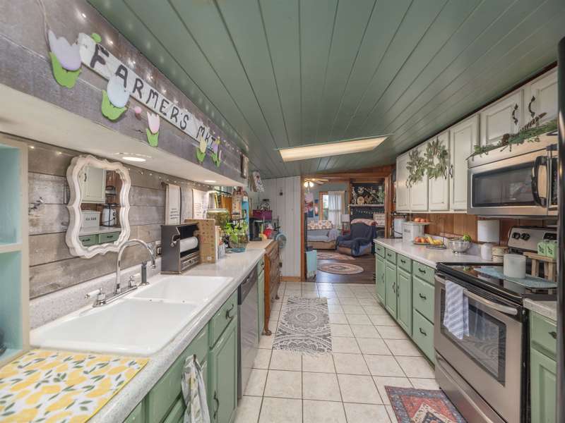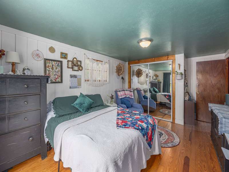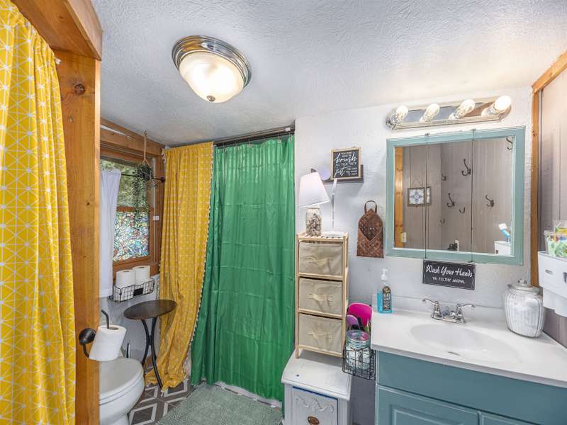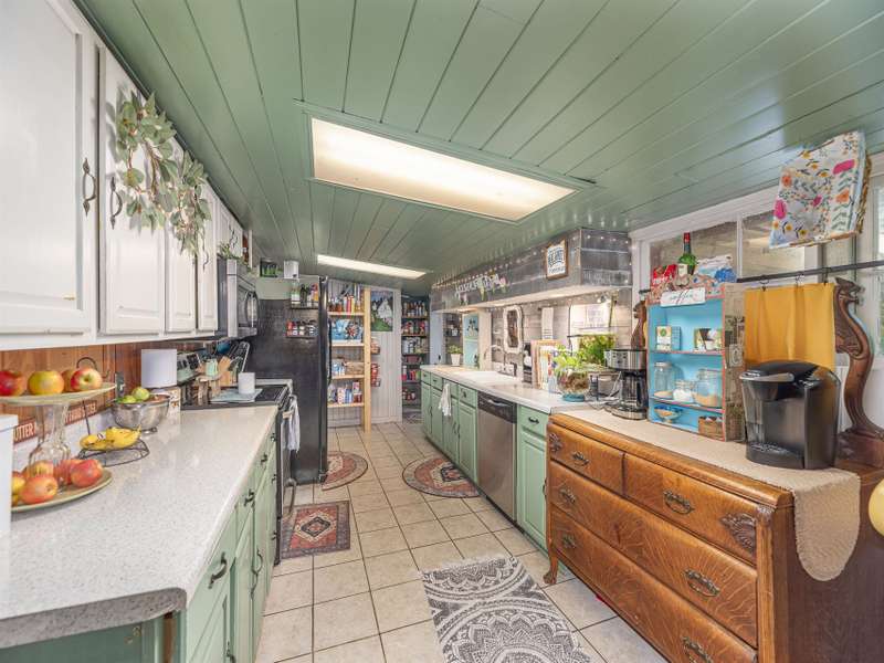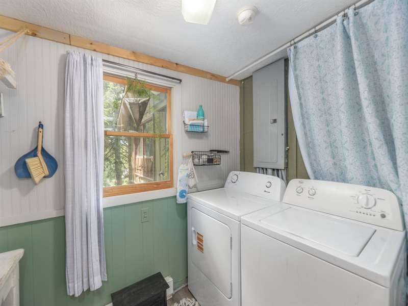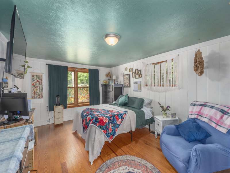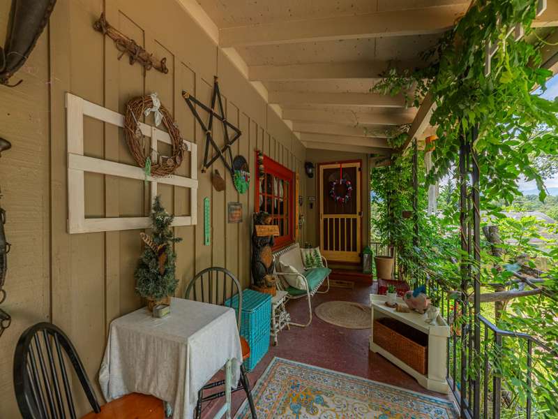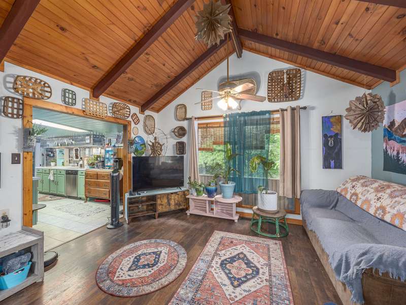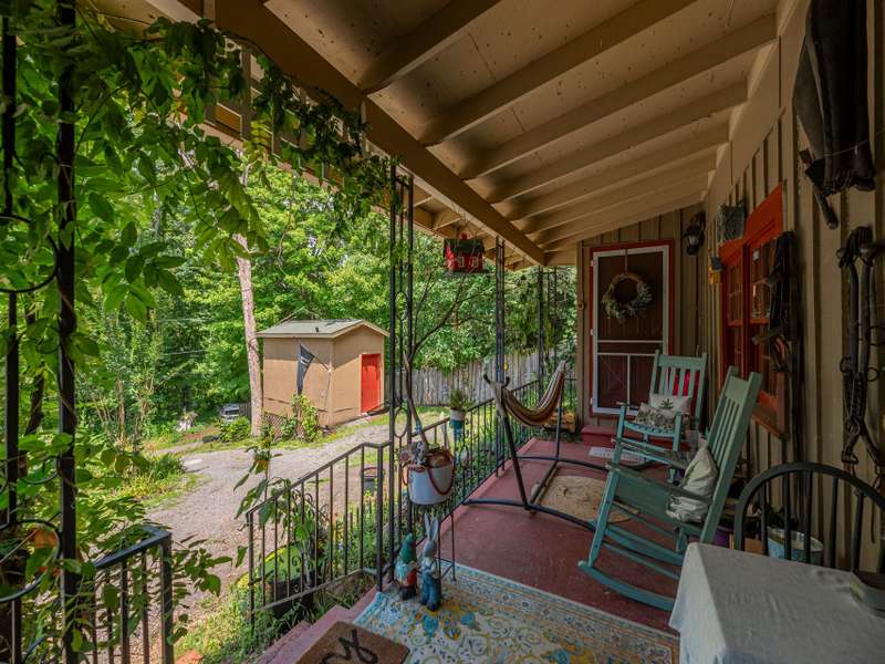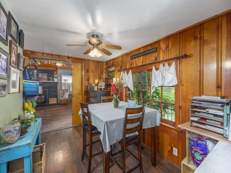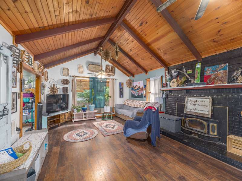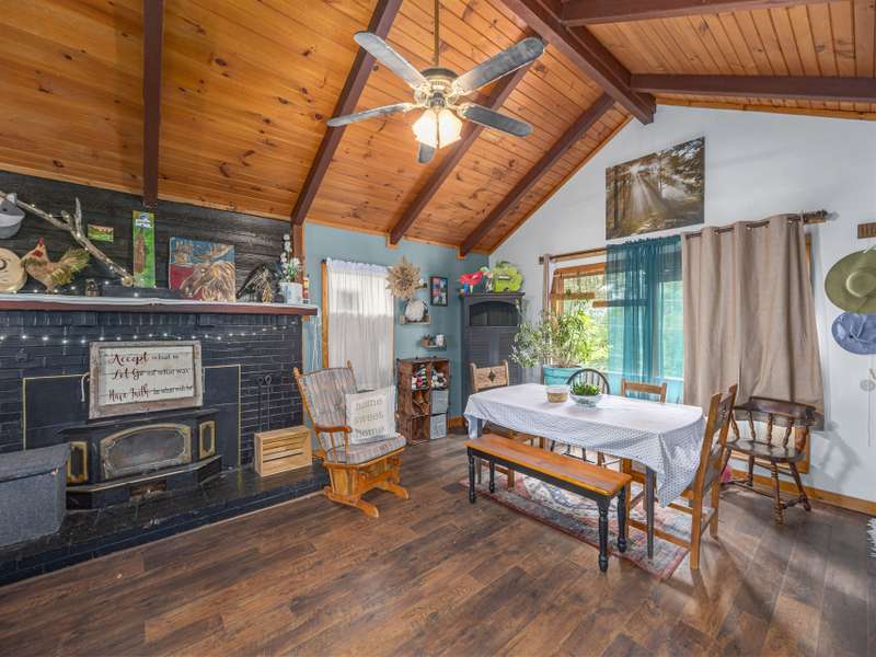 Discover this enchanting in-town Boho-style home, boasting eclectic decor and expansive main-level living. Step onto the beautiful front entrance porch, featuring doors with entry from each side of home, creating a welcoming and unique facade. The great room has a vaulted ceiling, wood burning stove and room for family, friends and entertaining. There is two bedrooms and a third bedroom that was converted to an all purpose dining/work space. Current owners have put down new flooring, replaced heat pump in 2023, new roof in 2021 and replaced appliances. The property offers ample gardening space, a convenient circular driveway and a fully fenced spacious backyard perfect for dogs and play. A functional storage shed is also included for your convenience.