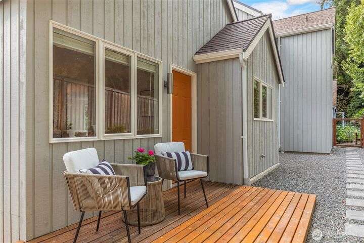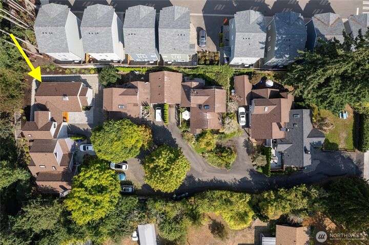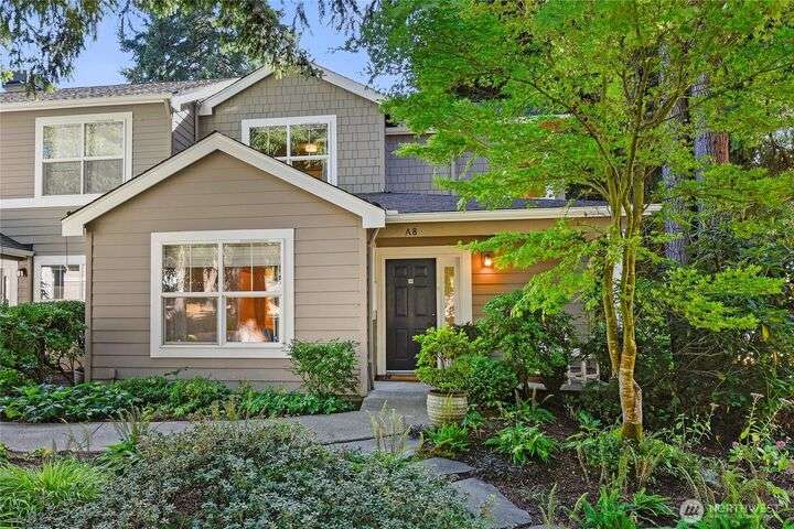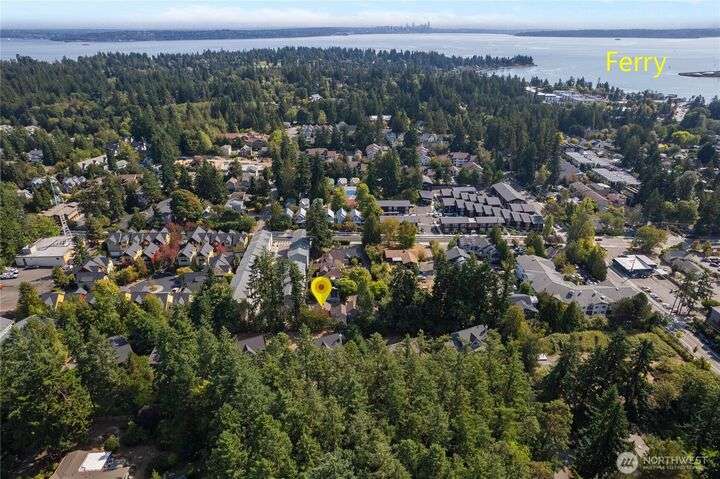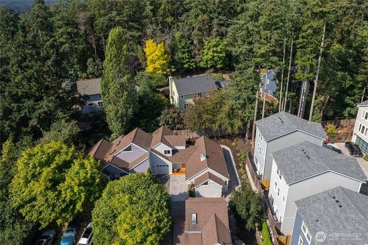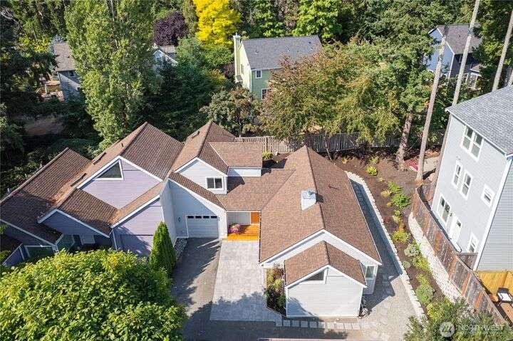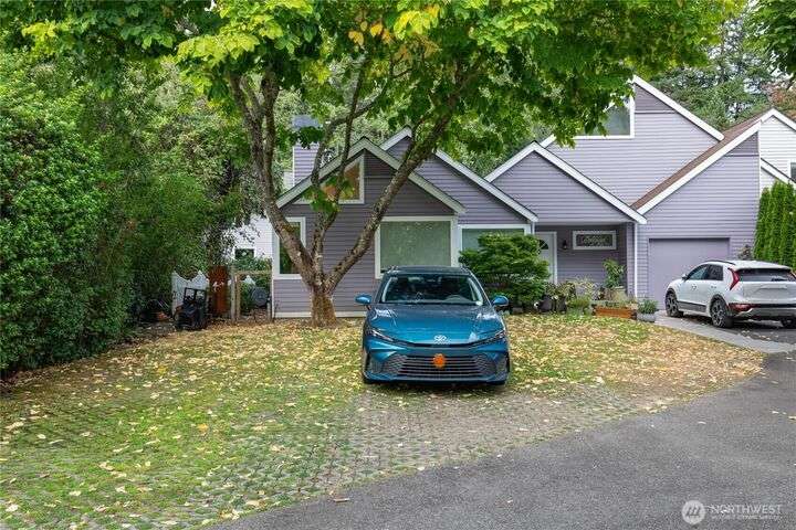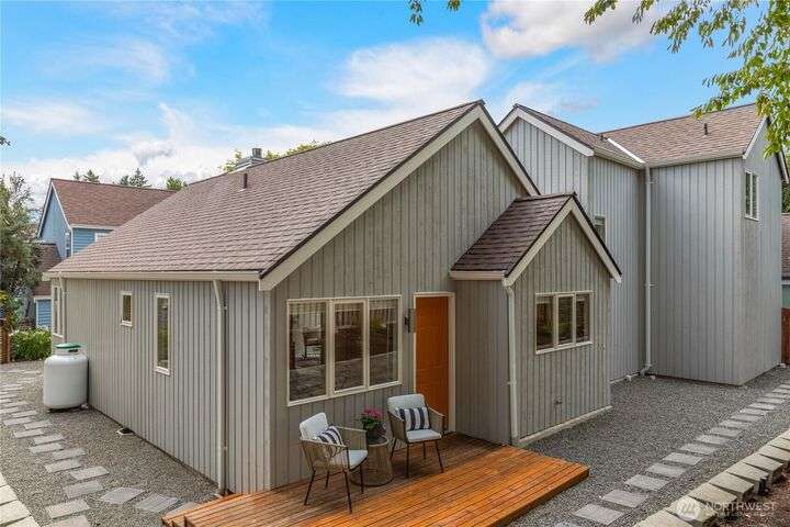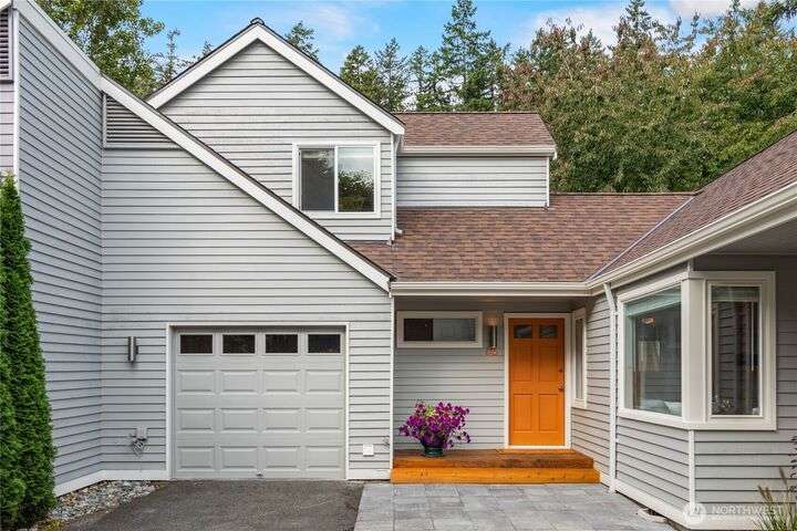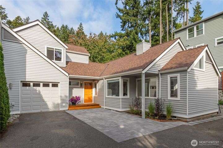 Rare Winslow Cottage close to shops, schools and ferry, yet tucked away in a quiet, private enclave of six zero-lot-line homes. Built by Fairbank Construction, this home has tall vaulted ceilings, skylight + clerestory windows to let in natural light. Desirable one-level living with a primary bedroom and bathroom on the main level. Another bedroom and full bathroom plus loft are upstairs. Thoughtful floorplan with great flow and easy access to the outdoors from the living spaces. Two possible office spaces. Laundry room on main floor. Connected 1-car garage with storage space plus two parking spaces. Private and partially fenced backyard is perfect for pets and gardening. Low HOA dues. New roof just installed.