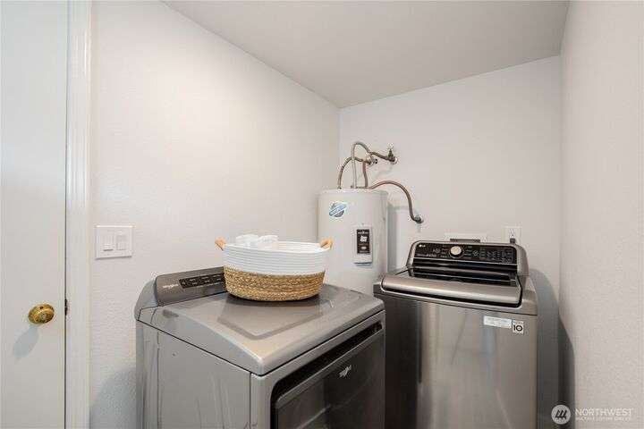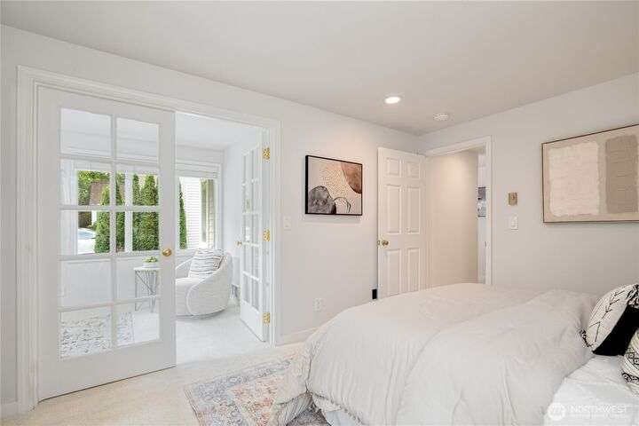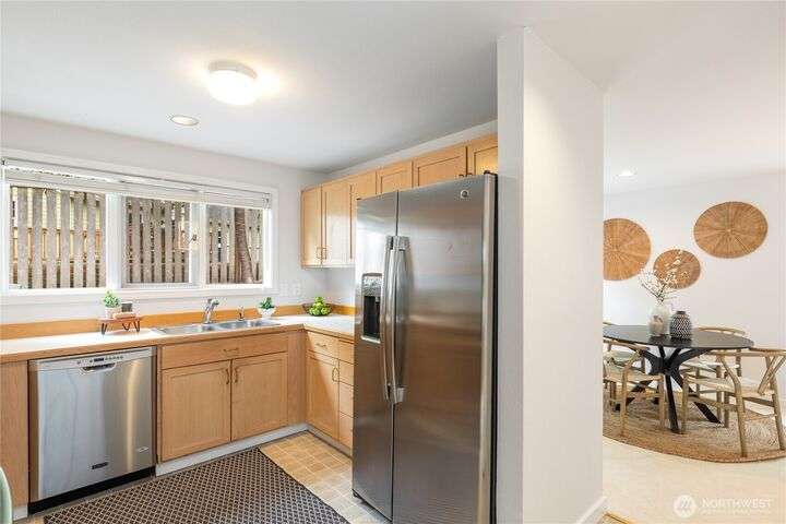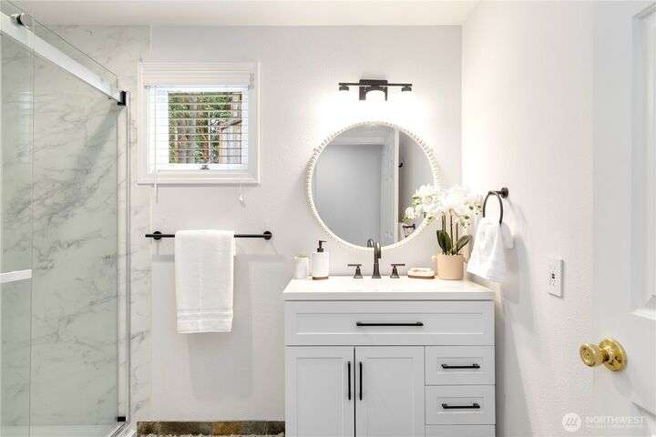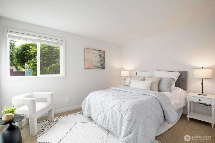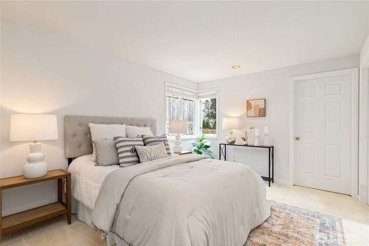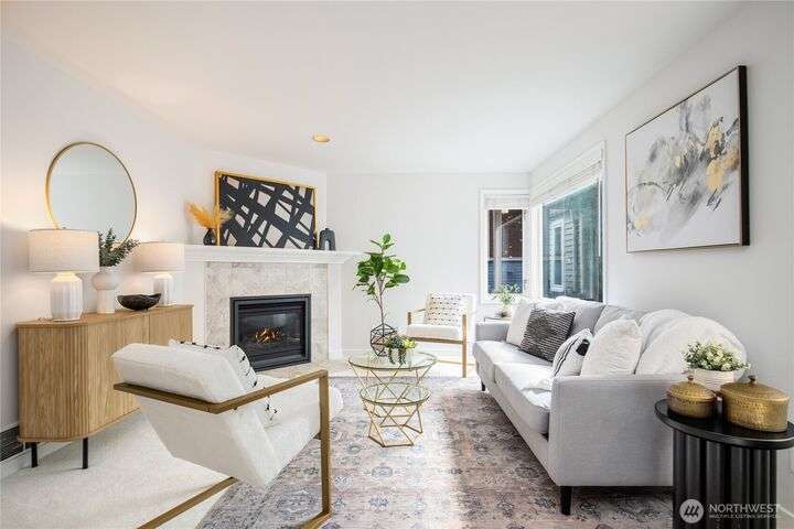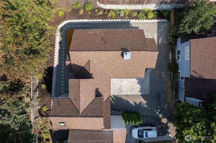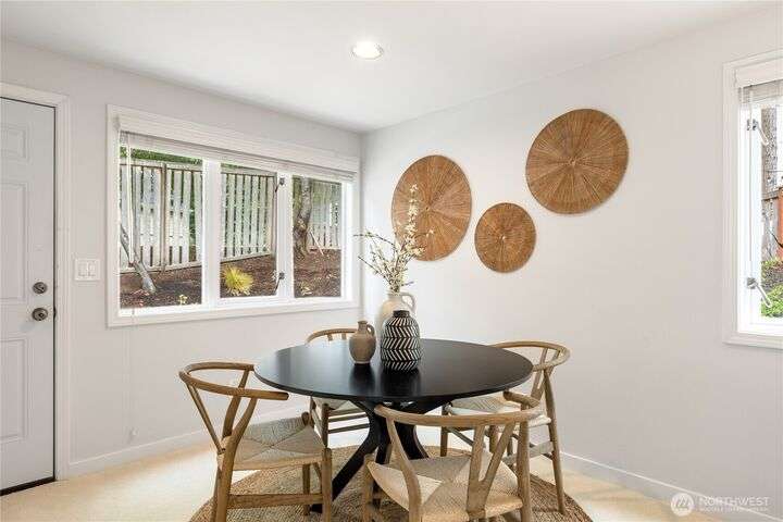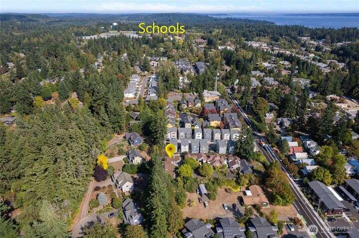 Rare Winslow Cottage close to shops, schools and ferry, yet tucked away in a quiet, private enclave of six zero-lot-line homes. Built by Fairbank Construction, this home has tall vaulted ceilings, skylight + clerestory windows to let in natural light. Desirable one-level living with a primary bedroom and bathroom on the main level. Another bedroom and full bathroom plus loft are upstairs. Thoughtful floorplan with great flow and easy access to the outdoors from the living spaces. Two possible office spaces. Laundry room on main floor. Connected 1-car garage with storage space plus two parking spaces. Private and partially fenced backyard is perfect for pets and gardening. Low HOA dues. New roof just installed.