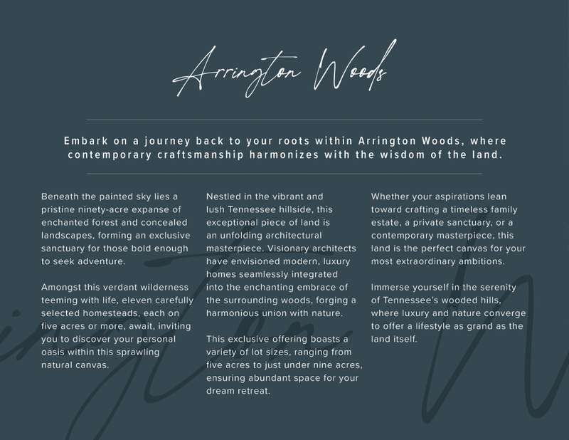 Discover an exceptional opportunity to own 5.33 acres of untouched beauty in the scenic hills of Arrington, Tennessee -- part of the highly anticipated Arrington Woods, the newest and most prestigious gated community in the area. One of just 11 exclusive 5+ acre homesites spread across 90 wooded acres, this lot offers unparalleled privacy and natural charm. Already perked for up to 5 bedrooms, the property is ready for you to design and build the custom home of your dreams. At Arrington Woods, you're free to bring your own builder or select from a curated list of elite, preapproved builders. Perfectly positioned near I-840, Arrington Vineyards, historic Downtown Franklin, and Murfreesboro, this location offers both seclusion and convenience. Arrington Woods is where modern craftsmanship meets timeless landscape--creating a one-of-a-kind retreat.