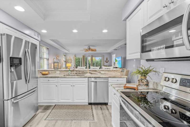 Why wait for interest rates to go down when home prices will just go up? Seller is offering to buy-down the interest rate at 1% for 2 years! Come and walk right into your TURNKEY Florida Oasis ready to enjoy right away! This beautiful end-unit condo spaciously designed, boasting 1,395 sqft will not disappoint with its nautical decor and warm natural light throughout. As you walk in you can see why the end-units are the upmost desirable with the extra space and sunshine kissing each room. Onto the beating heart, The Kitchen, which is enhanced with stainless steel appliances, unique top shelf granite counter tops & breakfast bar, overlooking the main entertaining area making it a breeze to host guests. The owner's quarters are fit for a king and queen, with a view of the water & nature and an en-suit which has been completely/artfully updated. Centrally located, right behind Publix and many other popular businesses, the highly sought after Island Cove Gated Active Community offers comfort in security, fun in its full list of amenities & Waterfront Direct Gulf Access (no bridges) while being one of the BEST bang for your buck when it comes to HOAs. Do you want to have your boat on the property? There are plenty of available docks/boat lifts for lease and options available for sale. *VETERAN FRIENDLY*