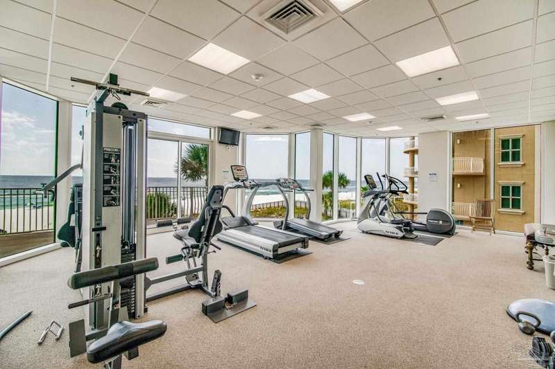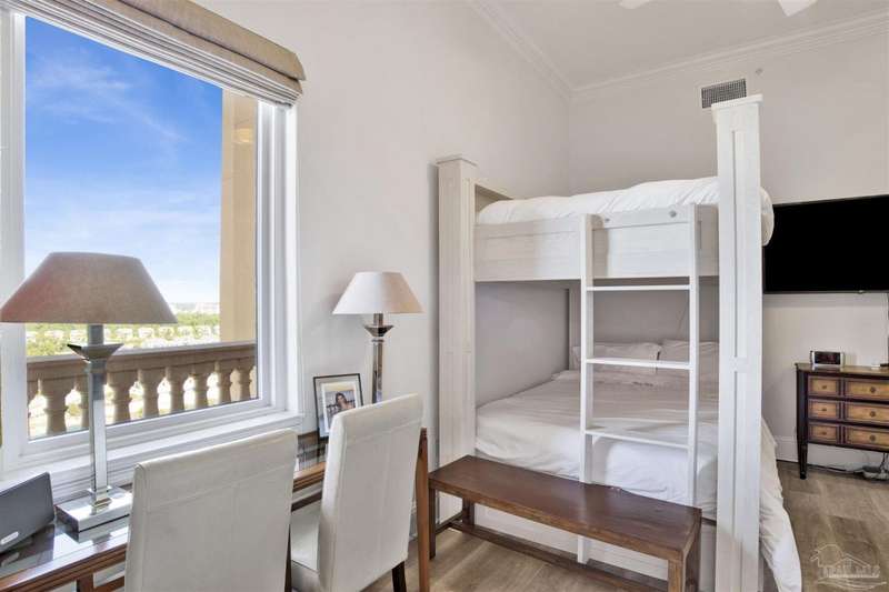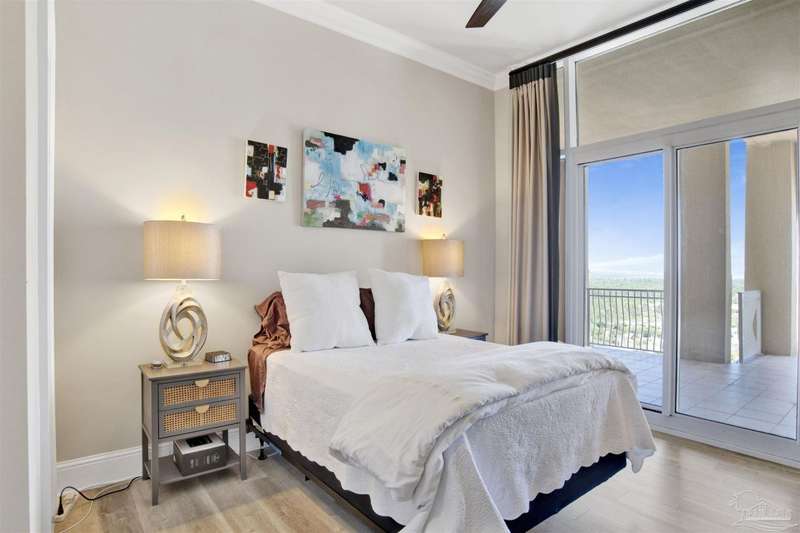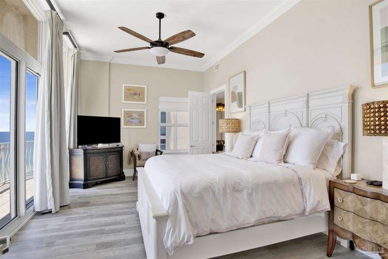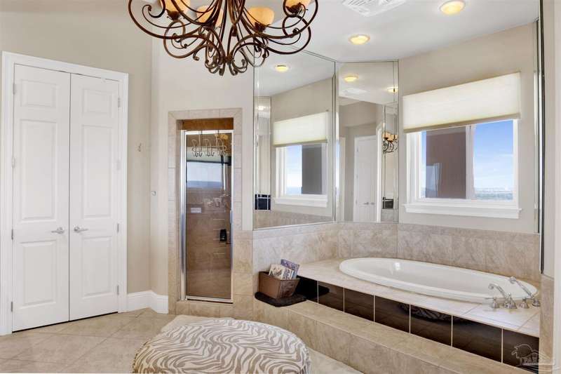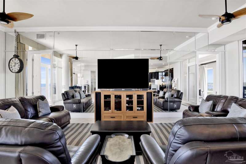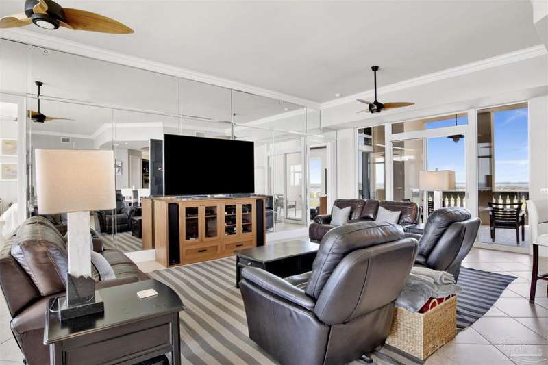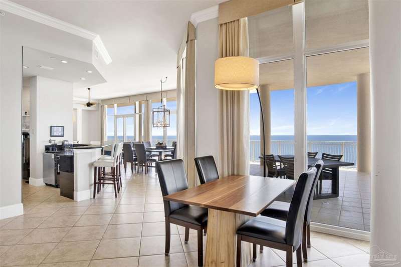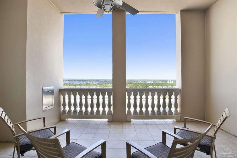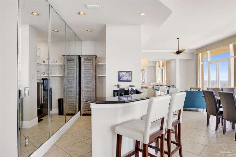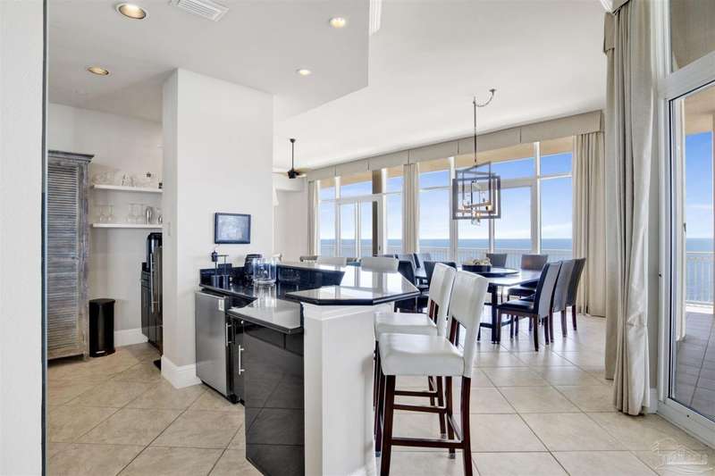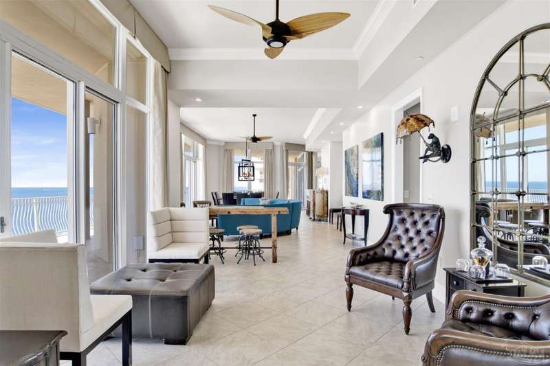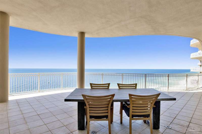 EXPERIENCE THE PINNACLE OF LUXURY IN THIS STUNNING PENTHOUSE OCCUPYING THE ENTIRE 14TH FLOOR OF LA RIVA EAST. BOASTING 4,868 SQ FT OF EXQUISITE LIVING SPACE AND AN EXPANSIVE 2,982 SQ FT BALCONY, THIS RESIDENCE OFFERS BREATHTAKING PANORAMIC VIEWS OF THE GULF AND PERDIDO KEY. This exceptional home features 5 spacious bedrooms, including both Primary and Secondary Gulf-front suites, situated at opposite ends of the residence to ensure ultimate privacy. Enjoy the convenience of a private elevator lobby, abundant storage space, and PREMIUM DEEDED GARAGE PARKING DIRECTLY IN FRON TOF THE BUILDING AND UNDER THE PORTICO. A double garage with storage is also available for purchase across the street (ask for details). Inside, discover a gourmet chef's kitchen with island and large breakfast bar, a fabulous separate wet bar, a large utility room, and spacious living and dining areas with floor-to-ceiling glass with motorized window coverings. Retreat to the Primary Bedroom Suite with its stunning sunrise views, dual walk-in closets, and a spa-like bathroom featuring a luxurious jetted tub and separate tiled shower. All three additional guest bedrooms are spacious with two enjoying lovely panoramic island views, one with private balcony, and the third with two sets of custom bunk beds. La Riva owners enjoy privacy & uncrowded beaches with only 66 rent-restricted units (1-year minimum lease) and 520' of sugar white sands. La Riva EAST is the only La Riva building with a theater room! La Riva owners and guests enjoy the best of amenities including a gulf-front heated indoor pool, outdoor pool and hot tub, and well-equipped fitness center with steam and sauna overlooking the beach. THE VIEWS FROM THIS PENTHOUSE RESIDENCE ARE TRULY A MUST SEE!