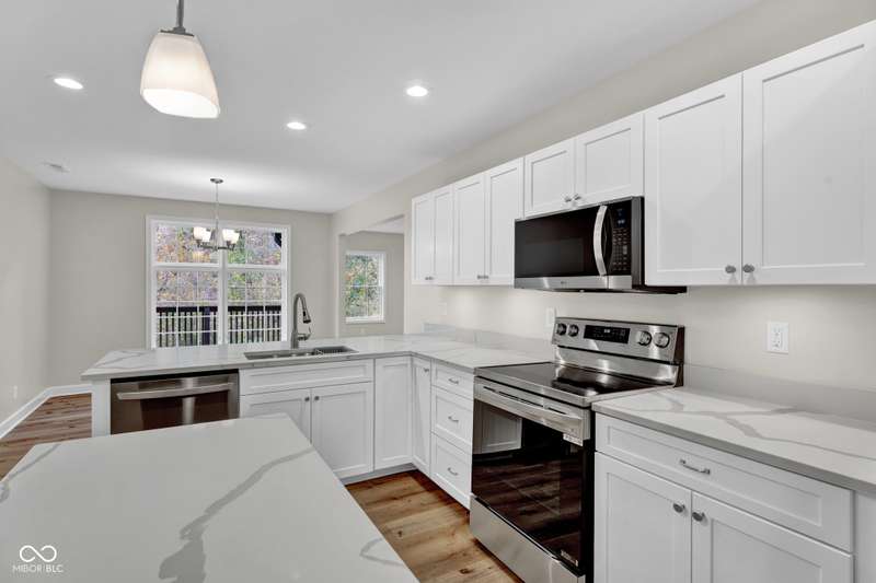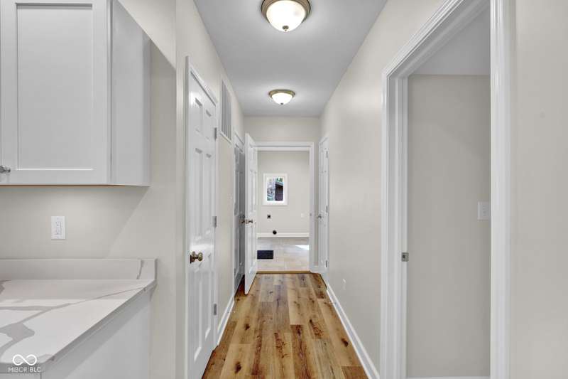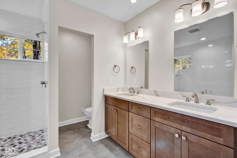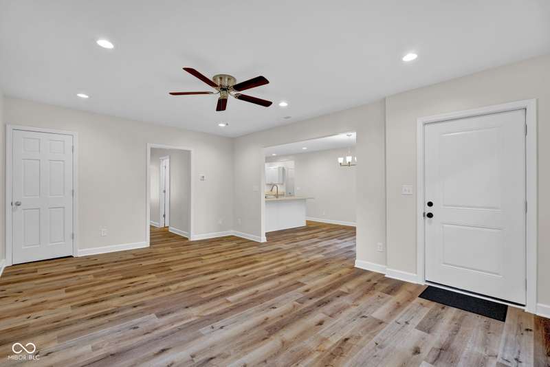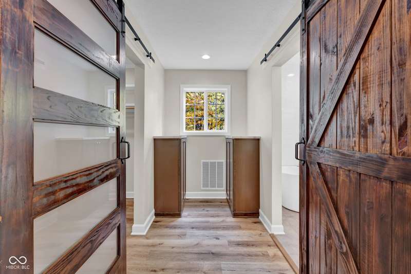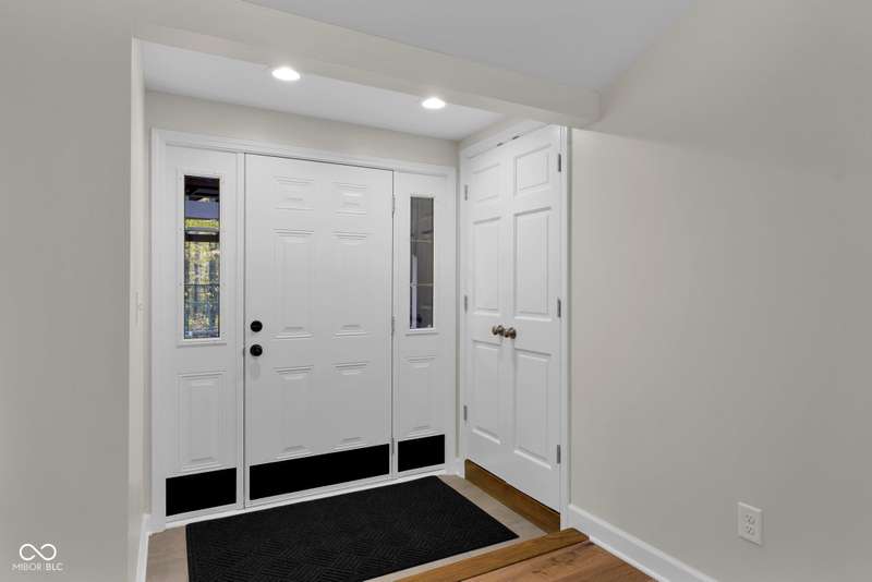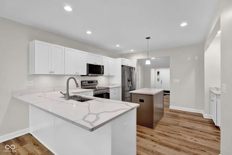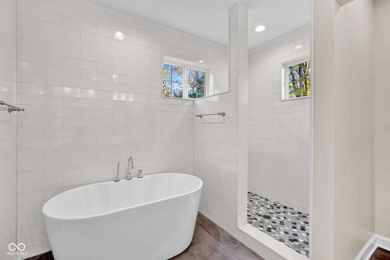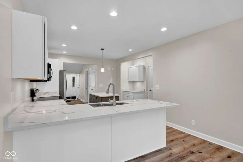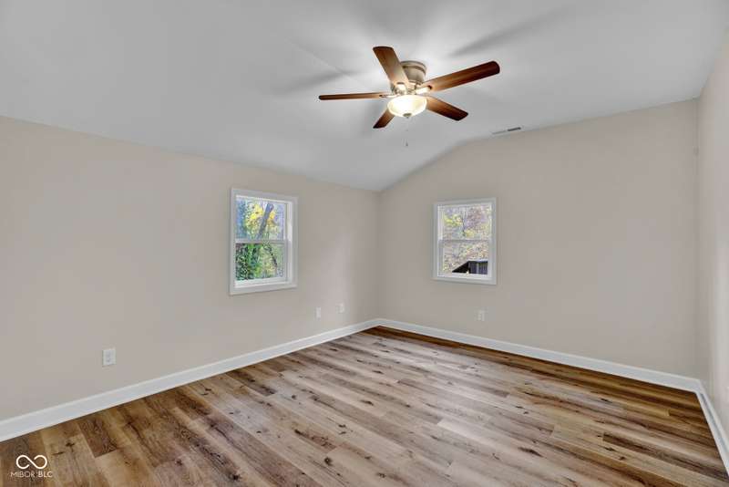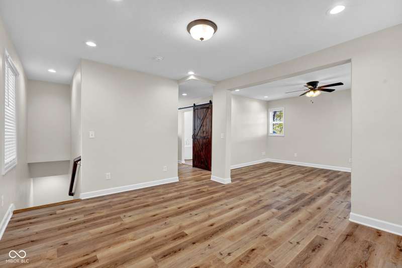 Fully renovated with Personality Plus! What a fun layout in this beautifully redone, versatile floor plan, country home on 1.75 acres of wooded privacy. Gleaming quartz countertops and appliances greet you in the spacious eat-in kitchen, with an island, pantry and breakfast bar too. Main level has a large living room that opens to the back deck, two bedrooms, a den/office with closet and seated bay window, nook by the half BA perfect for school work or a million other interests, plus laundry room/mud room by the full BA with its own separate entrance and side deck. New, new, new nearly everything: roof, septic system, HVAC, plumbing, electrical, insulation, drywall, floor joists, water heater, doors, kitchen, bathrooms, luxury vinyl plank flooring, lighting, fans, etc, etc. The entire upper level is a lovely primary suite that almost "feels like a treehouse", with windows in every direction, new blinds, a large sitting room, enormous walk-in closet, fun barn doors, double sinks, roomy walk-in shower and fantastic tub! Lots of lighting and tons of closet space. Oversized 2c garage with work area and separate room (clean room for woodworkers?). Gobs of parking, including space for a boat, trailer, or motorhome. Large covered standalone patio perfect for parties or enjoying the front yard. City water. High speed fiber available. Monroe-Gregg schools.