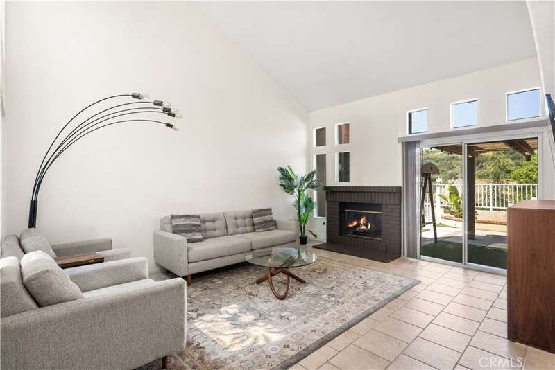 -Open-concept living with vaulted ceilings & fireplace