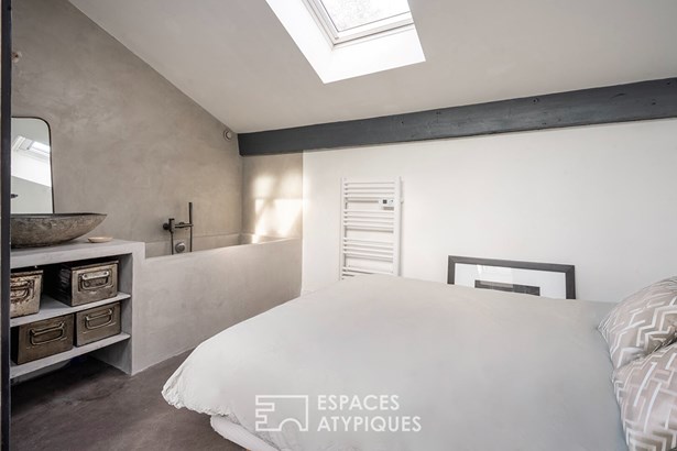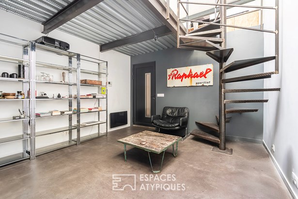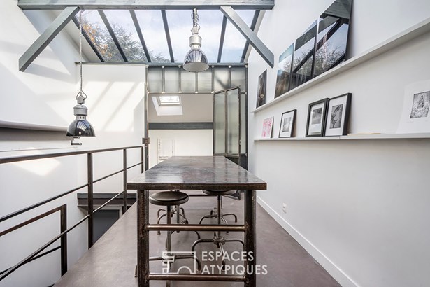 A custom-made metal staircase leads to the mezzanine. The true heart of the loft, this space benefits from natural light thanks to the skylight. This area is the ideal place to work or entertain. Continuing on, a discreet bedroom with an en-suite shower room is completely secluded thanks to an elegant, handcrafted workshop door, blending privacy with industrial style.